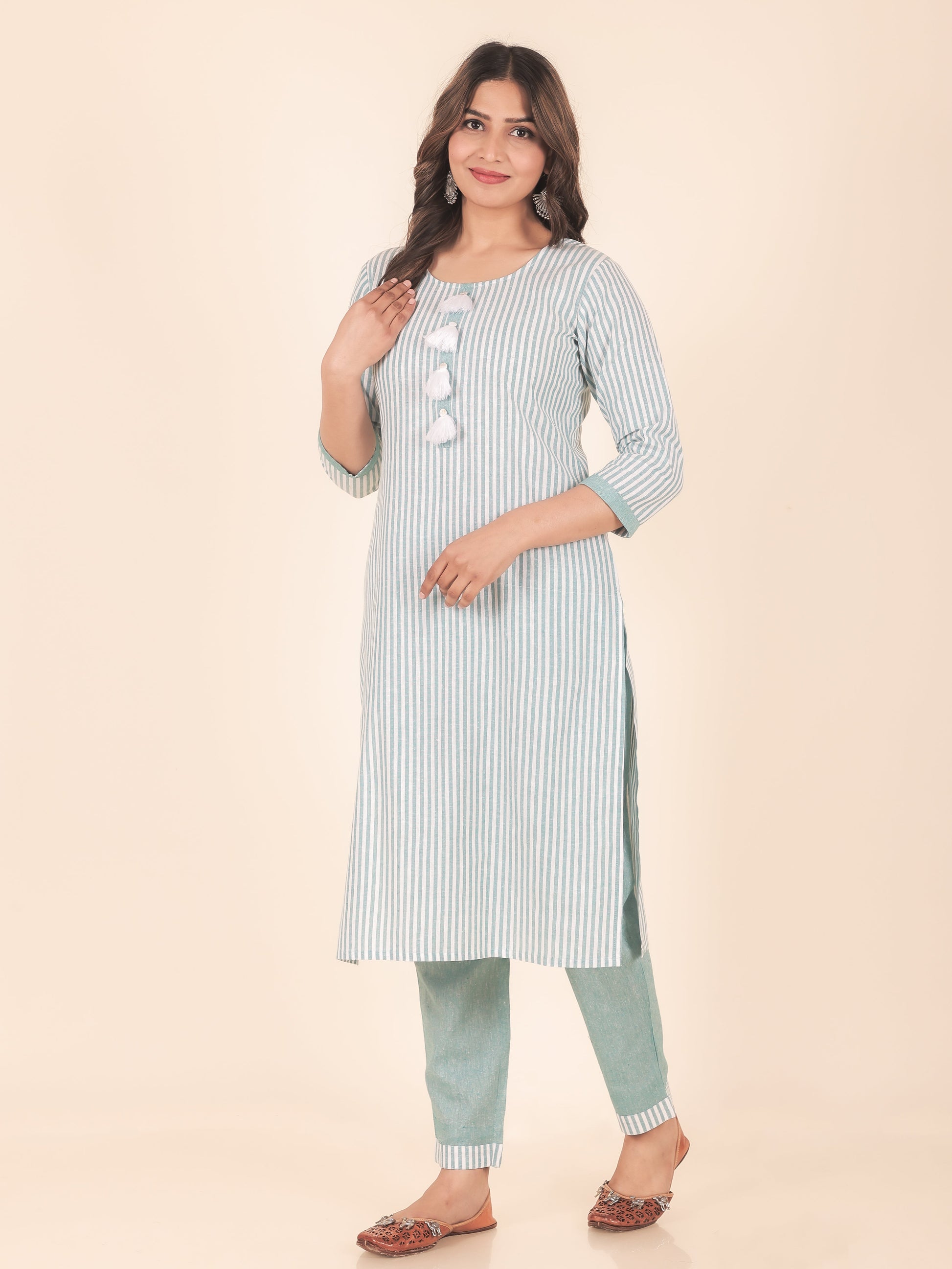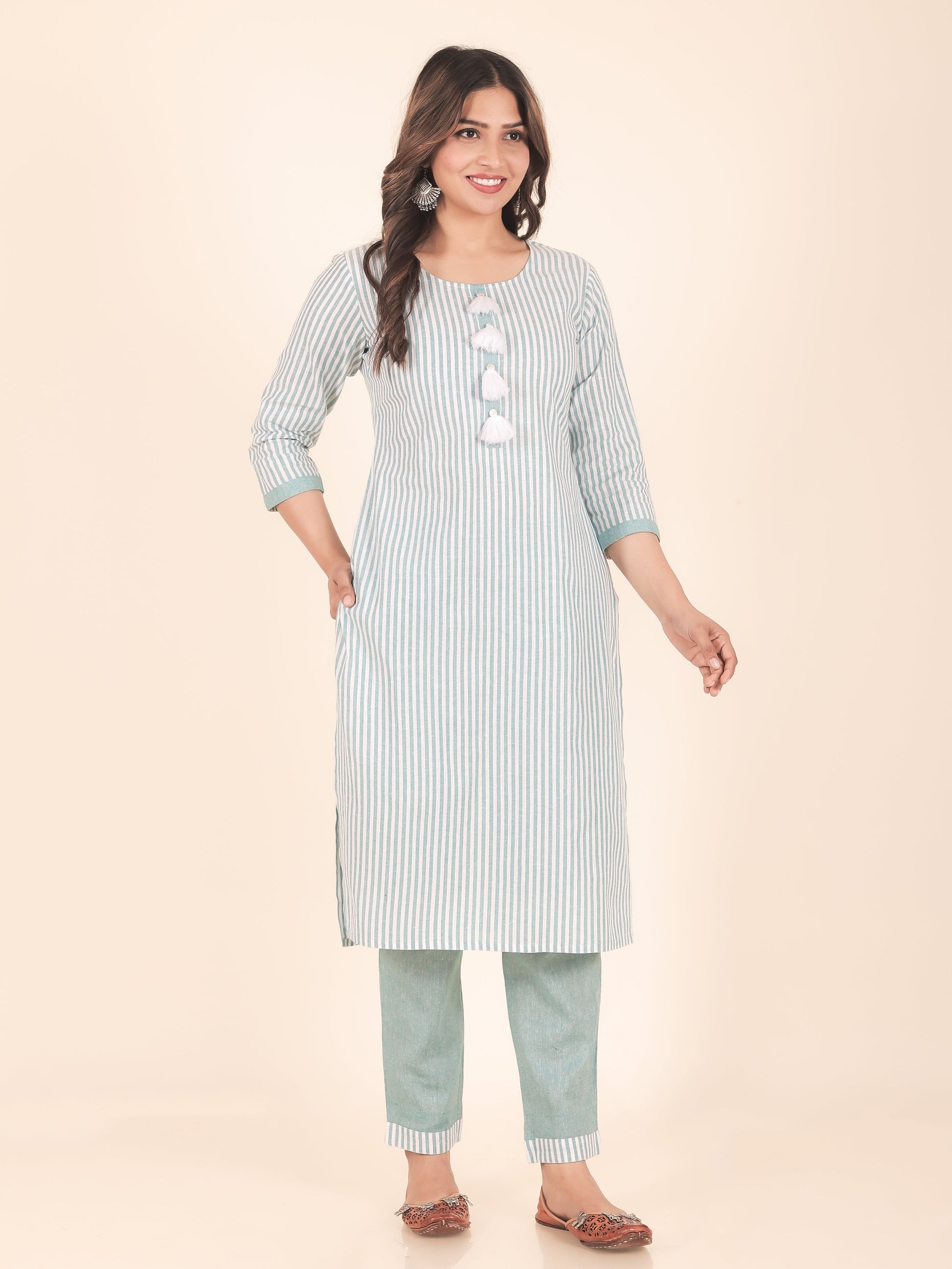Crafted from breathable Blend Cotton, this Straight kurta in Blue blends traditional design with everyday comfort. The Woven Design finish adds artisanal charm, while the Calf Length silhouette ensures effortless elegance. Style with palazzos or leggings for versatile looks, from workdays to weekend outings. Designed for easy care, this kurta stays beautiful with simple care instructions.