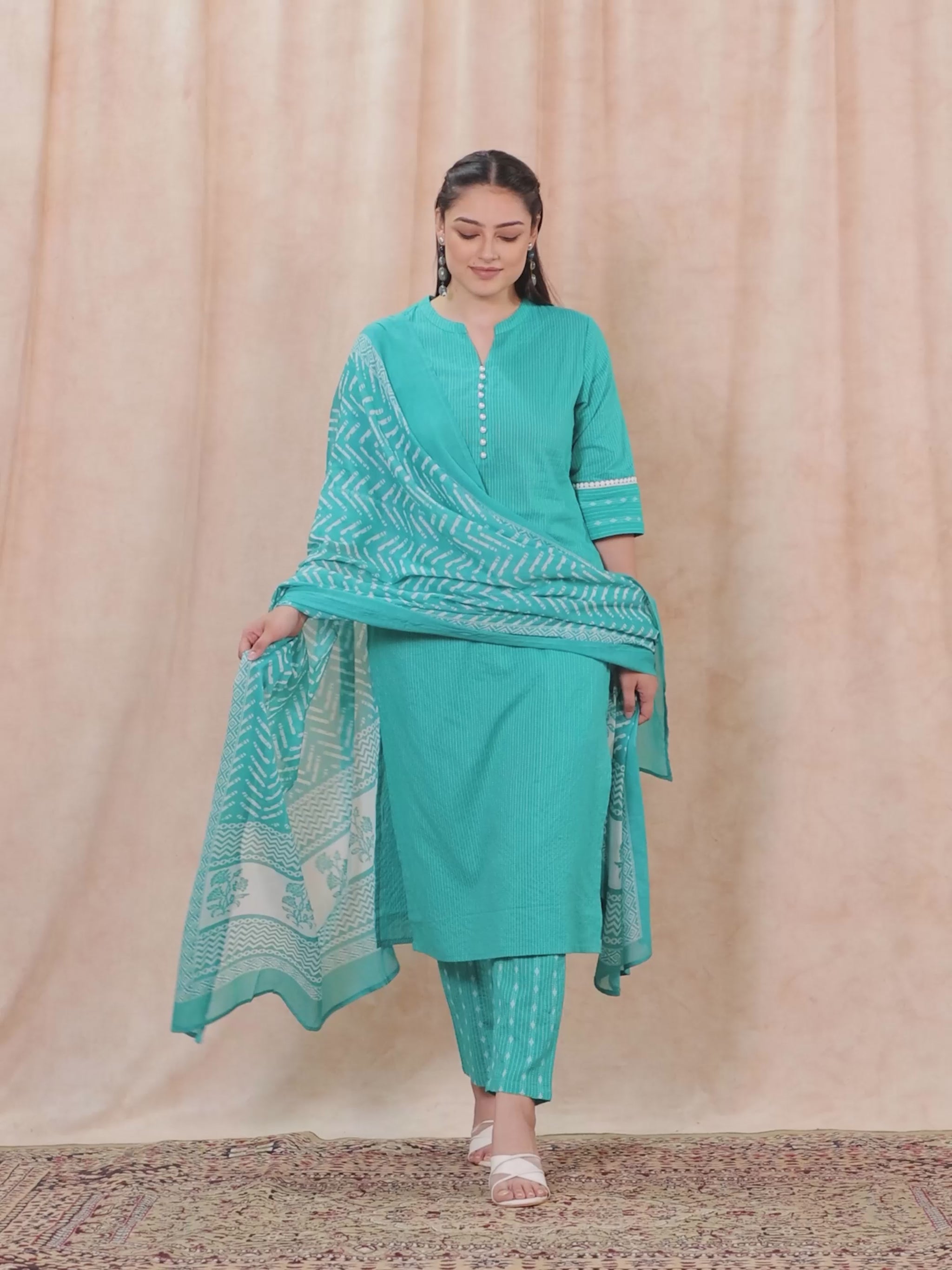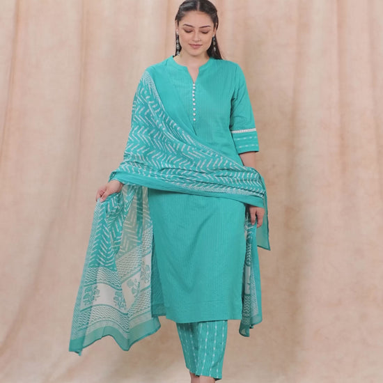 Elevate your ethnic wardrobe with this Kantha Cotton kurta in a stunning Turquoise hue. Featuring an elegant Straight fit and striking Woven Design accents, it’s perfect for festive celebrations or family gatherings. The Mandarin/Chinese neckline and 3/4 Sleeve provide all-day comfort. Team with gold-toned accessories for an effortlessly chic vibe. Maintain its charm by following proper care instructions.