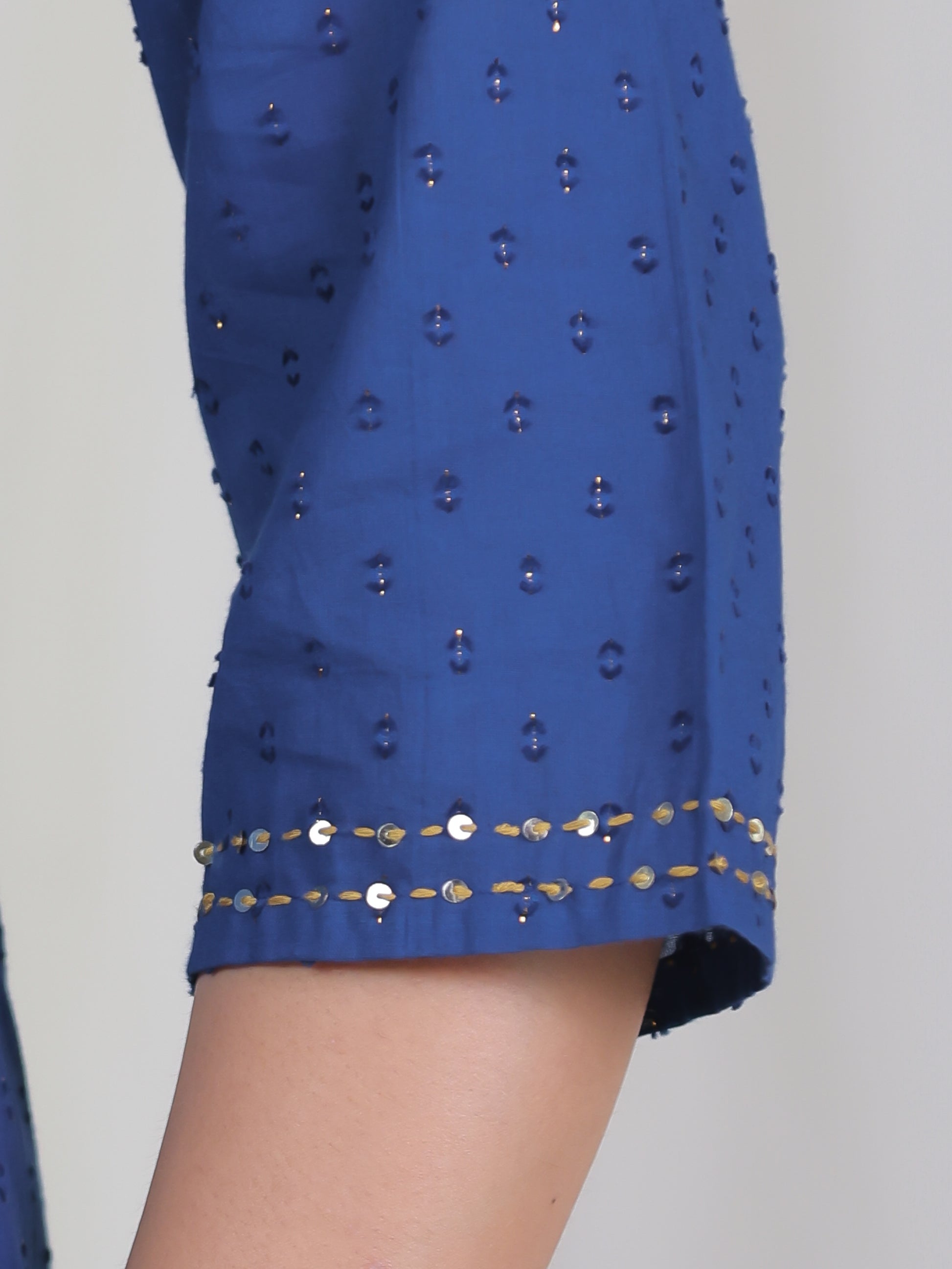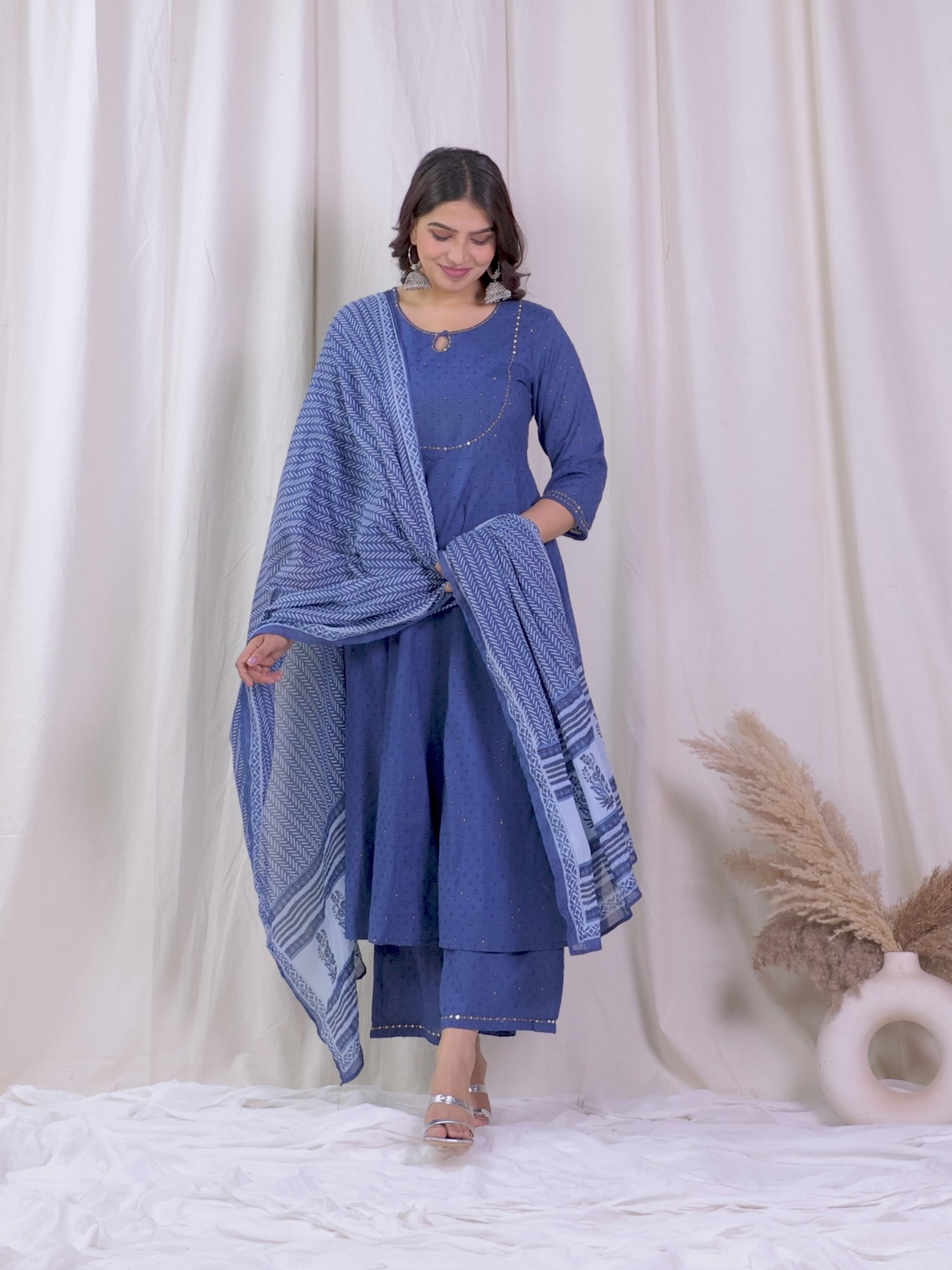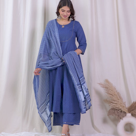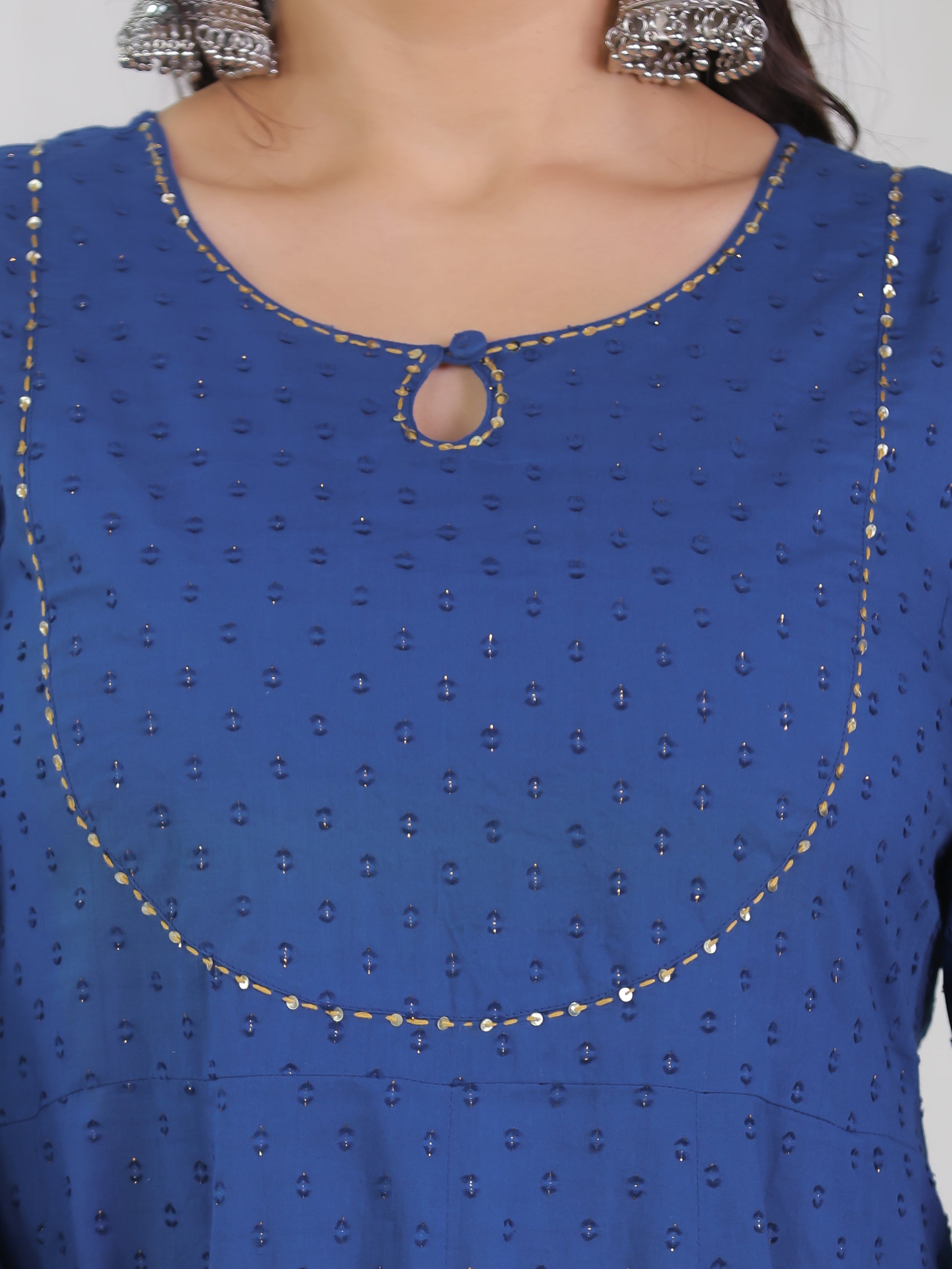 Embroidered Textured Cotton Woven Design Anarkali Indigo blue Kurta