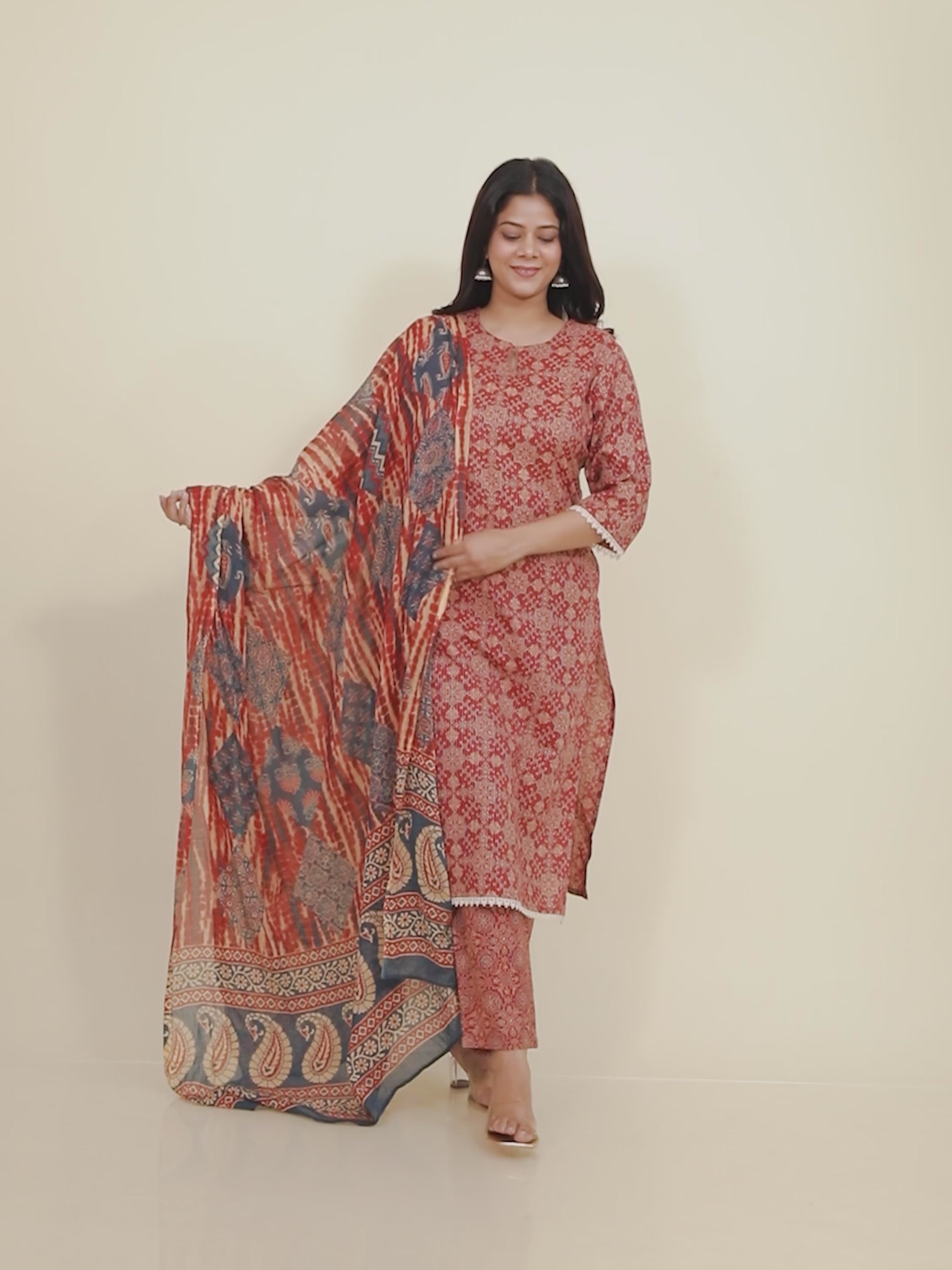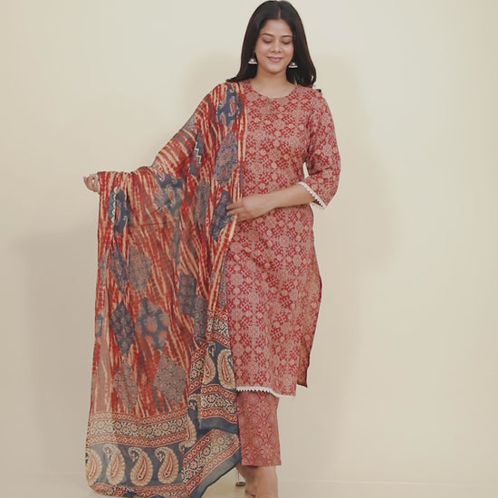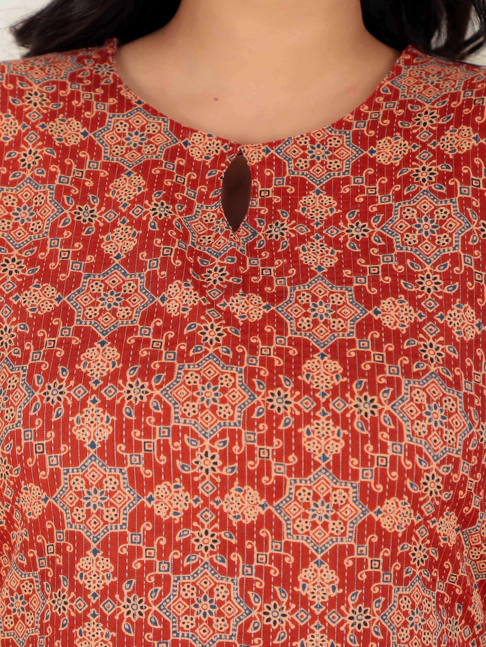 Kantha Cotton Ajrakh Straight Rust Kurta