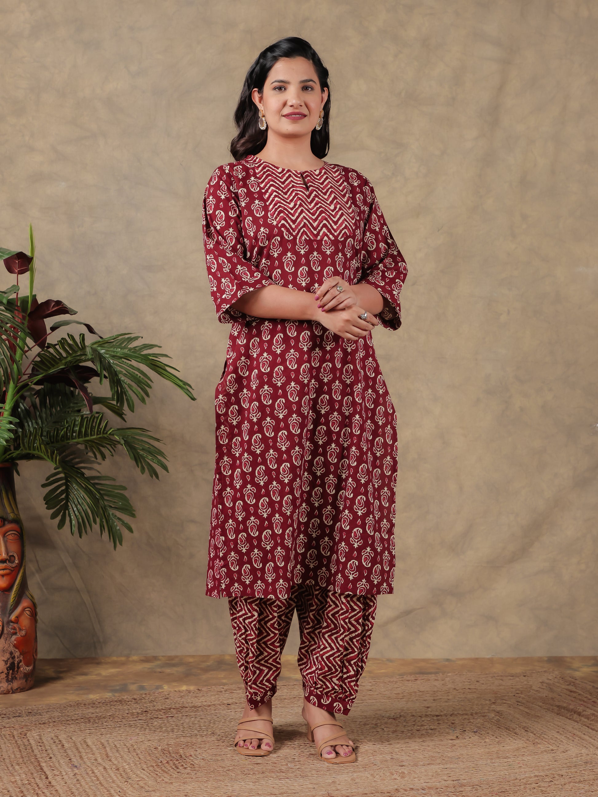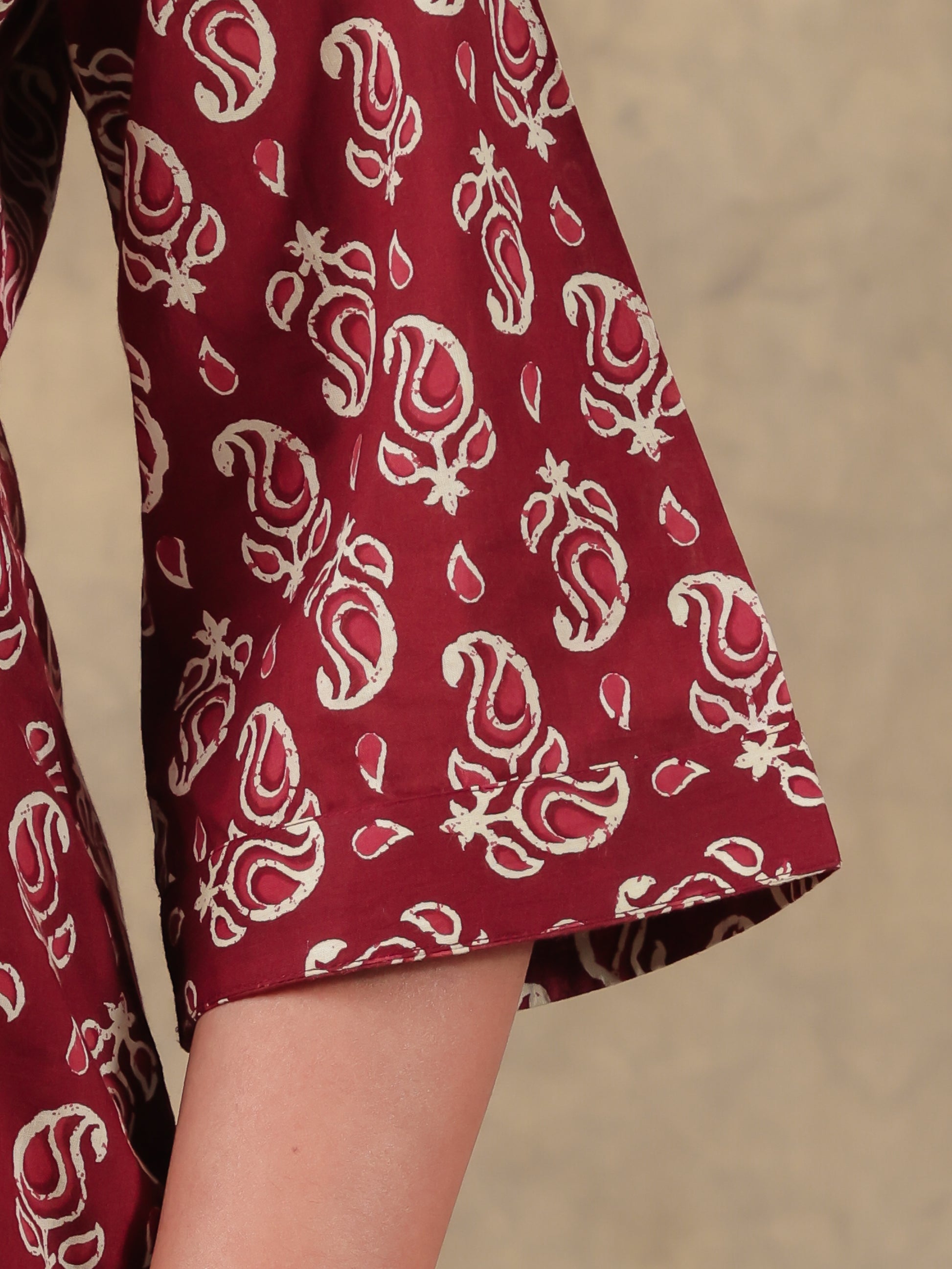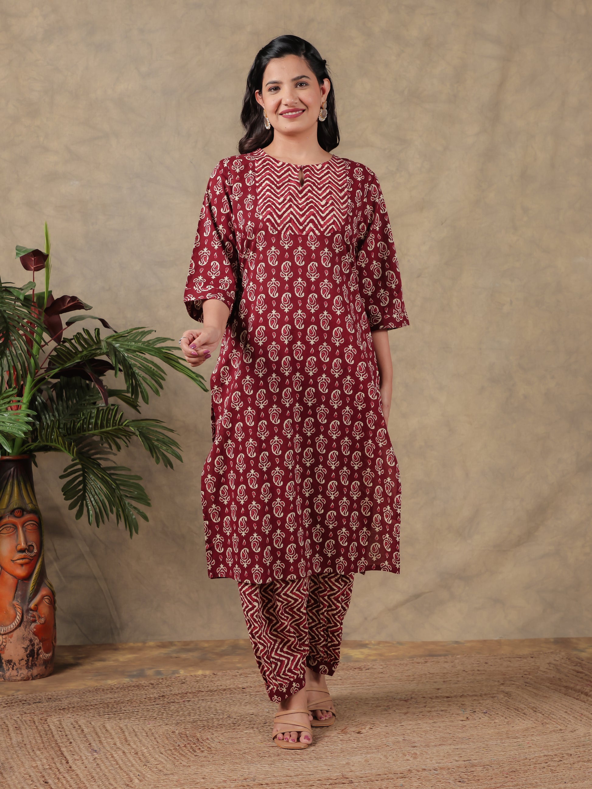 Embroidered Soft Cotton Block Print Straight Maroon Kurta