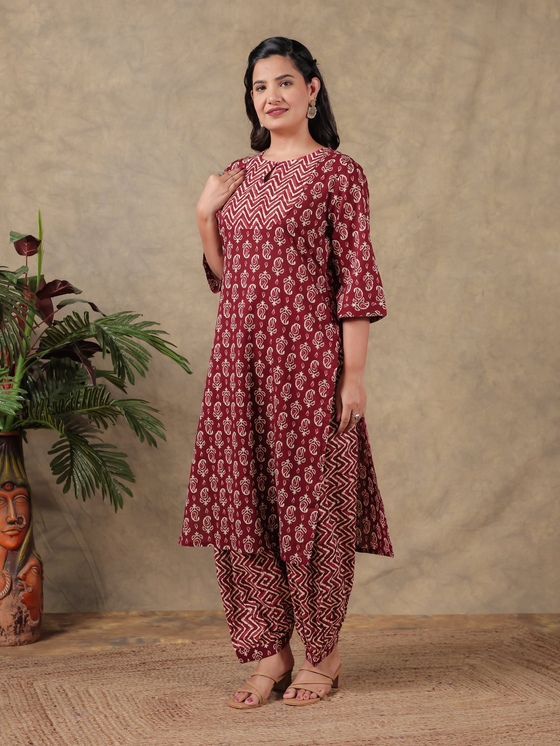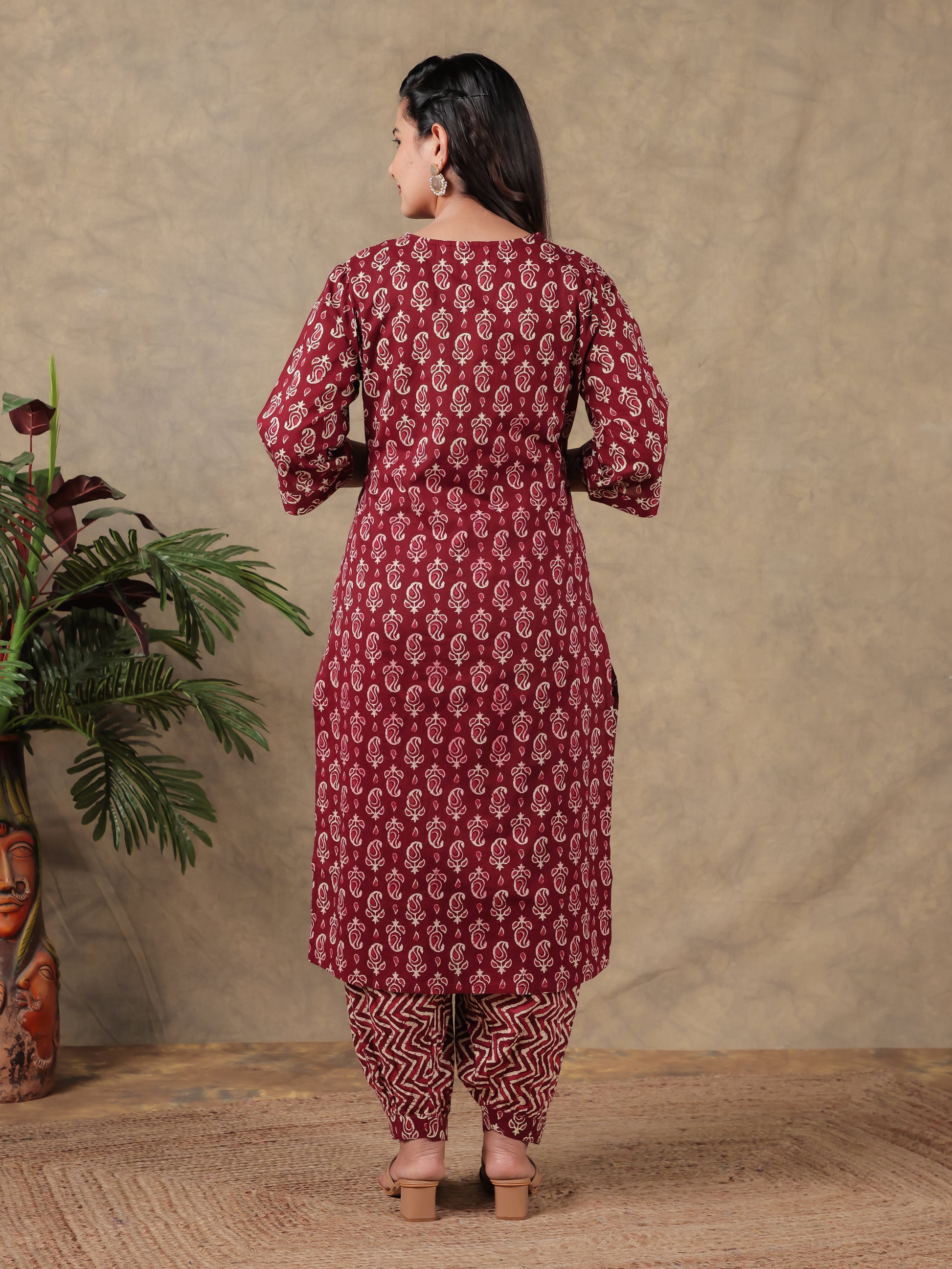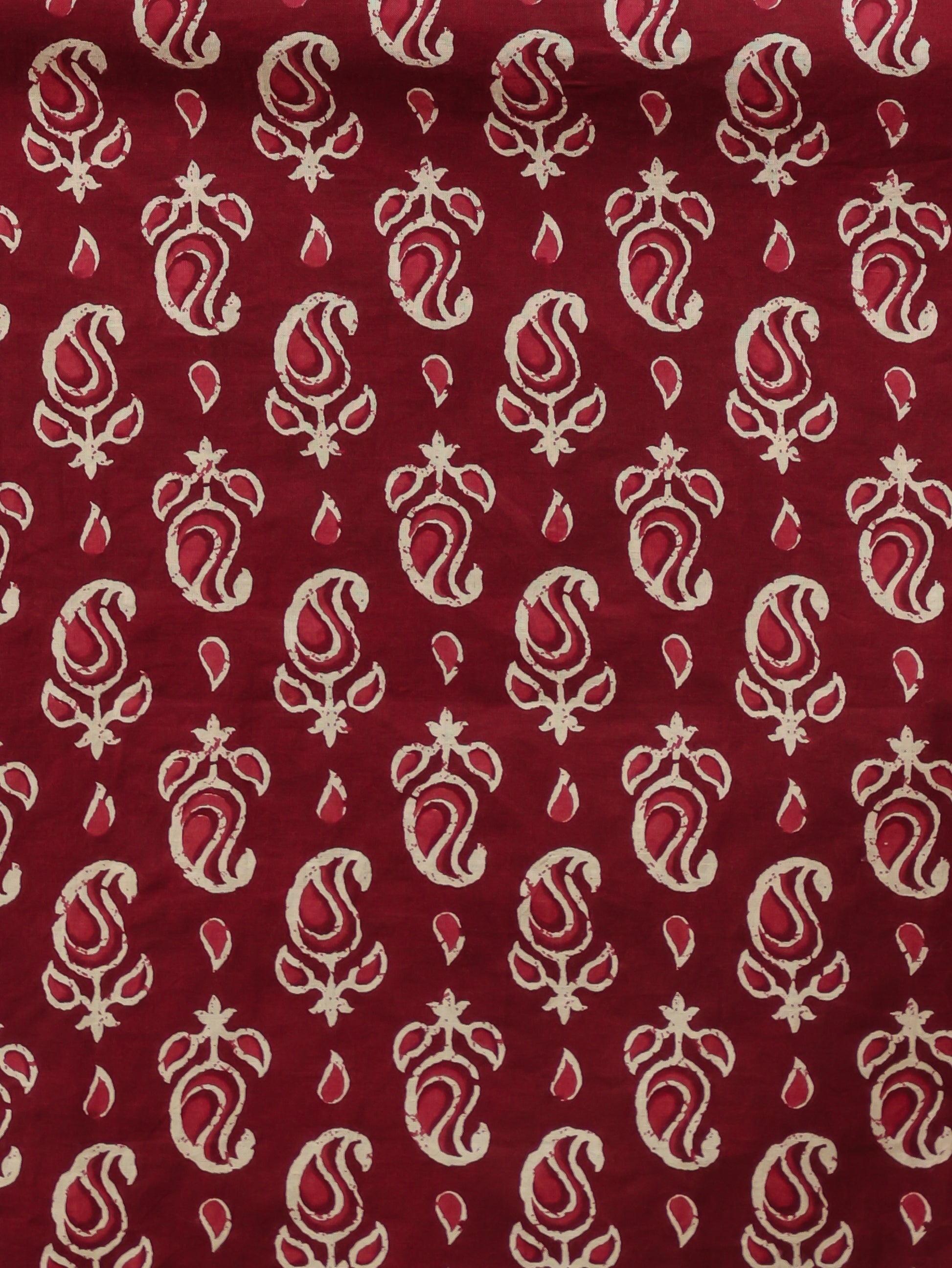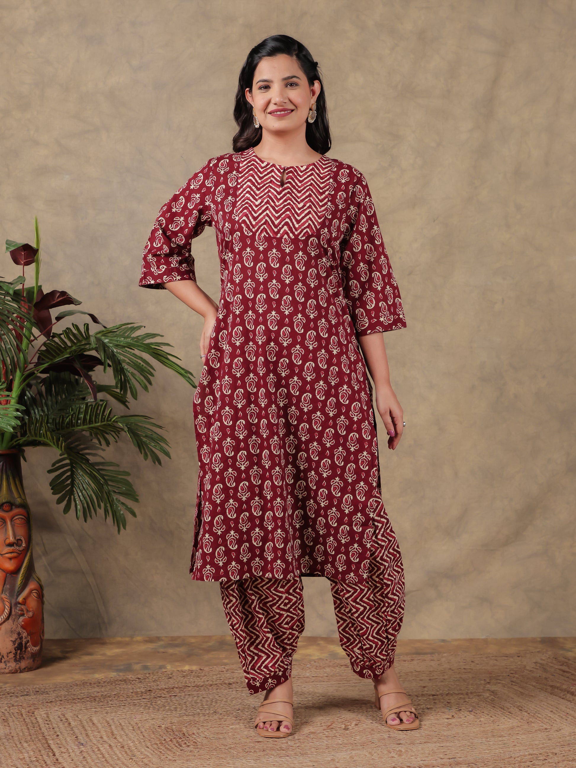 Embroidered Soft Cotton Block Print Straight Maroon Kurta