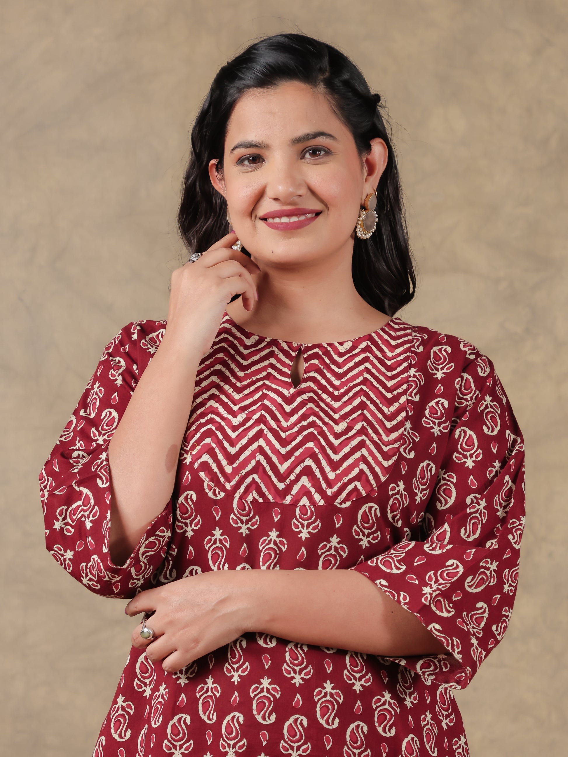 Elevate your ethnic wardrobe with this Soft Cotton kurta in a stunning Maroon hue. Featuring an elegant Straight fit and striking Block accents, it’s perfect for festive celebrations or family gatherings. The Keyhole neckline and 3/4 Sleeve provide all-day comfort. Team with gold-toned accessories for an effortlessly chic vibe. Maintain its charm by following proper care instructions.