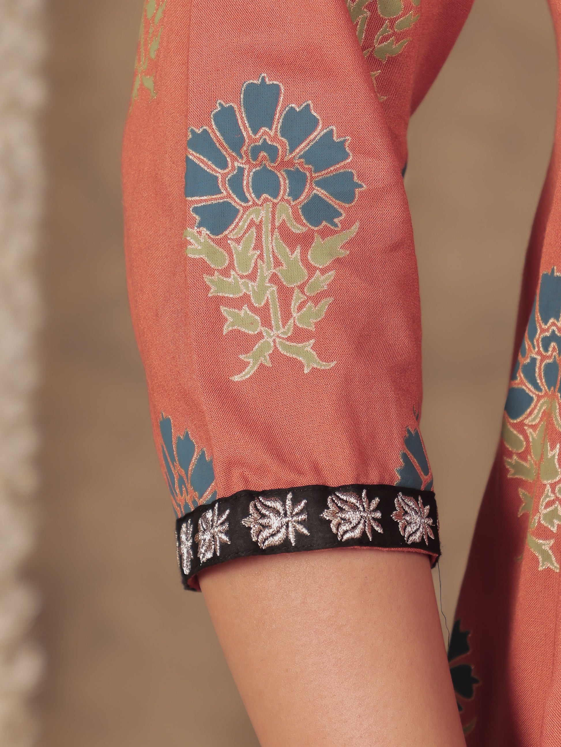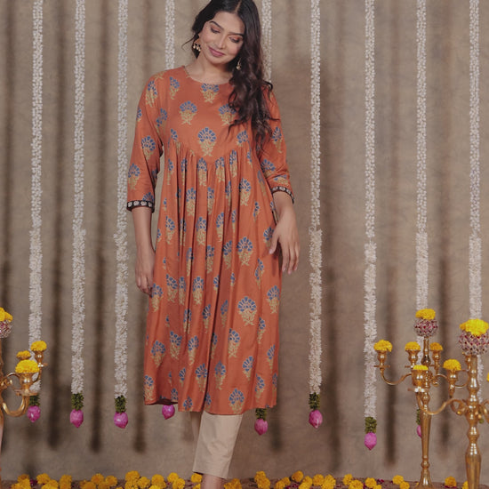 This Rust A-line kurta in soft Viscose is a timeless pick for festive and casual wear. Designed with a Round neckline and 3/4 Sleeve sleeves, its graceful Calf Length cut flatters all body types. The delicate Butti detailing adds a touch of sophistication. Pair it with statement earrings and juttis for a polished look. Maintain its pristine look by following proper care instructions.