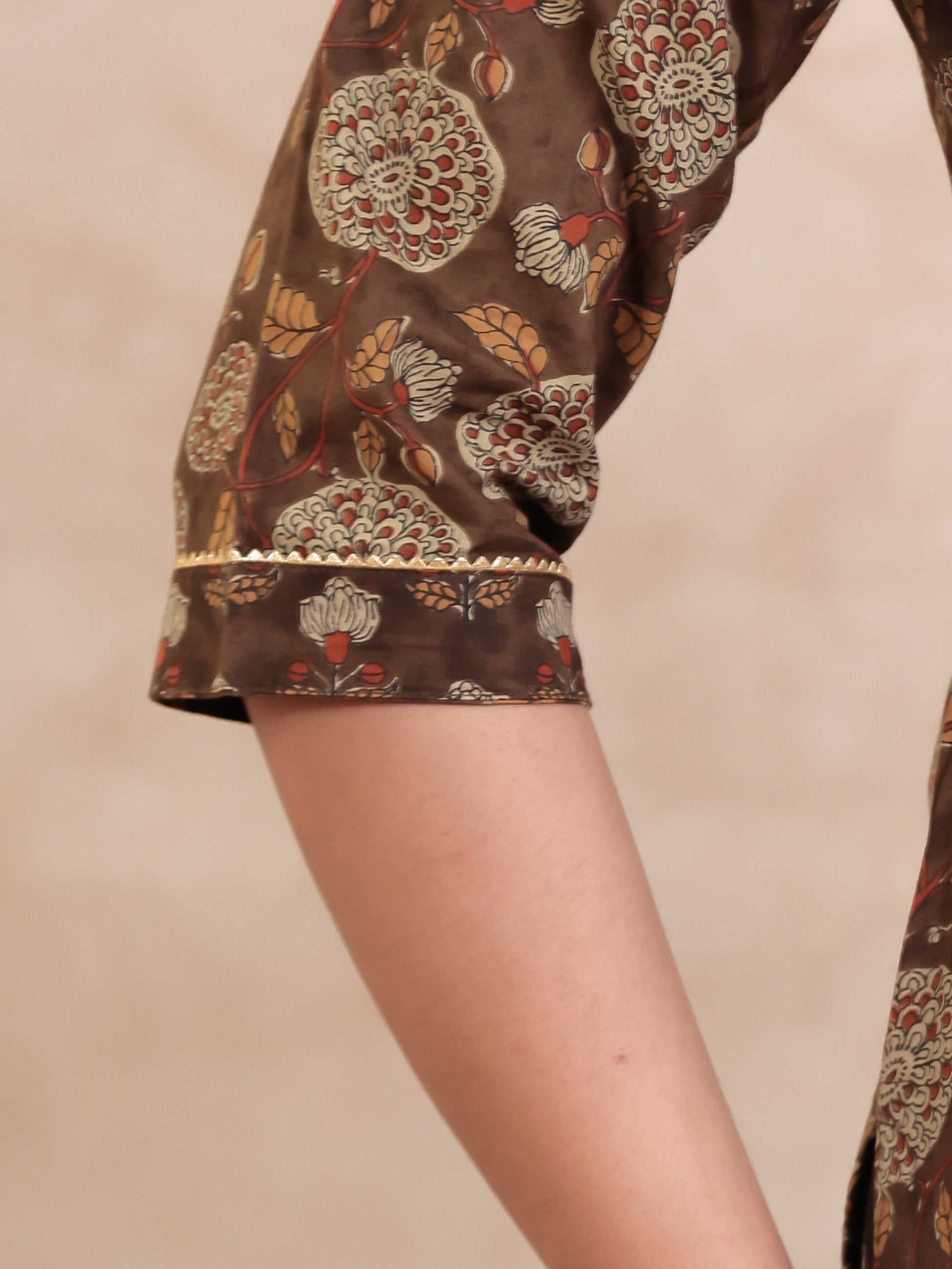 Elevate your ethnic wardrobe with this Soft Cotton kurta in a stunning Brown hue. Featuring an elegant Straight fit and striking Floral accents, it’s perfect for festive celebrations or family gatherings. The Round neckline and 3/4 Sleeve provide all-day comfort. Team with gold-toned accessories for an effortlessly chic vibe. Maintain its charm by following proper care instructions.