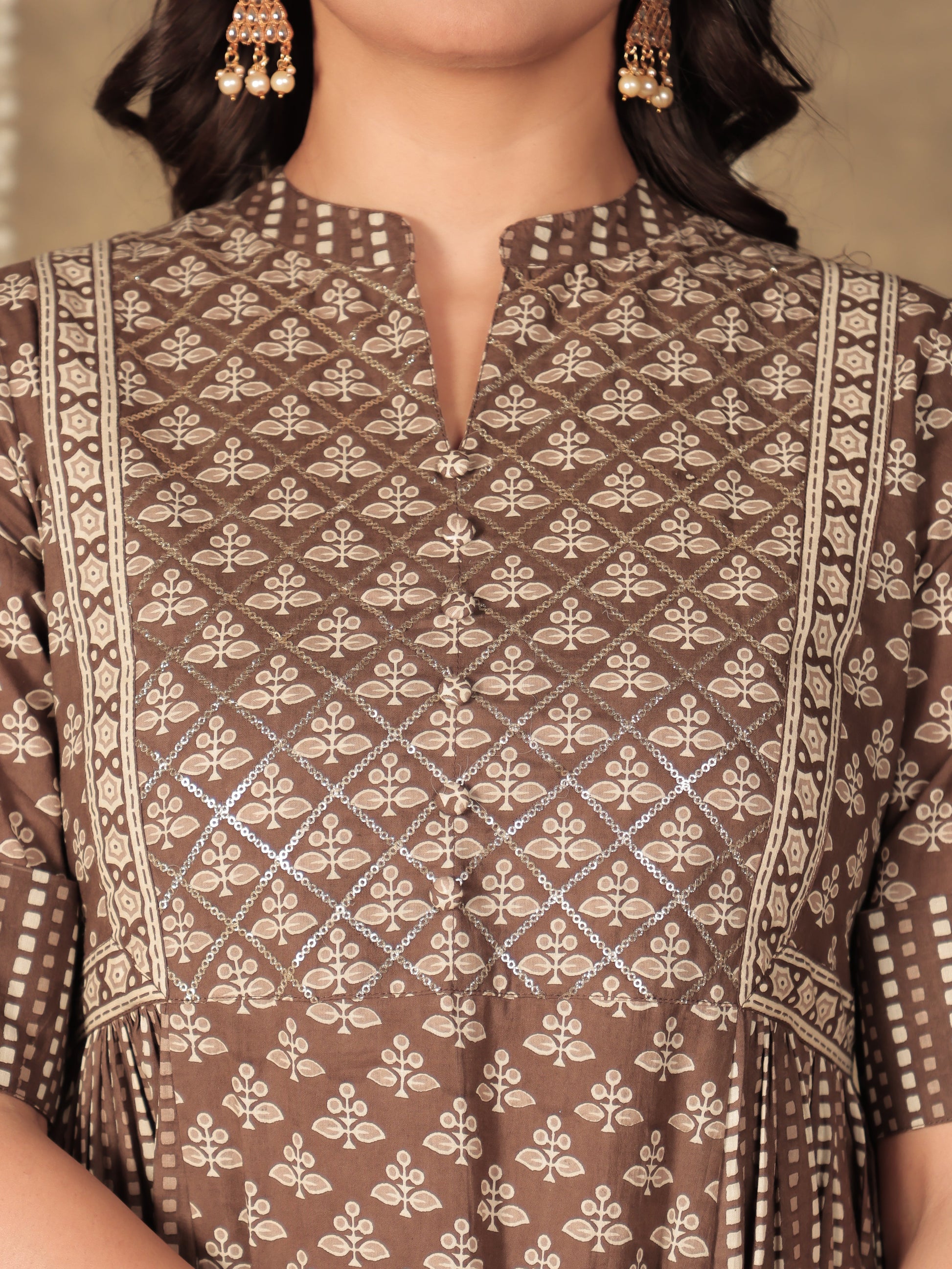 This Brown Soft Cotton kurta with a Panelled flare is designed for comfort and style. Featuring a Mandarin/Chinese neckline, Short Sleeve sleeves, and a graceful Calf Length hemline, it’s perfect for festive wear or semi-formal gatherings. The Floral highlights add depth and texture, making it a standout piece. Accessorise with a contrasting dupatta and keep it pristine by following proper care instructions.