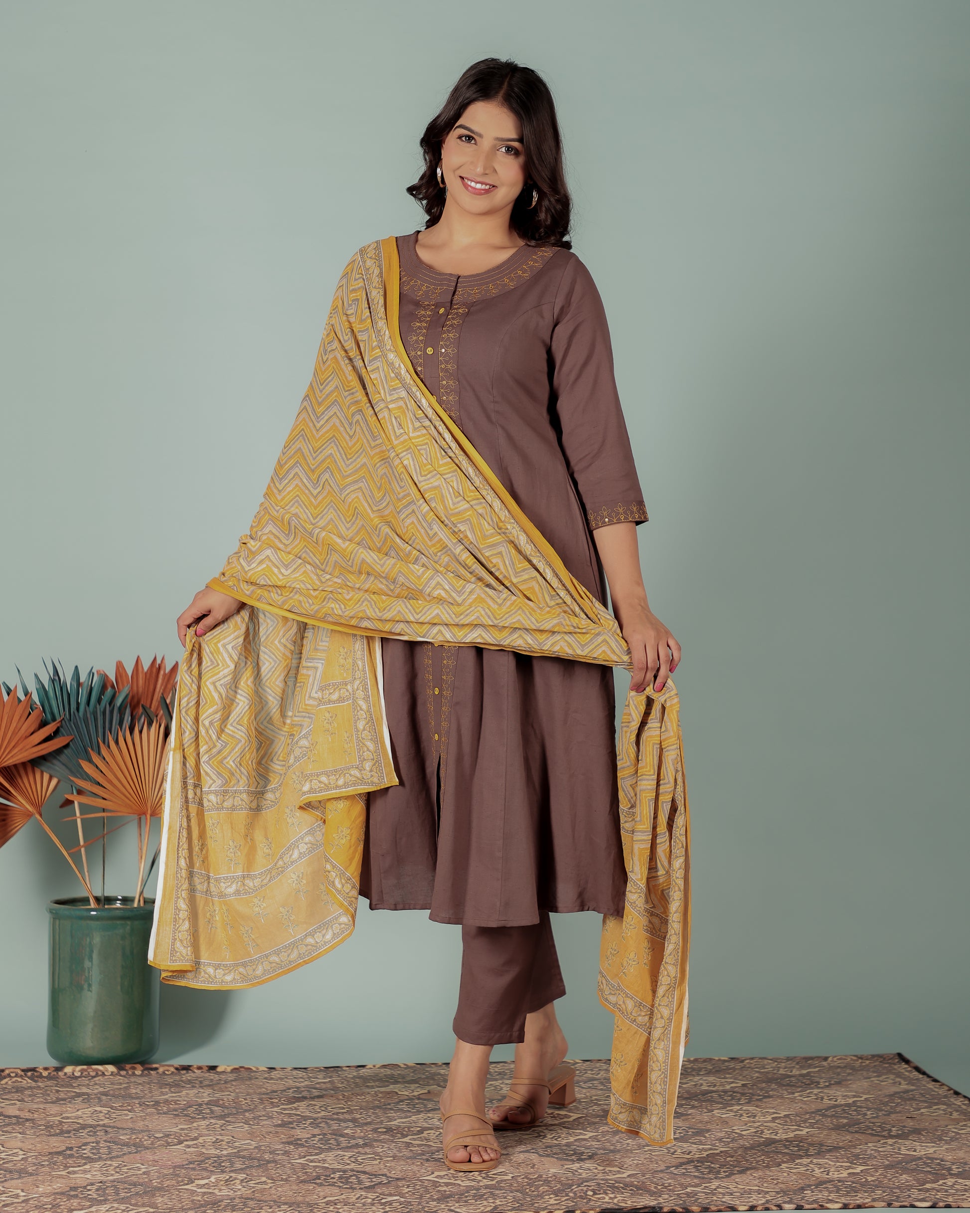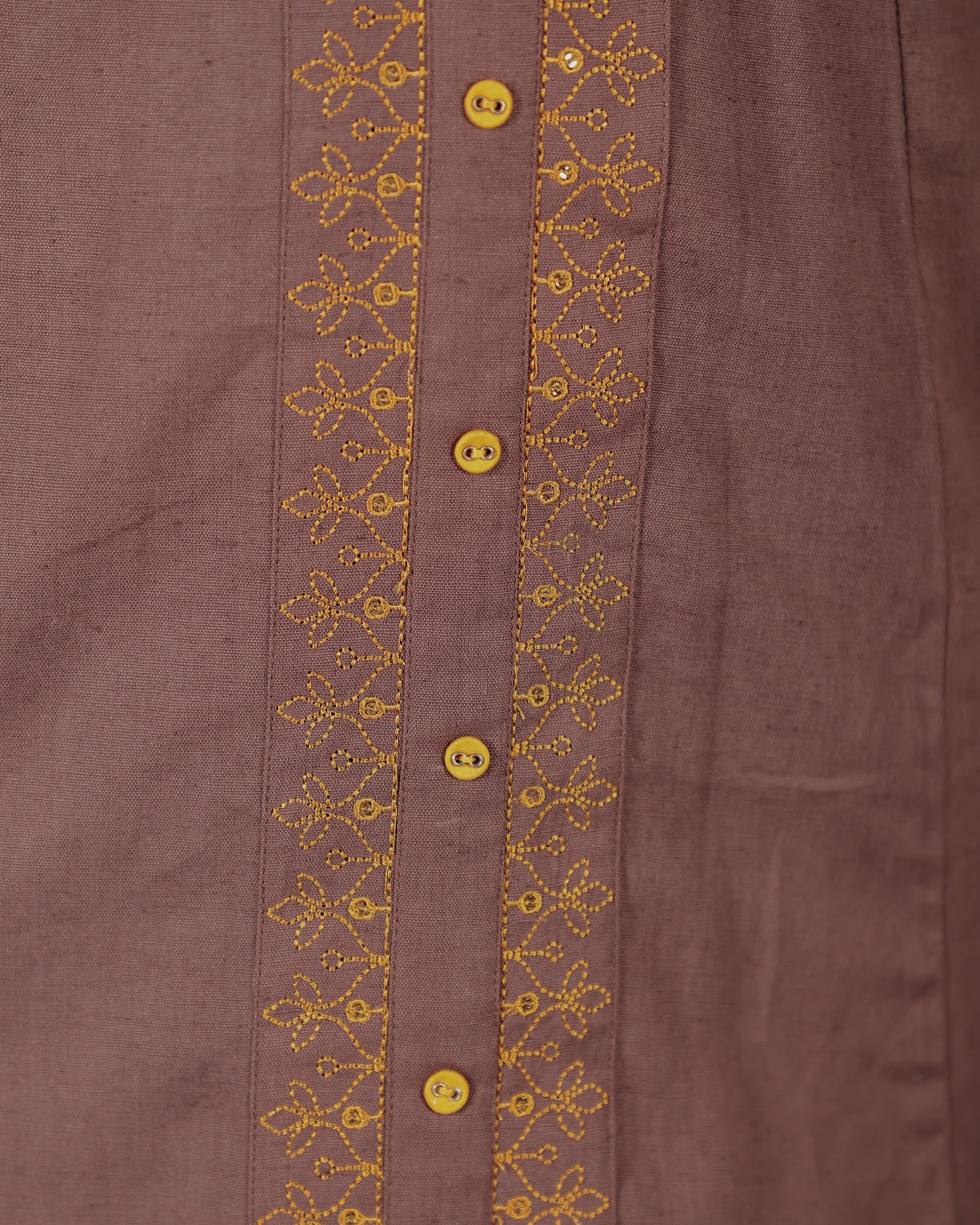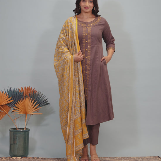 This Brown Linen Cotton kurta with a A-line flare is designed for comfort and style. Featuring a Round neckline, 3/4 Sleeve sleeves, and a graceful Calf Length hemline, it’s perfect for festive wear or semi-formal gatherings. The Solid highlights add depth and texture, making it a standout piece. Accessorise with a contrasting dupatta and keep it pristine by following proper care instructions.