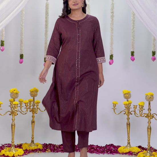 This Brown A-line kurta in soft Lurex Cotton is a timeless pick for festive and casual wear. Designed with a Round neckline and 3/4 Sleeve sleeves, its graceful Calf Length cut flatters all body types. The delicate Solid detailing adds a touch of sophistication. Pair it with statement earrings and juttis for a polished look. Maintain its pristine look by following proper care instructions.