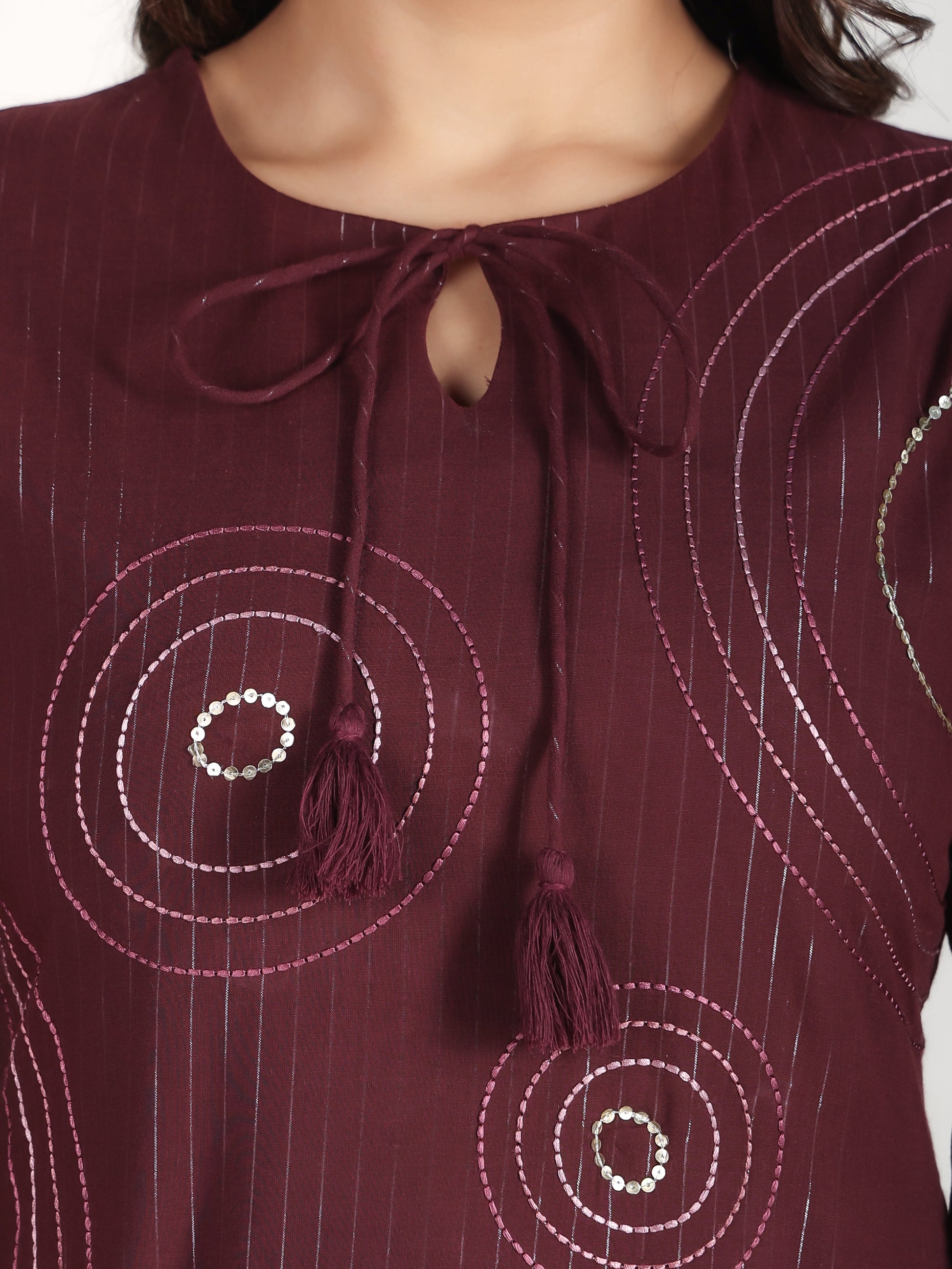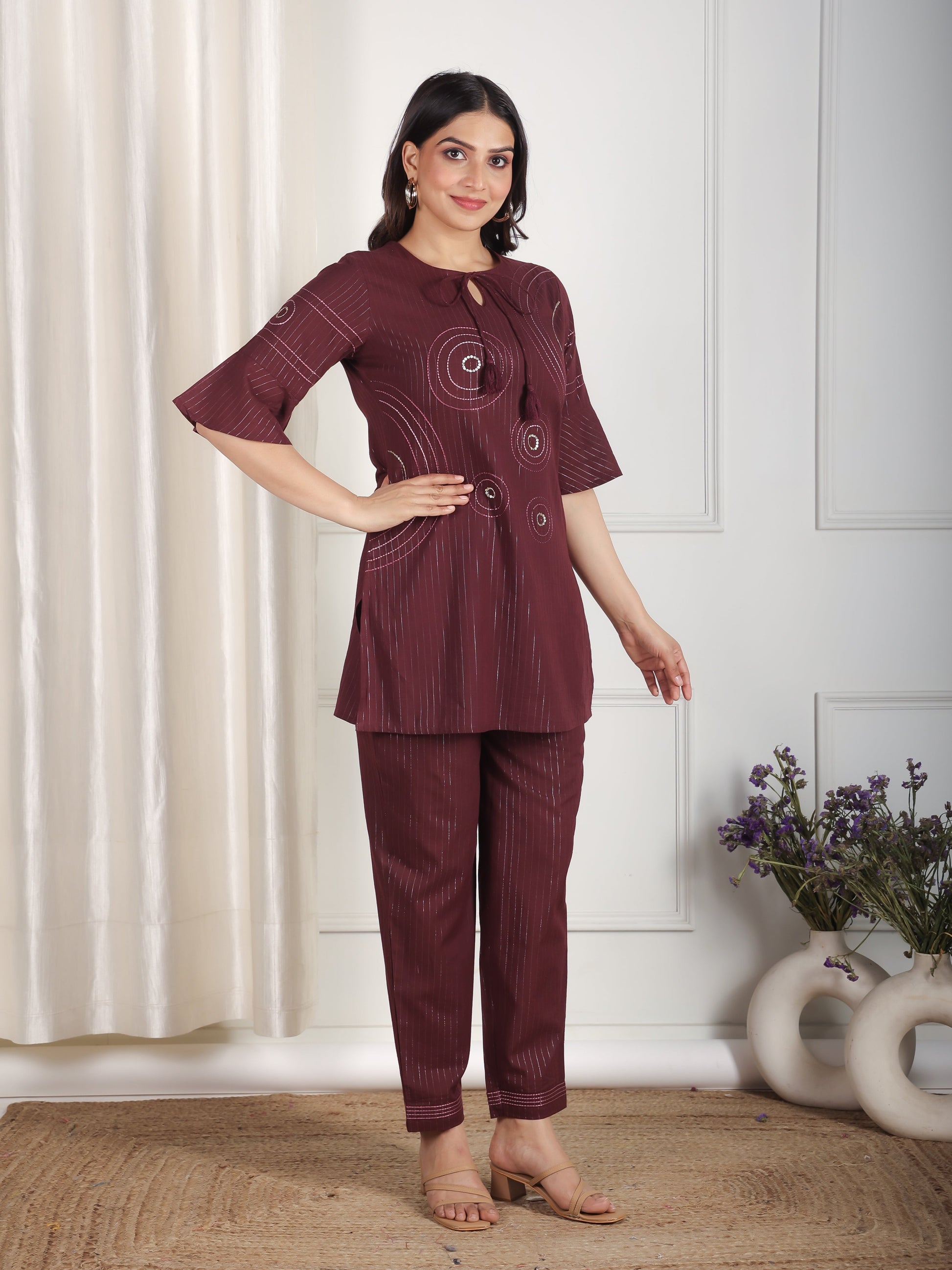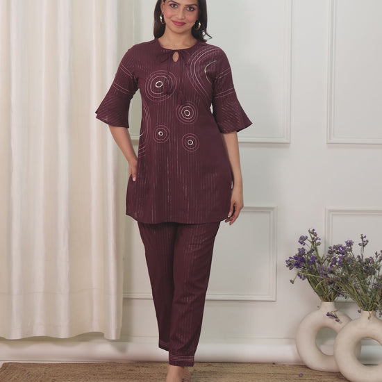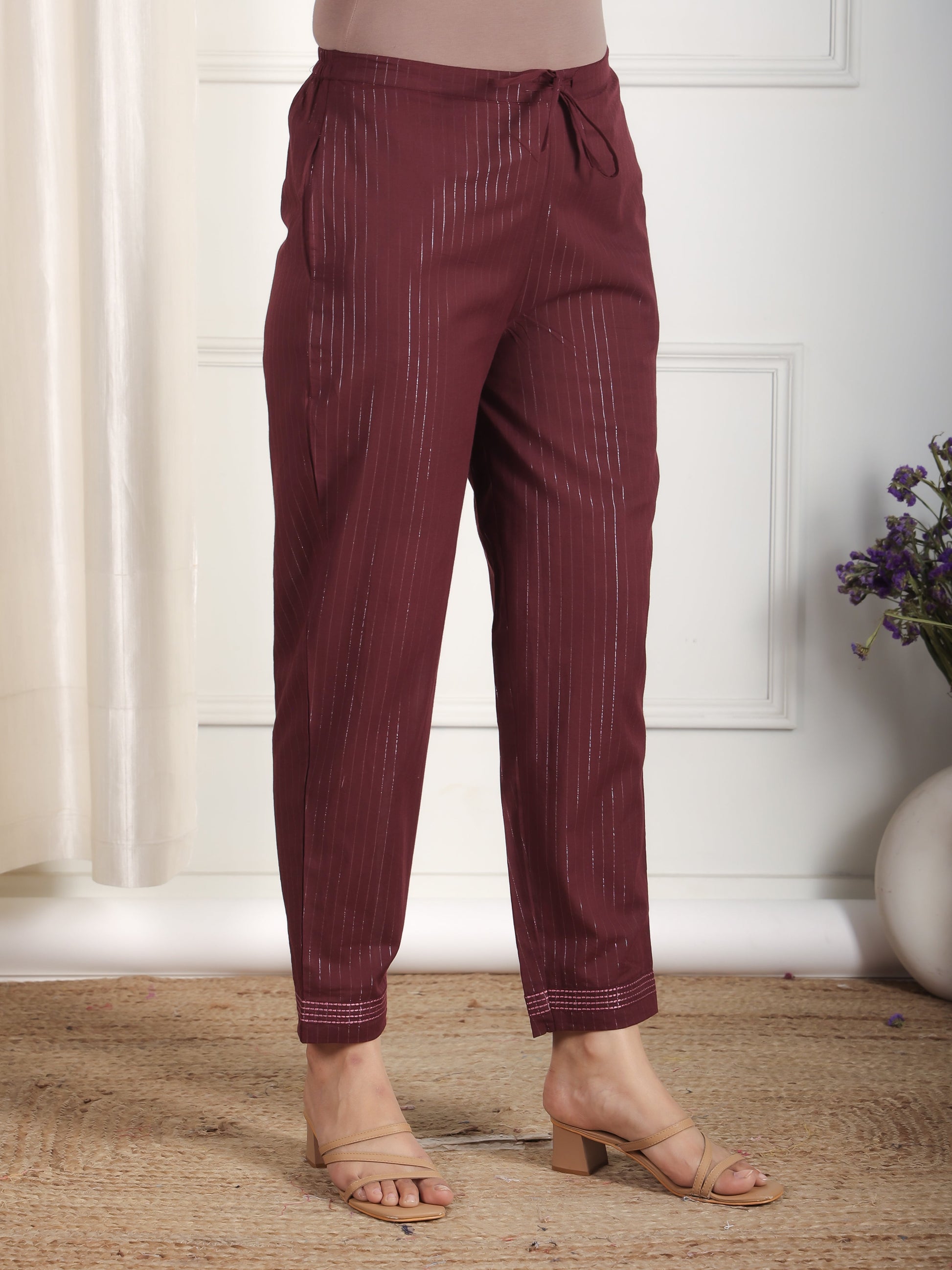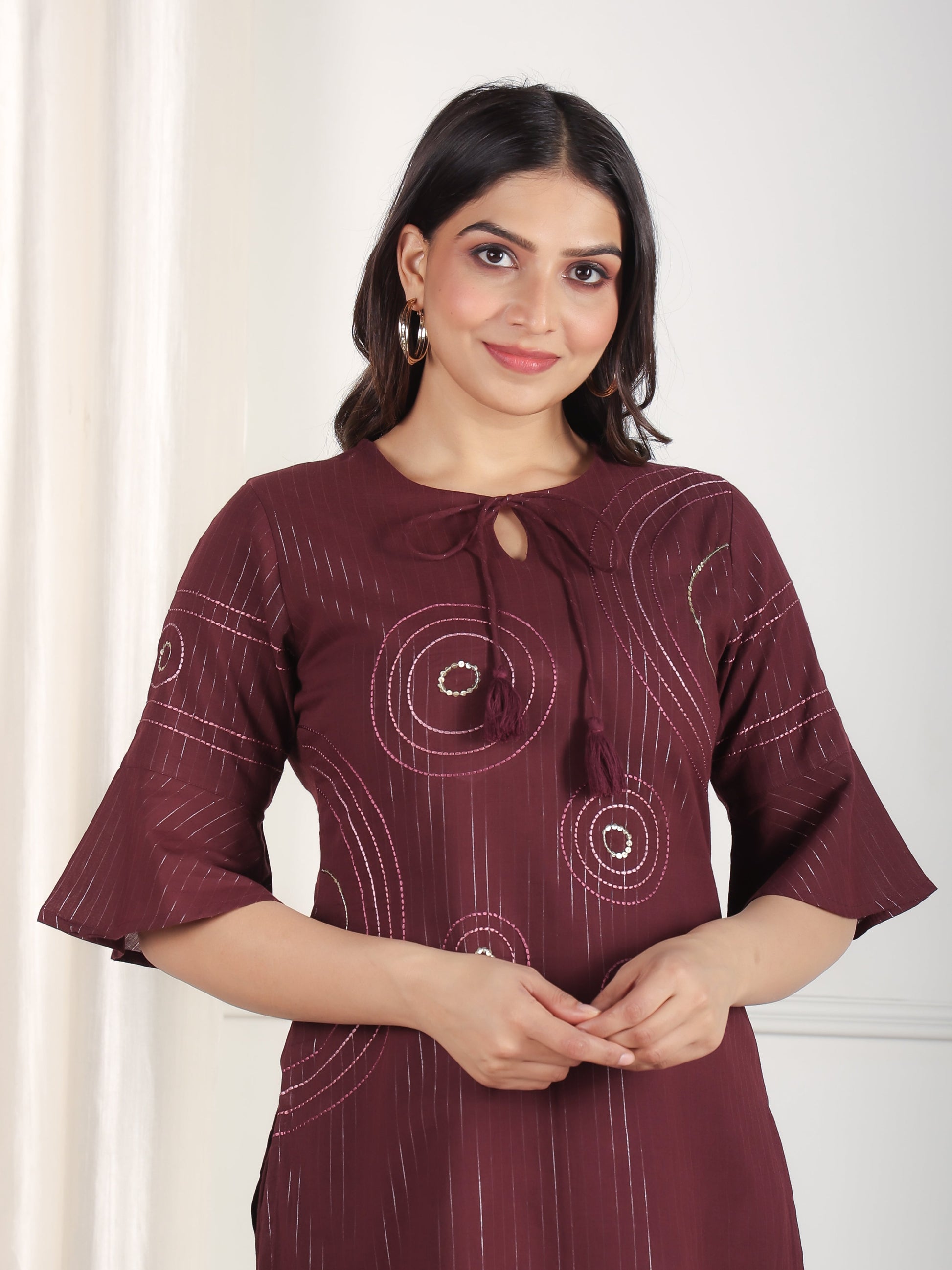 Elevate your ethnic wardrobe with this Lurex Cotton kurta in a stunning Brown hue. Featuring an elegant Straight fit and striking Solid accents, it’s perfect for festive celebrations or family gatherings. The Keyhole neckline and 3/4 Sleeve provide all-day comfort. Team with gold-toned accessories for an effortlessly chic vibe. Maintain its charm by following proper care instructions.