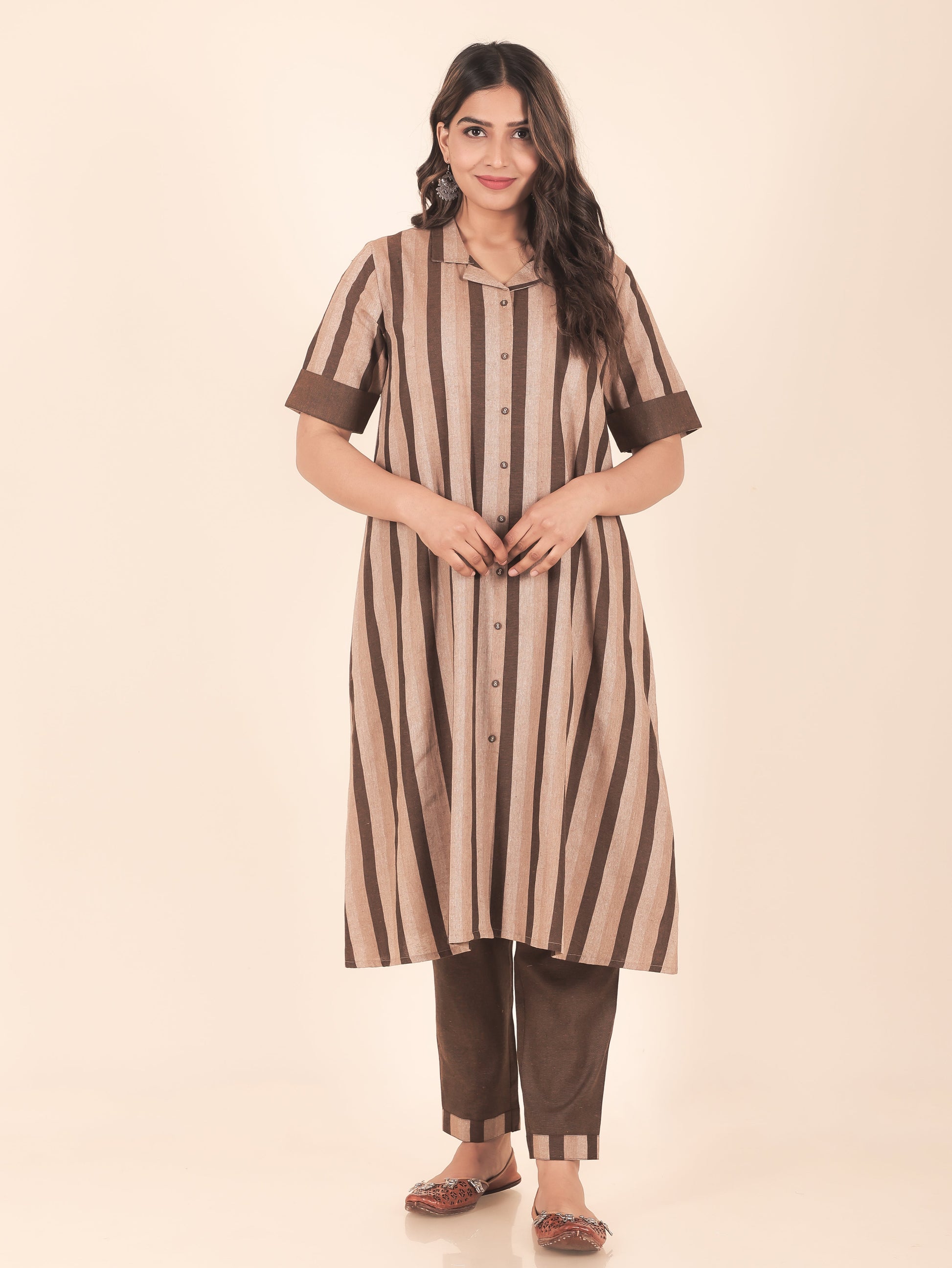 Elevate your ethnic wardrobe with this Blend Cotton kurta in a stunning Brown hue. Featuring an elegant A-line fit and striking Woven Design accents, it’s perfect for festive celebrations or family gatherings. The Collared neckline and Elbow Length Sleeve provide all-day comfort. Team with gold-toned accessories for an effortlessly chic vibe. Maintain its charm by following proper care instructions.