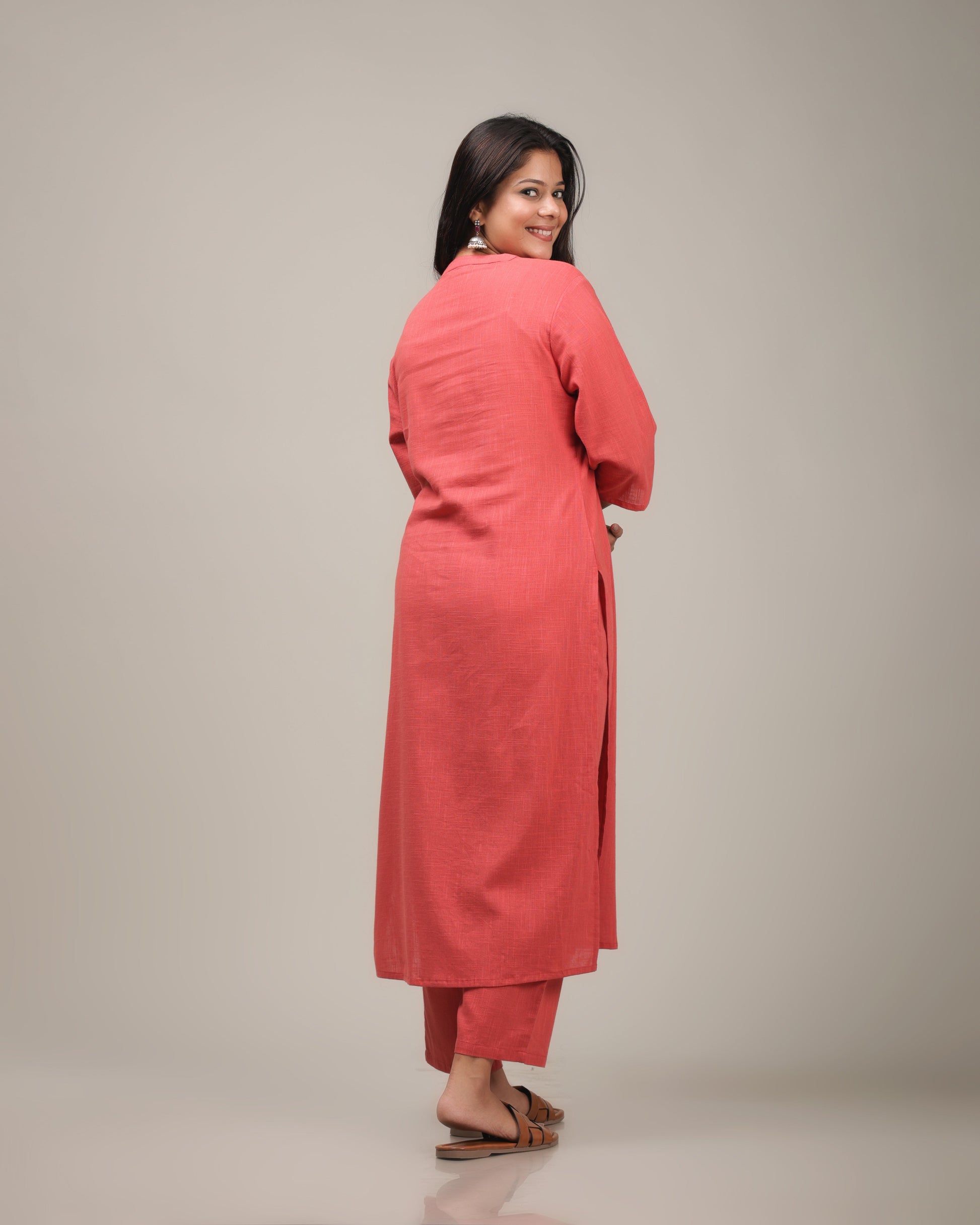 This Red Straight kurta in soft Khadi Cotton is a timeless pick for festive and casual wear. Designed with a Mandarin/Chinese neckline and 3/4 Sleeve sleeves, its graceful Calf Length cut flatters all body types. The delicate Solid detailing adds a touch of sophistication. Pair it with statement earrings and juttis for a polished look. Maintain its pristine look by following proper care instructions.