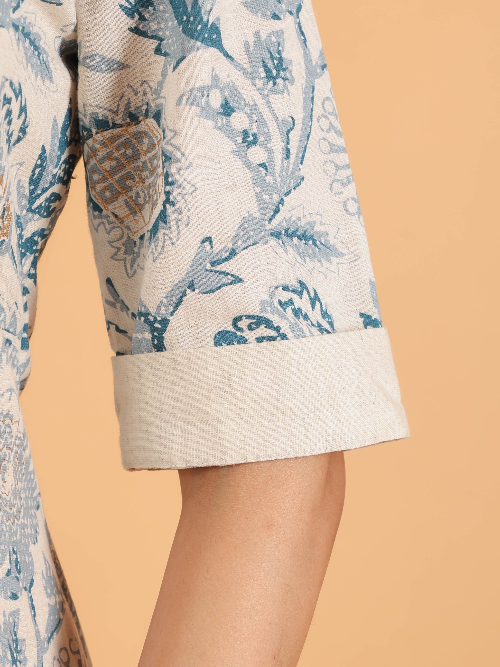 This Cream Pathani kurta in soft Linen Cotton is a timeless pick for festive and casual wear. Designed with a Collared neckline and Elbow Length Sleeve sleeves, its graceful Calf Length cut flatters all body types. The delicate Floral detailing adds a touch of sophistication. Pair it with statement earrings and juttis for a polished look. Maintain its pristine look by following proper care instructions.