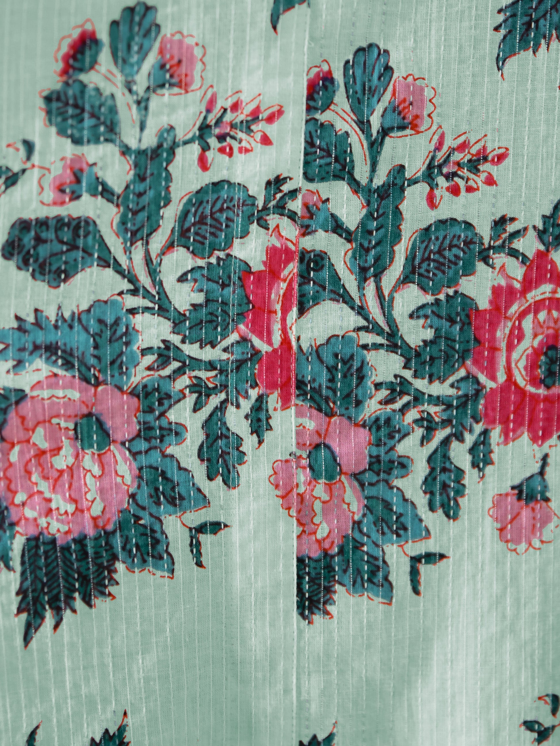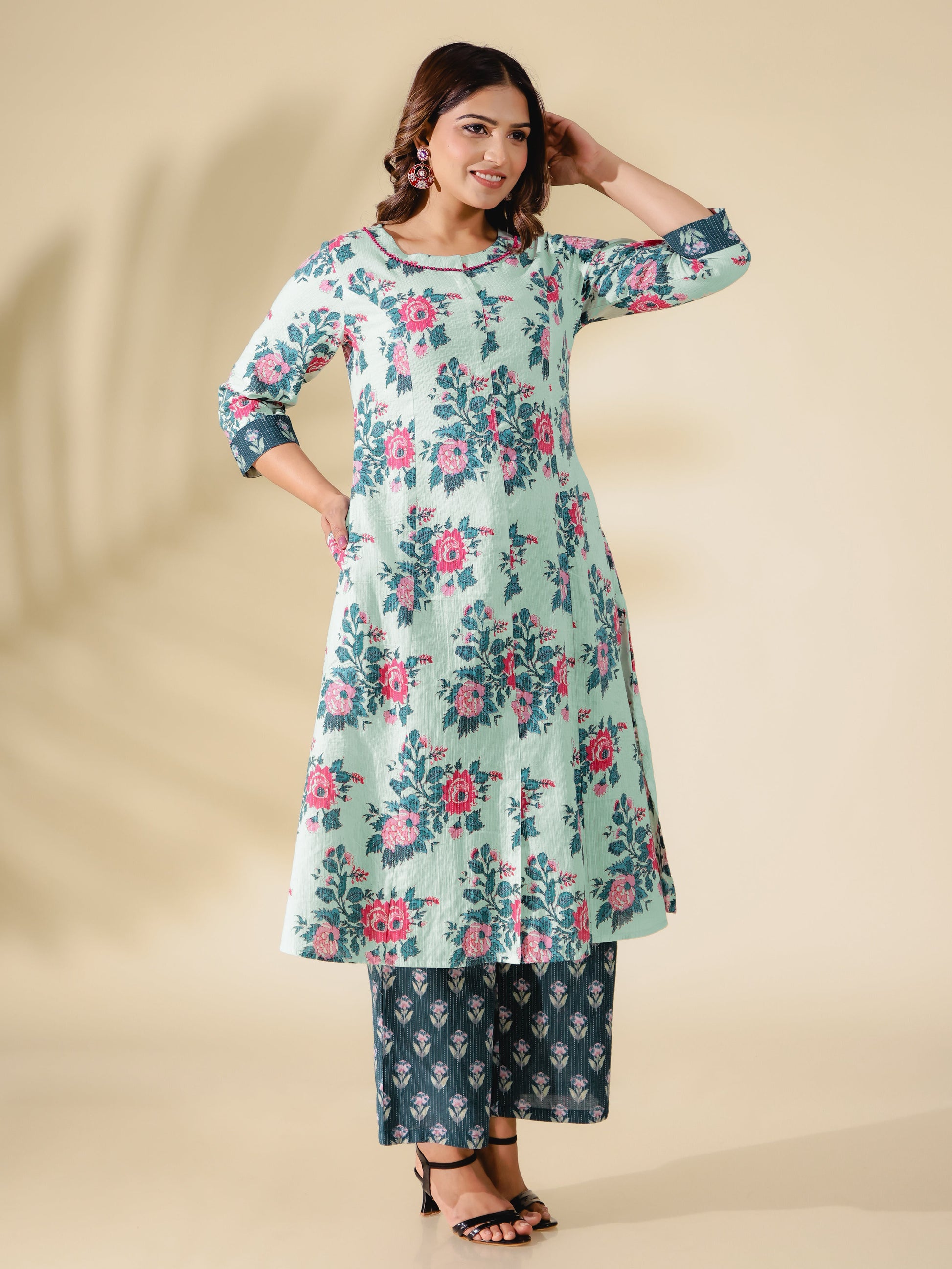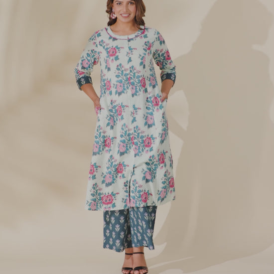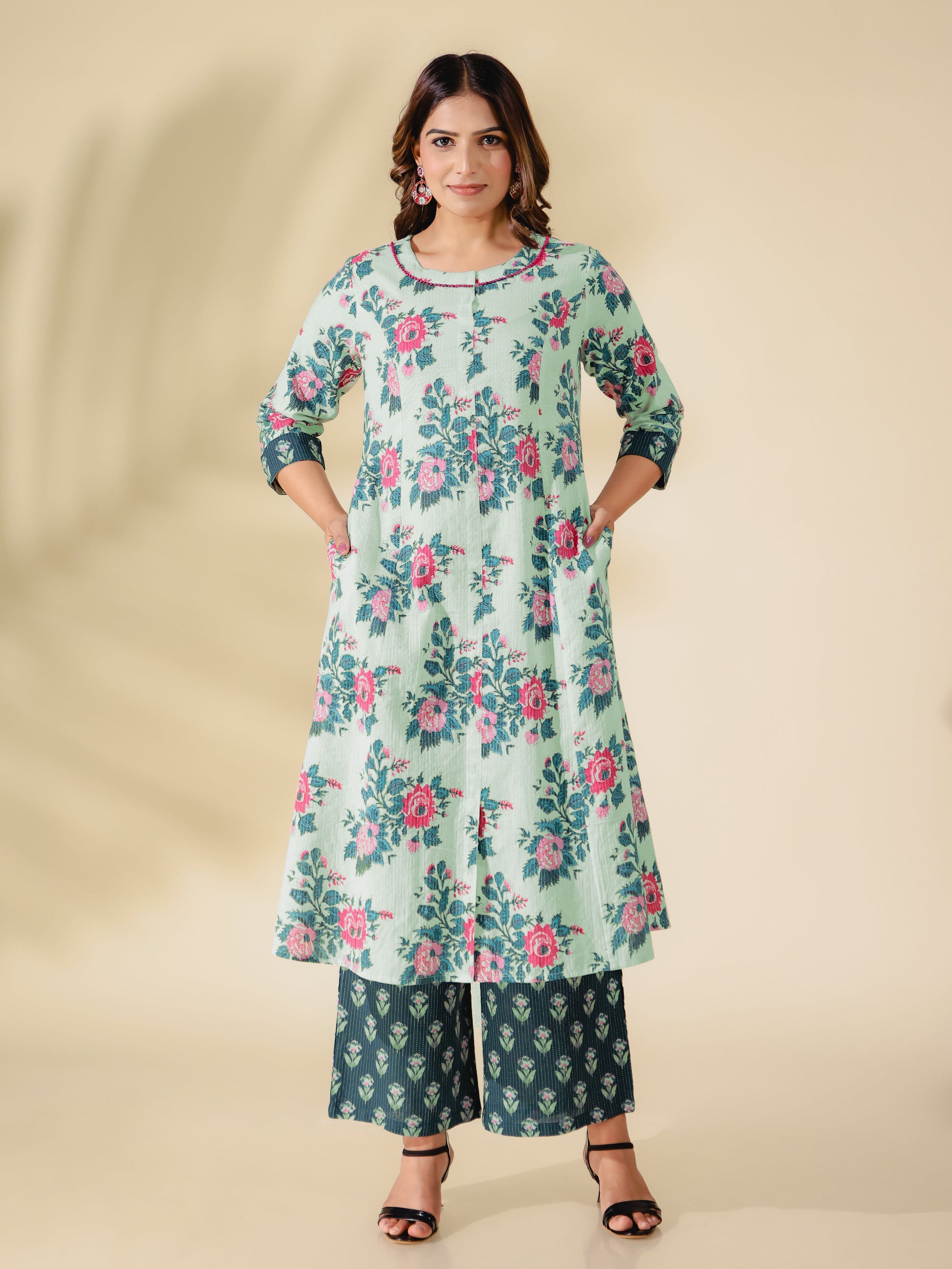 Add a touch of sophistication to your collection with this cream kantha cotton floral kurta. Featuring a sophisticated round neck and eye-catching floral design. Delicate beads & stones detailing elevates this piece to a statement wardrobe essential. The subtle a-line flare adds feminine grace while ensuring easy movement. Perfectly tailored with 3/4 sleeve and a calf length for versatile styling. Perfect for everyday elegance or casual settings, with simple hand wash only requirements.