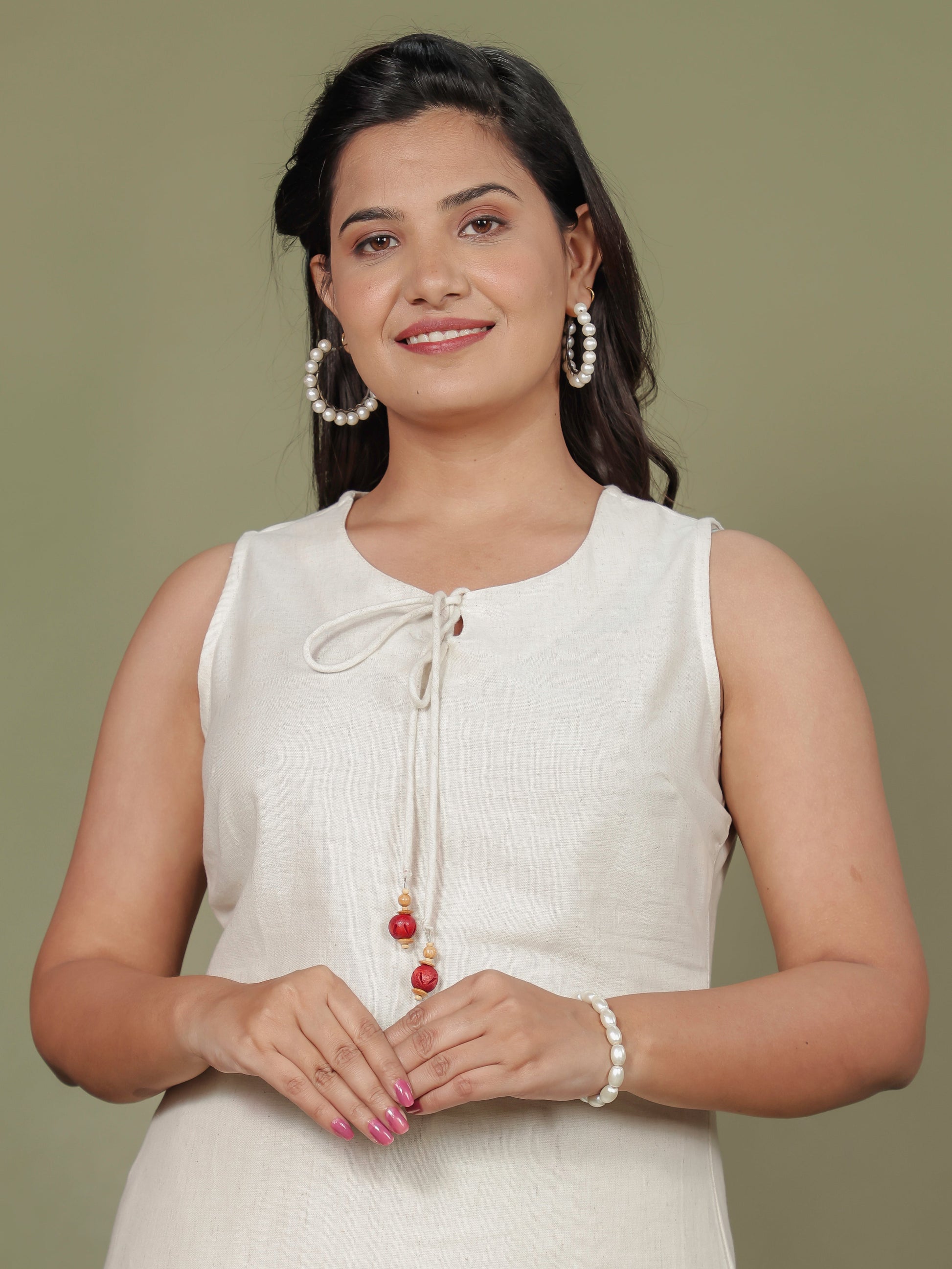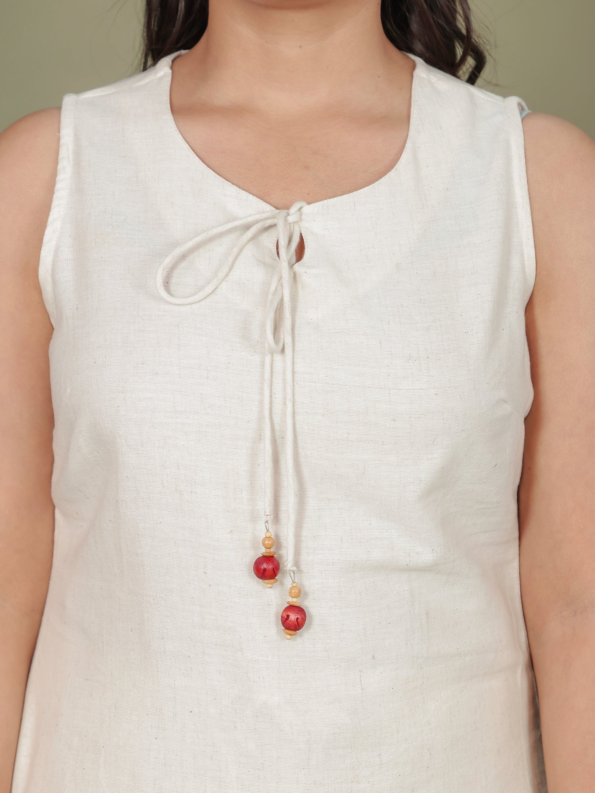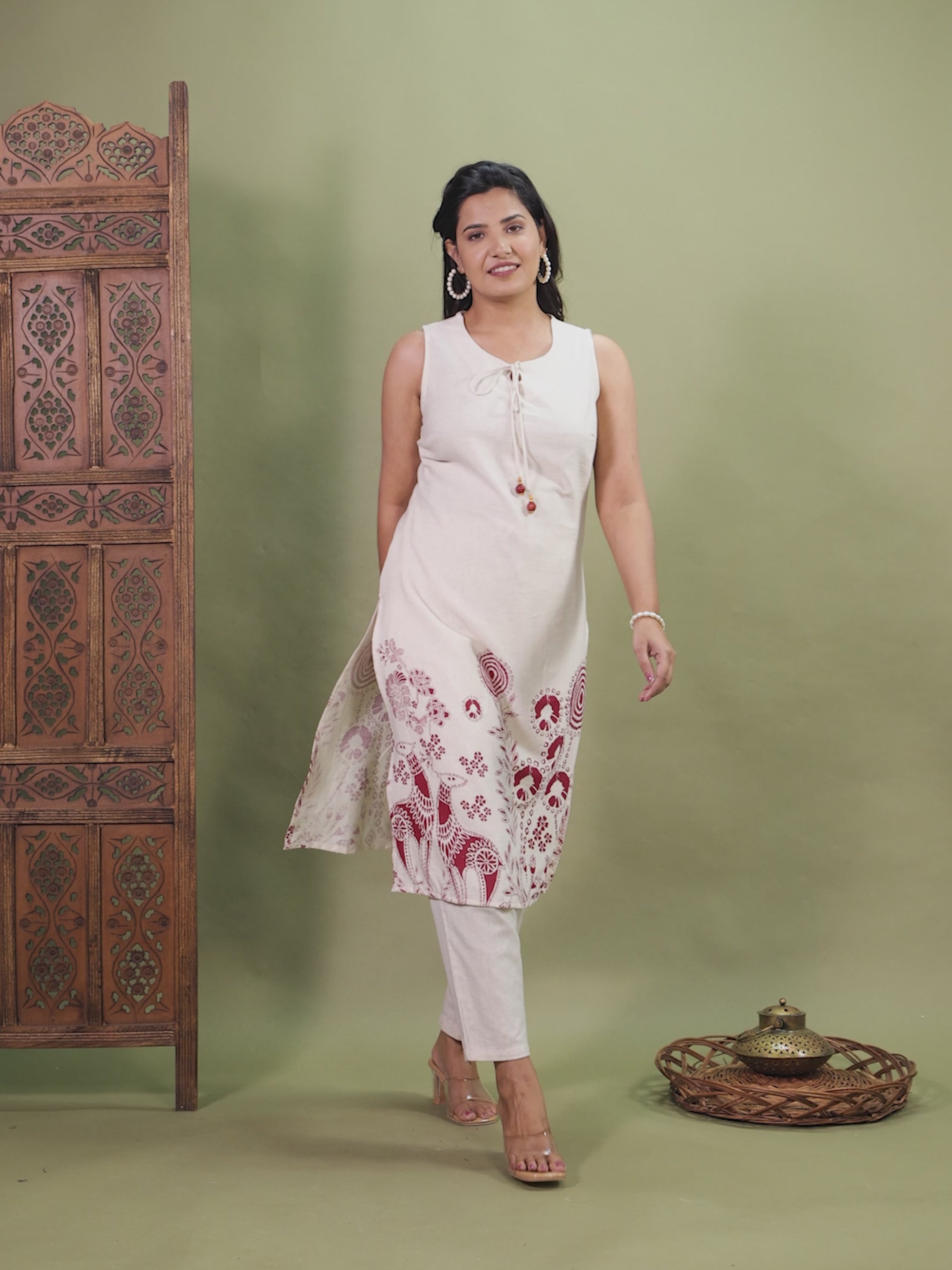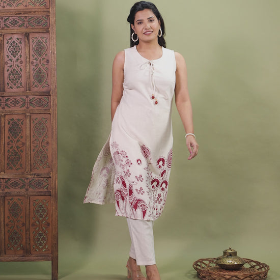 This Off White Straight kurta in soft Natural Cotton is a timeless pick for festive and casual wear. Designed with a Round neckline and Sleeveless sleeves, its graceful Calf Length cut flatters all body types. The delicate Placement Print detailing adds a touch of sophistication. Pair it with statement earrings and juttis for a polished look. Maintain its pristine look by following proper care instructions.