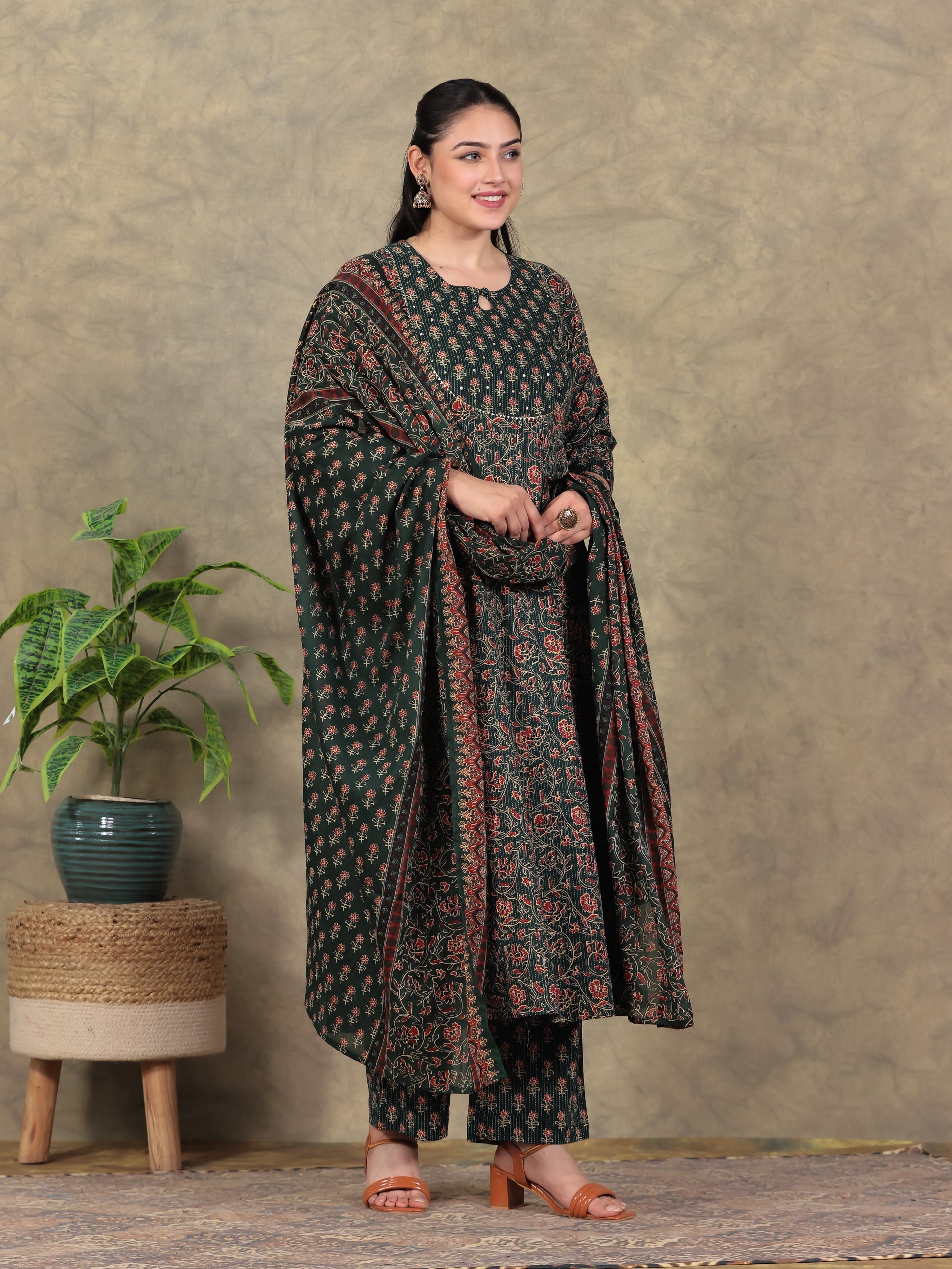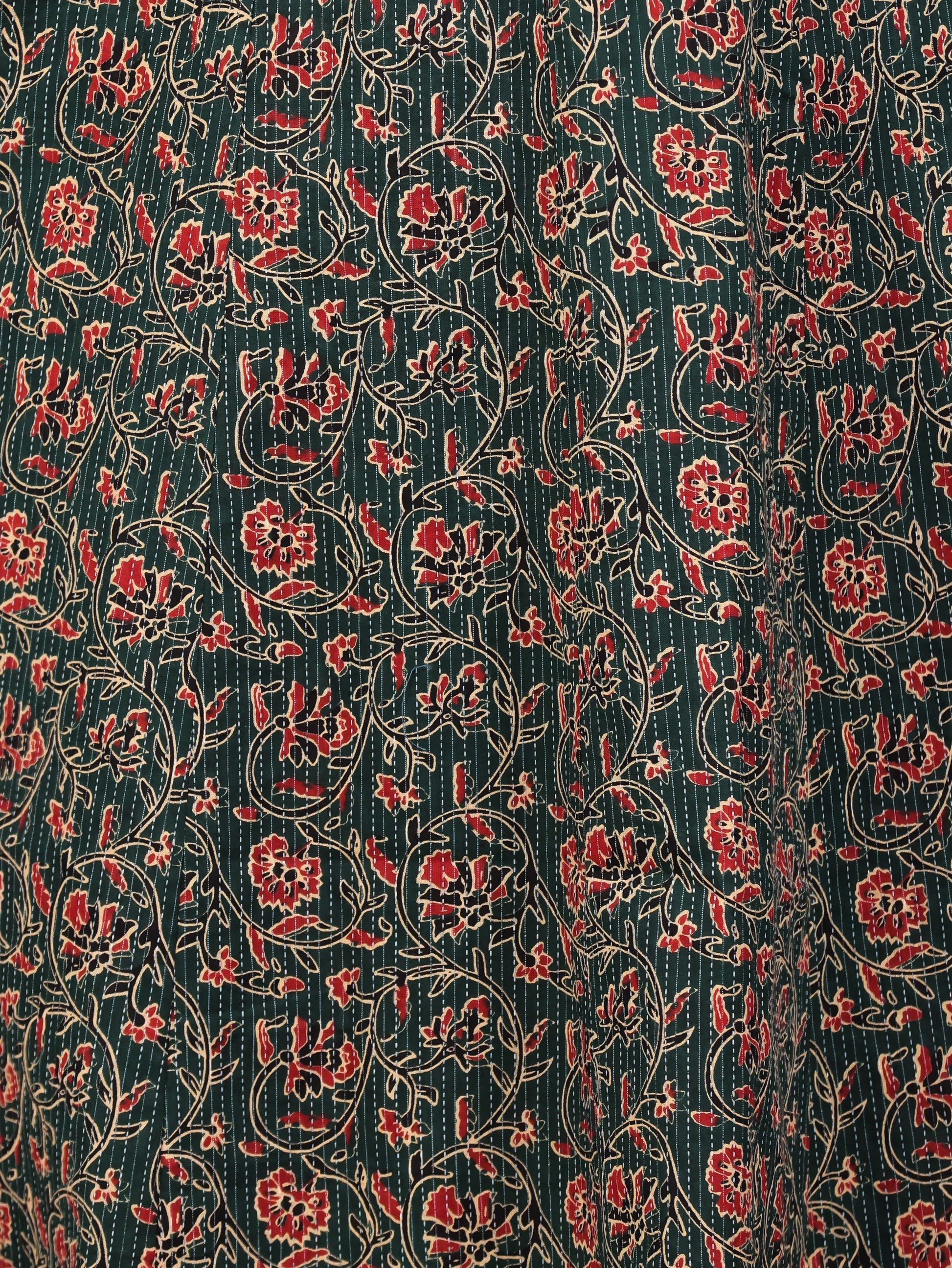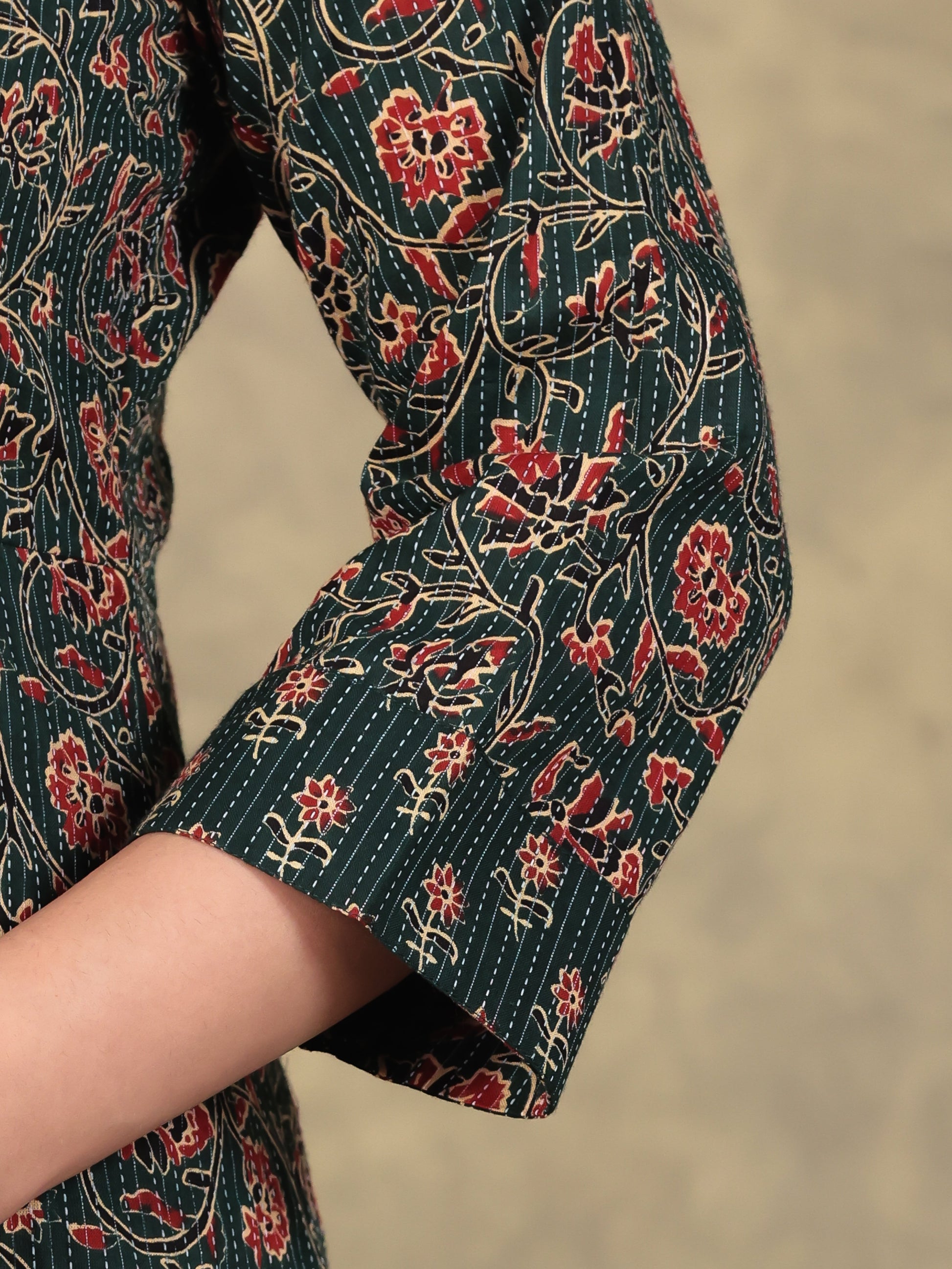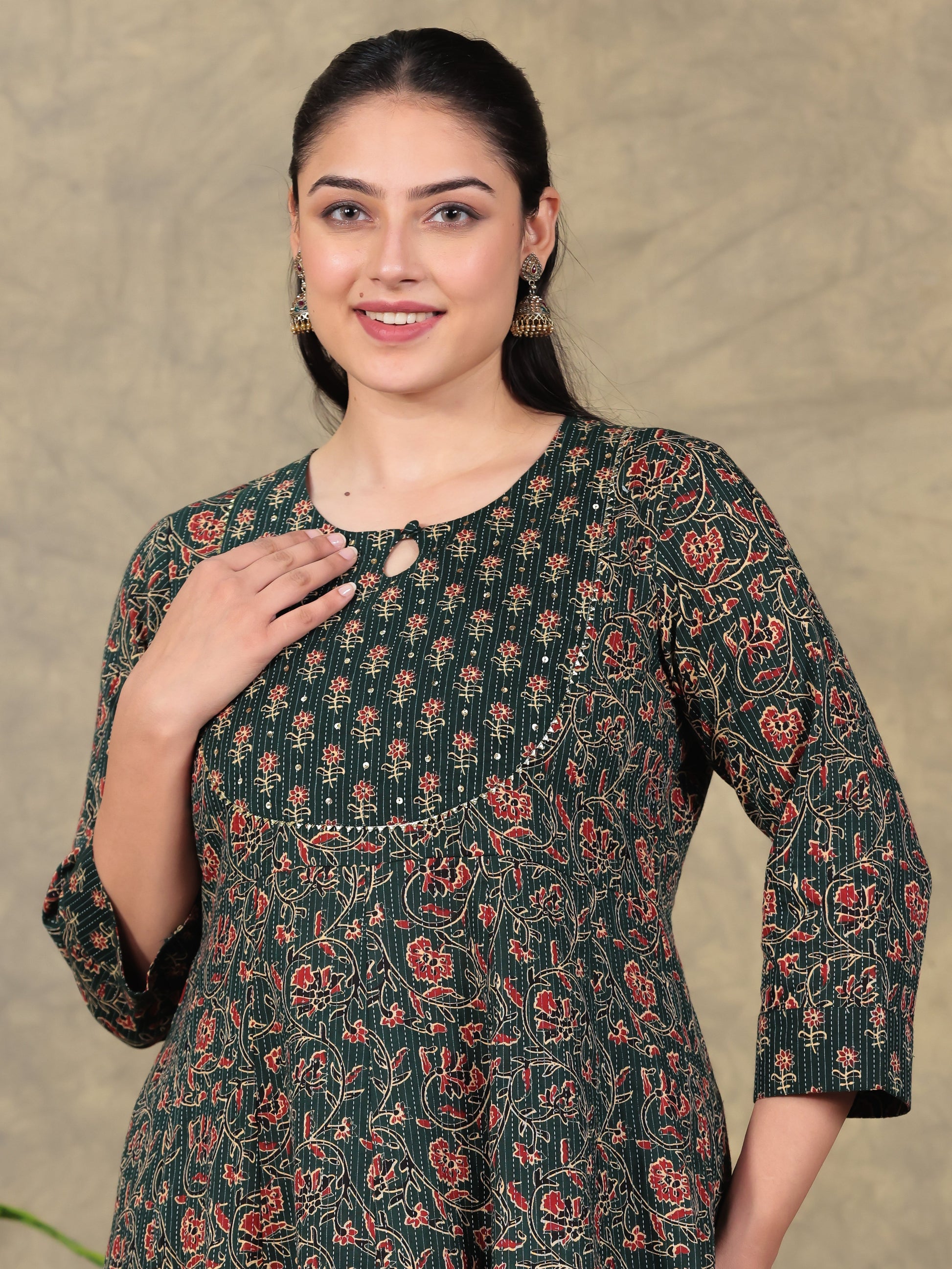 Embroidered Kantha Cotton Floral Anarkali Green Kurta