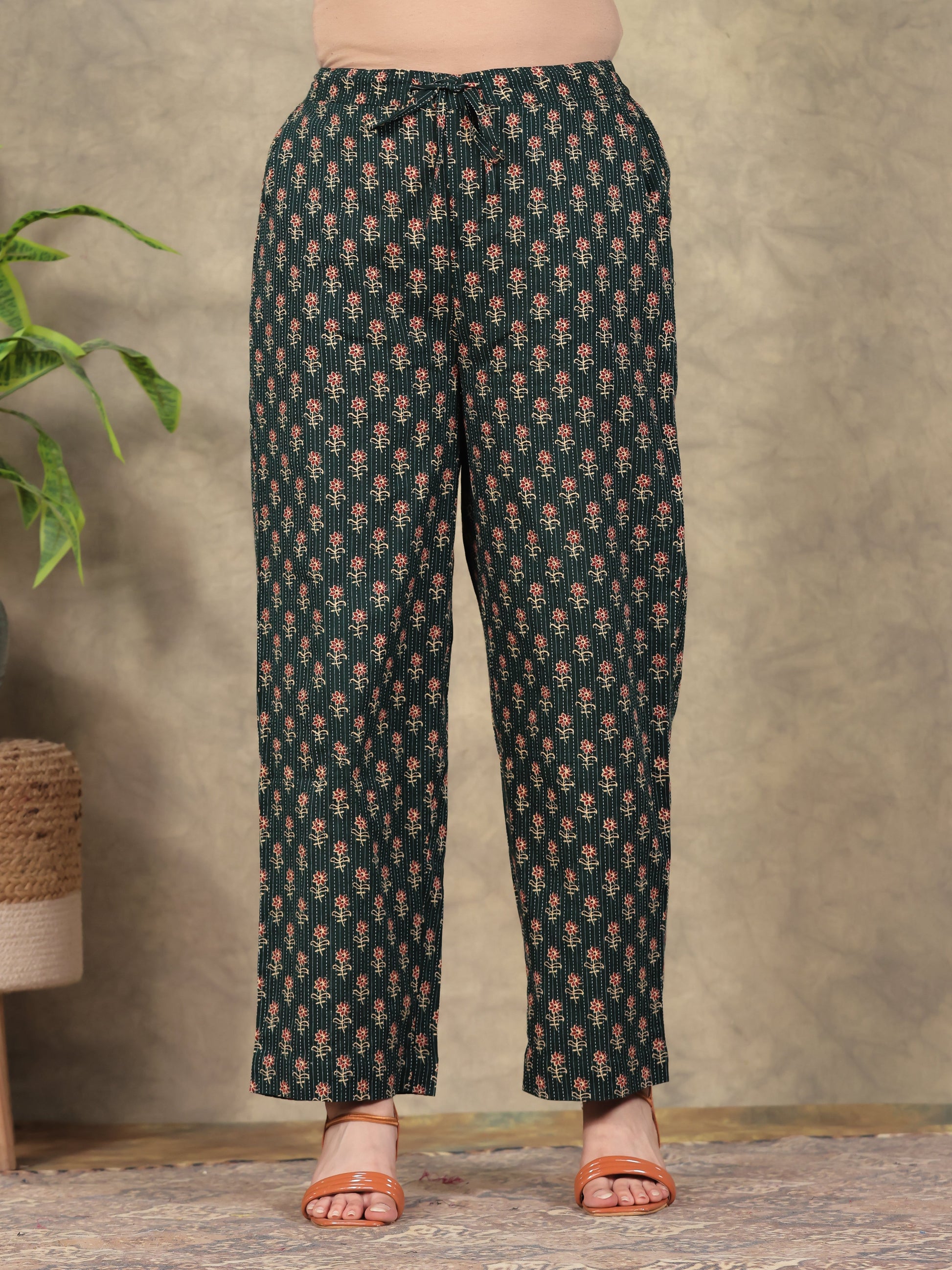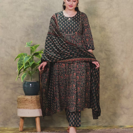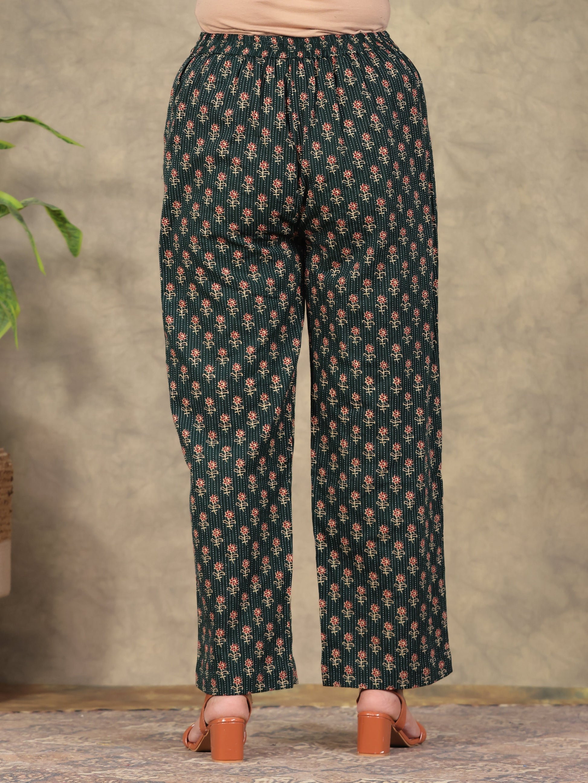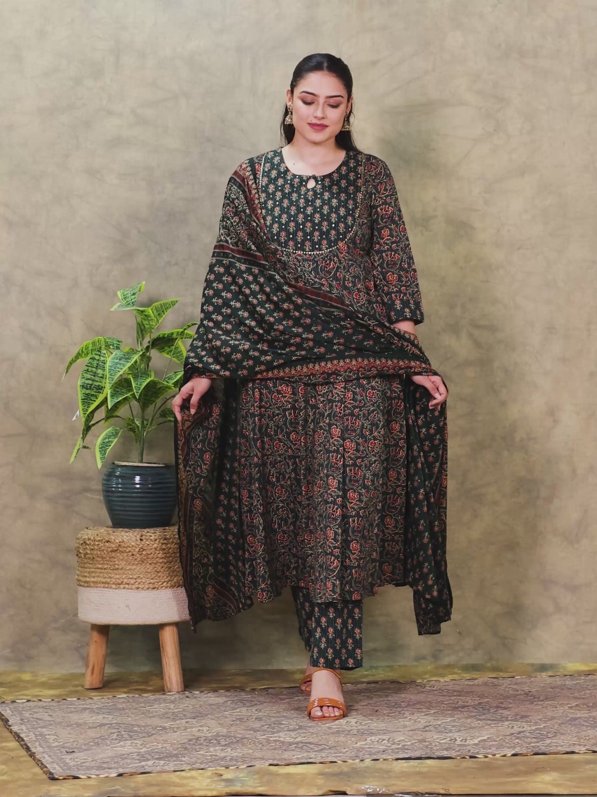 Embroidered Kantha Cotton Floral Anarkali Green Kurta