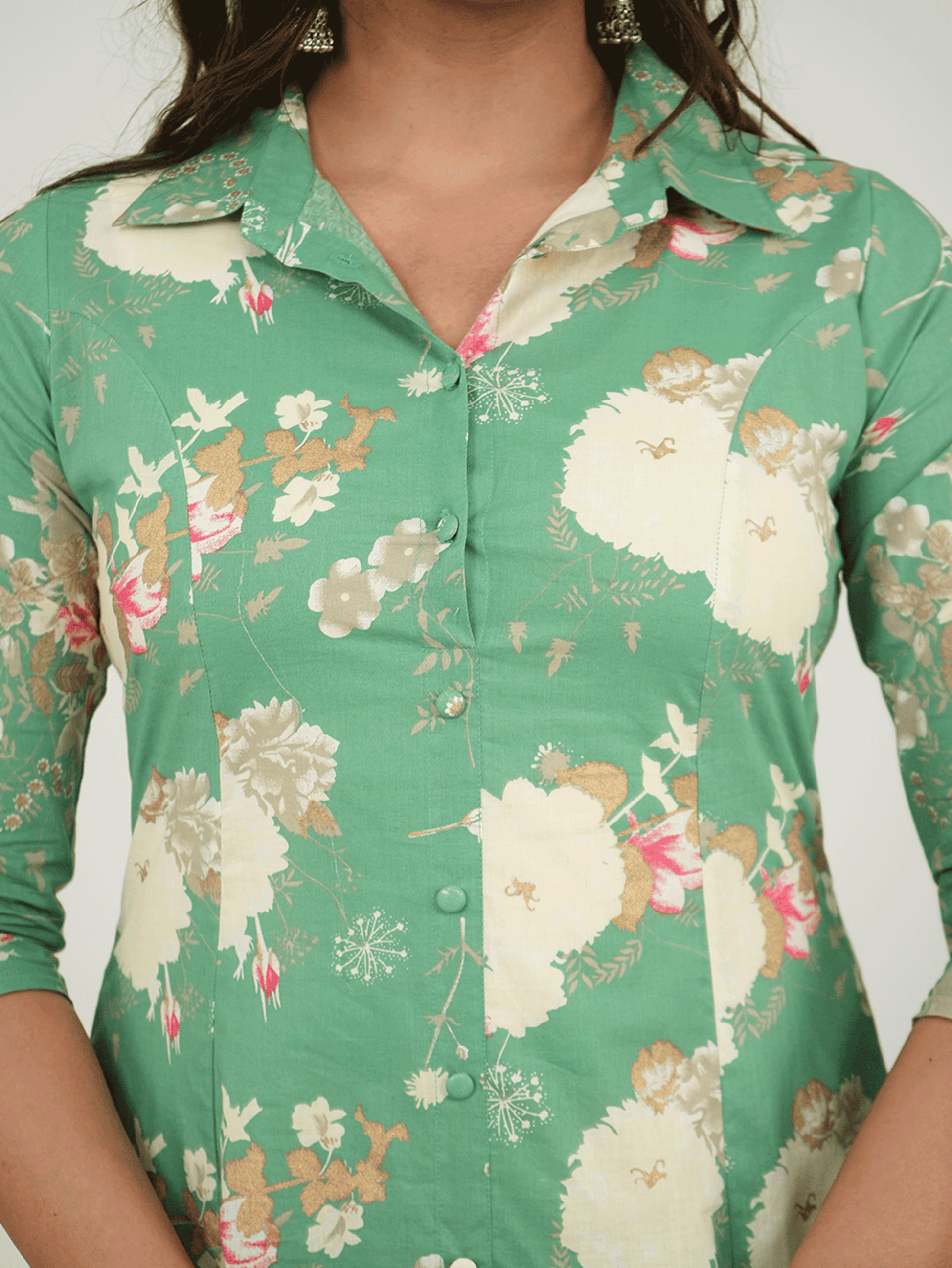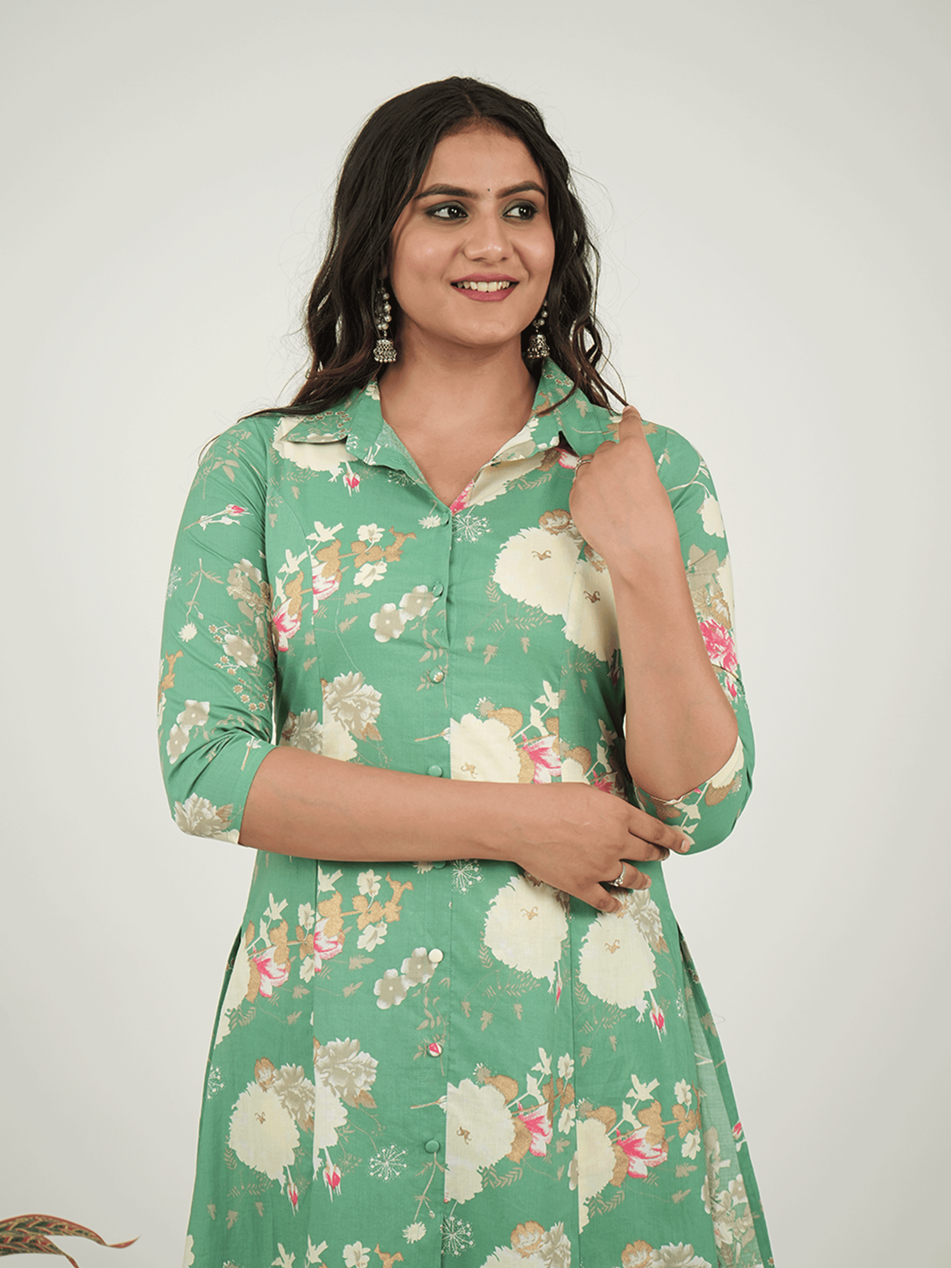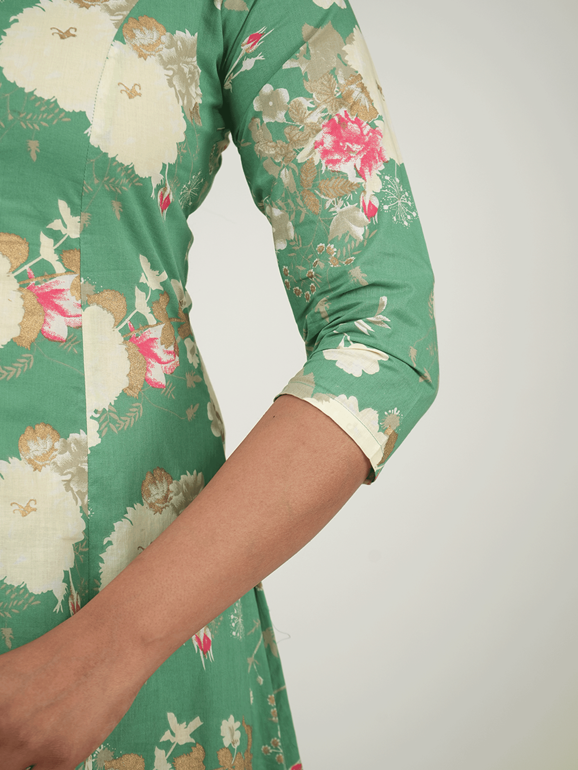 Linen Cotton Floral High Low Green Kurta