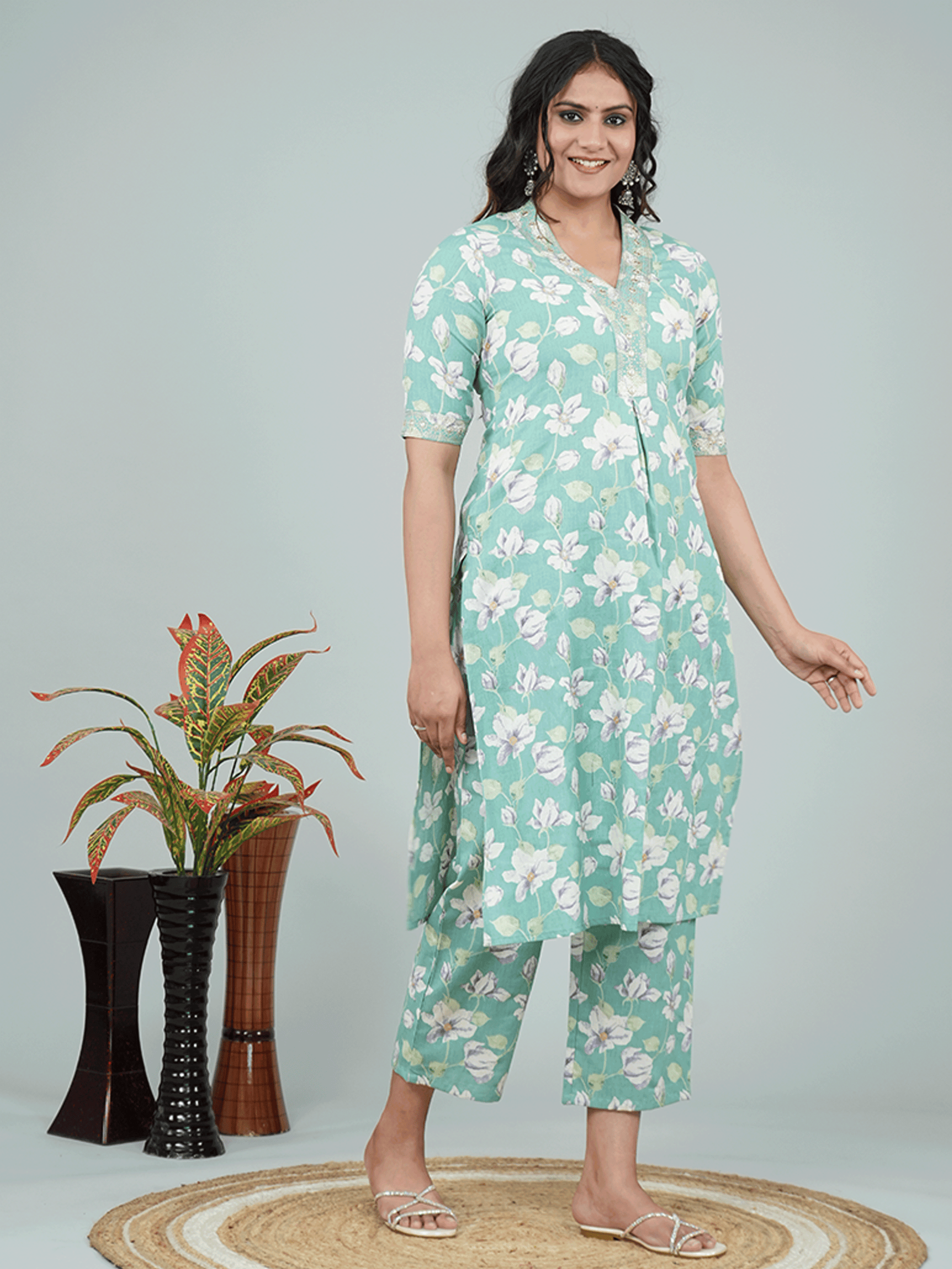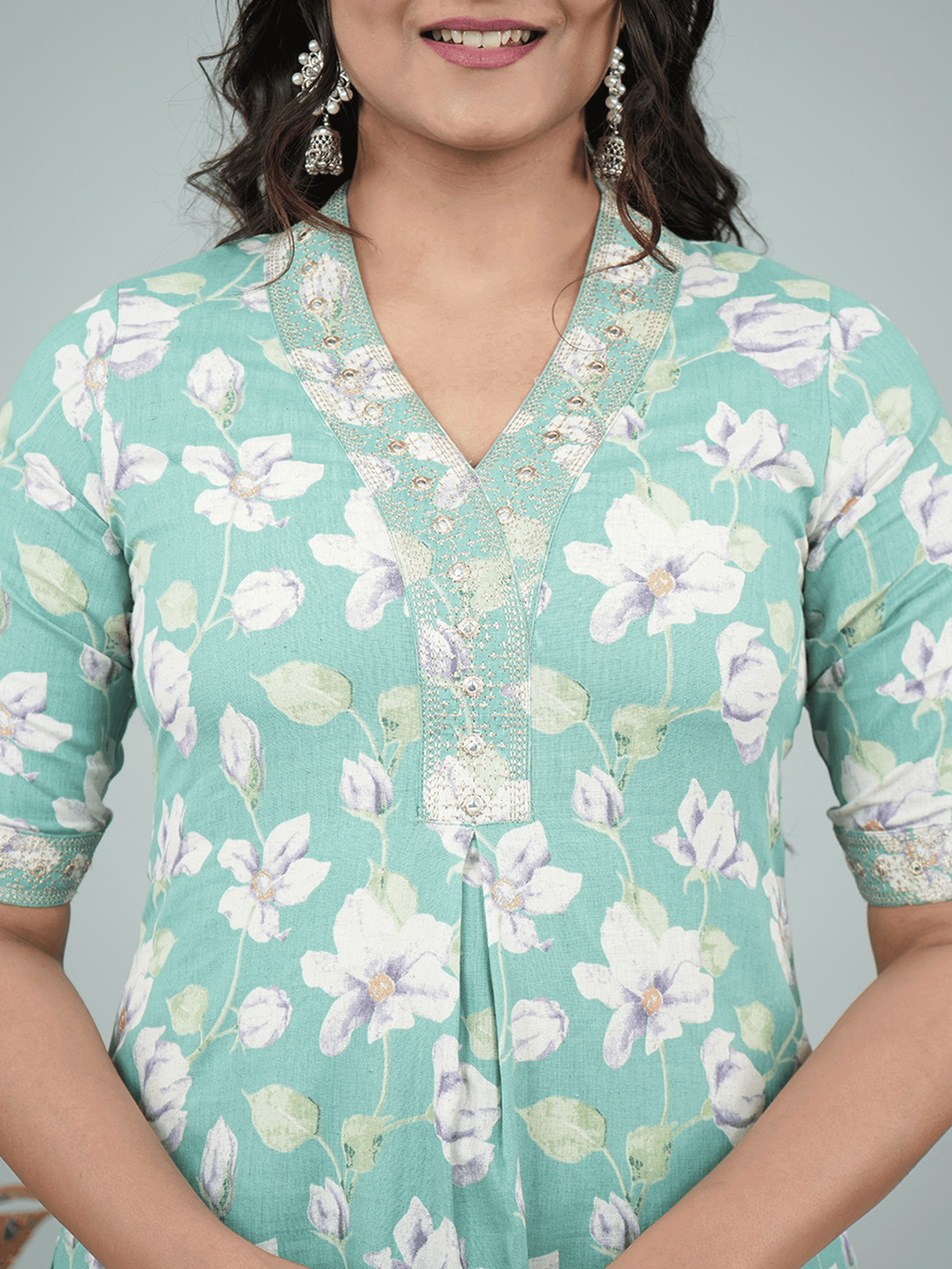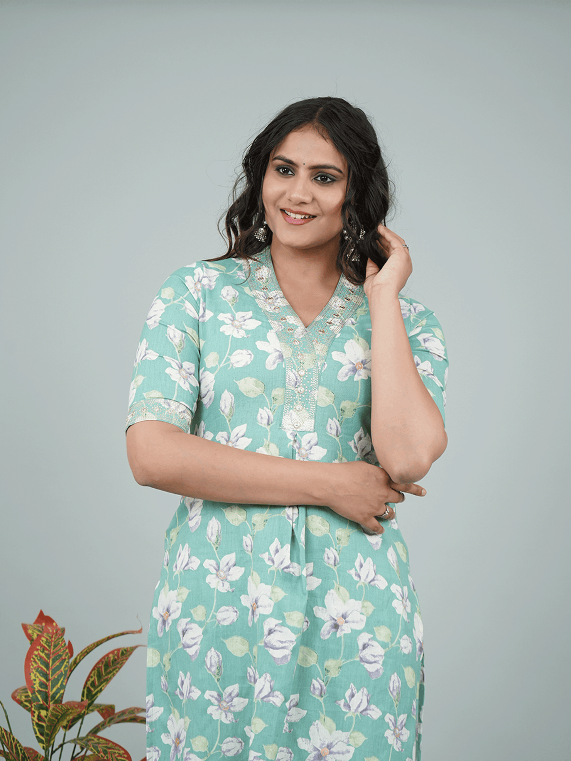 Crafted from breathable Linen Cotton, this Straight kurta in Green blends traditional design with everyday comfort. The Floral finish adds artisanal charm, while the Calf Length silhouette ensures effortless elegance. Style with palazzos or leggings for versatile looks, from workdays to weekend outings. Designed for easy care, this kurta stays beautiful with simple care instructions.