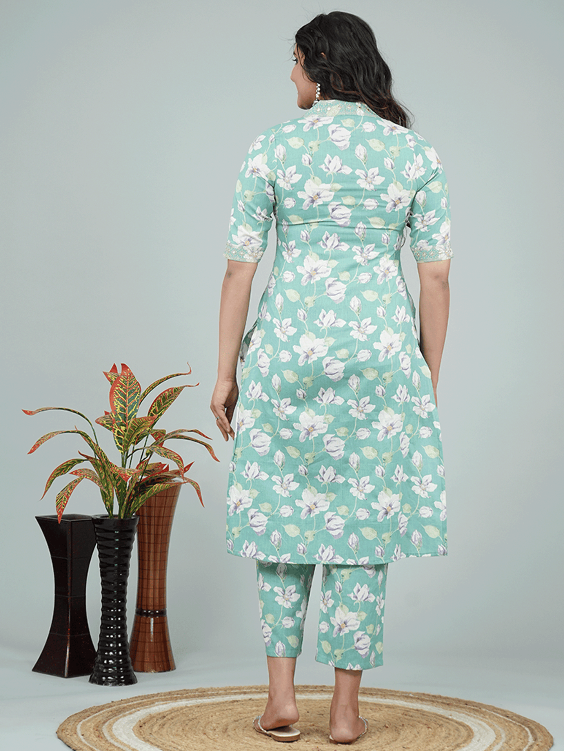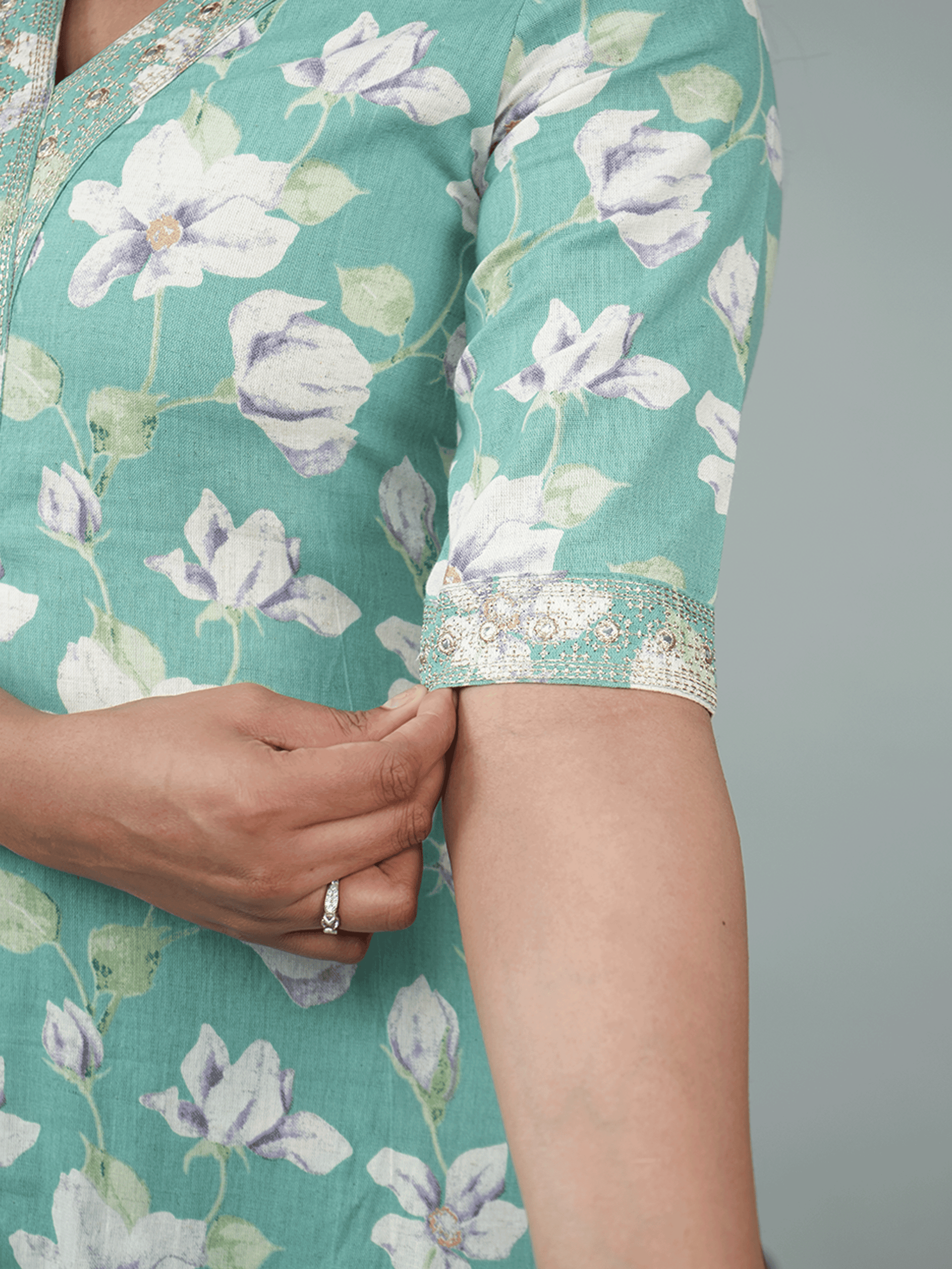 Embroidered Linen Cotton Floral Straight Green Kurta