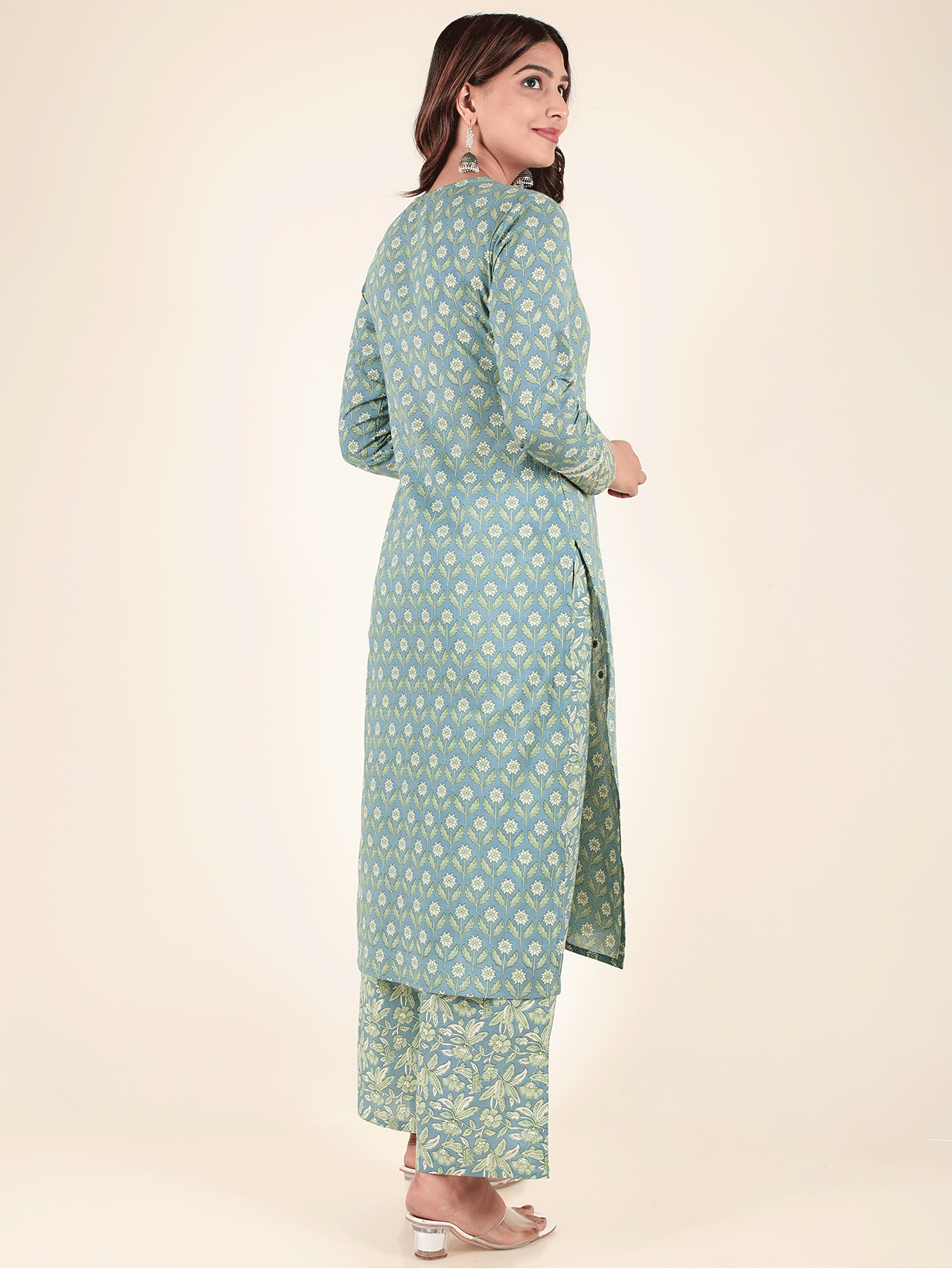 This Blue Soft Cotton kurta with a Straight flare is designed for comfort and style. Featuring a V neckline, Full Sleeve sleeves, and a graceful Calf Length hemline, it’s perfect for festive wear or semi-formal gatherings. The Floral highlights add depth and texture, making it a standout piece. Accessorise with a contrasting dupatta and keep it pristine by following proper care instructions.