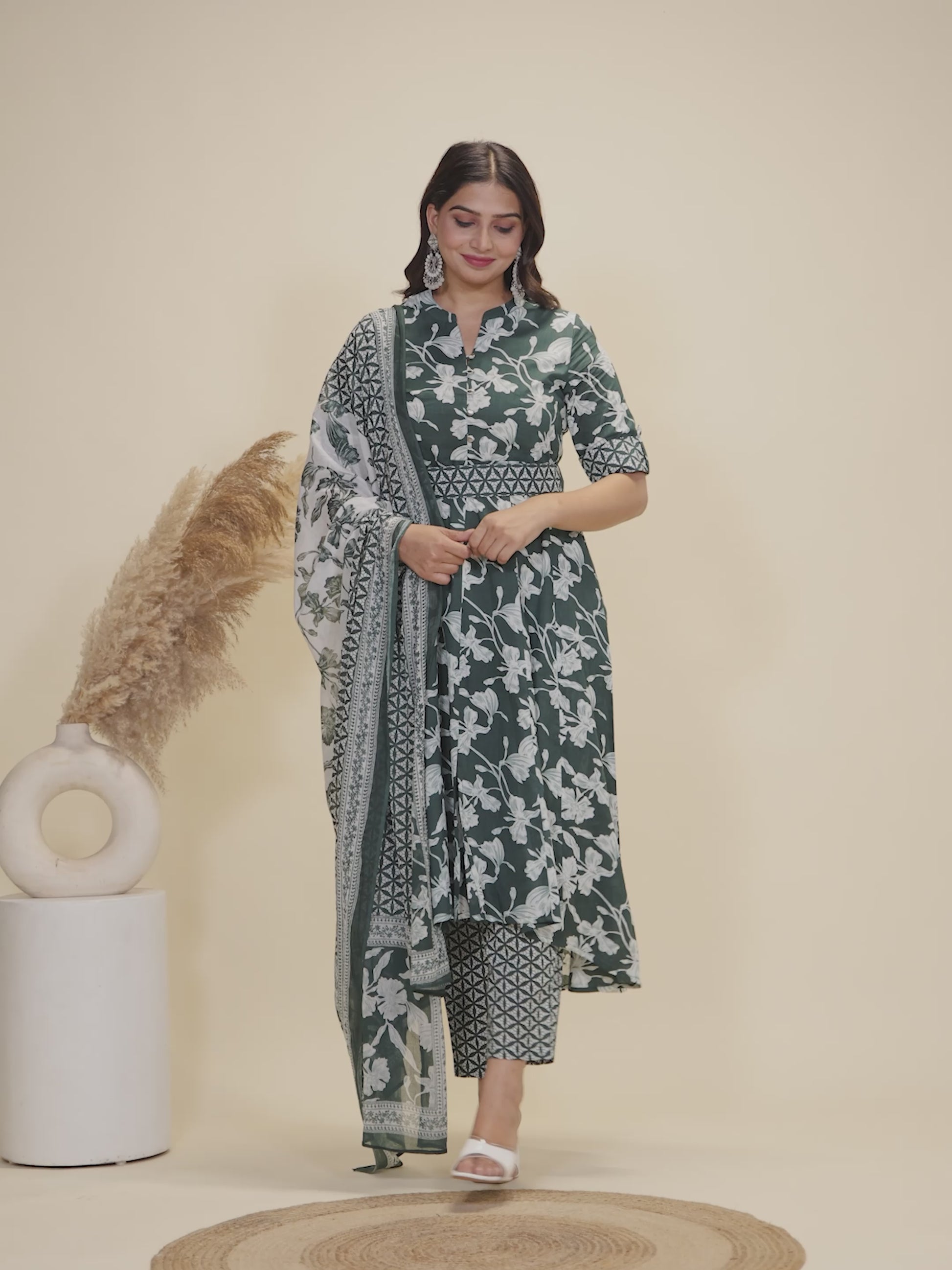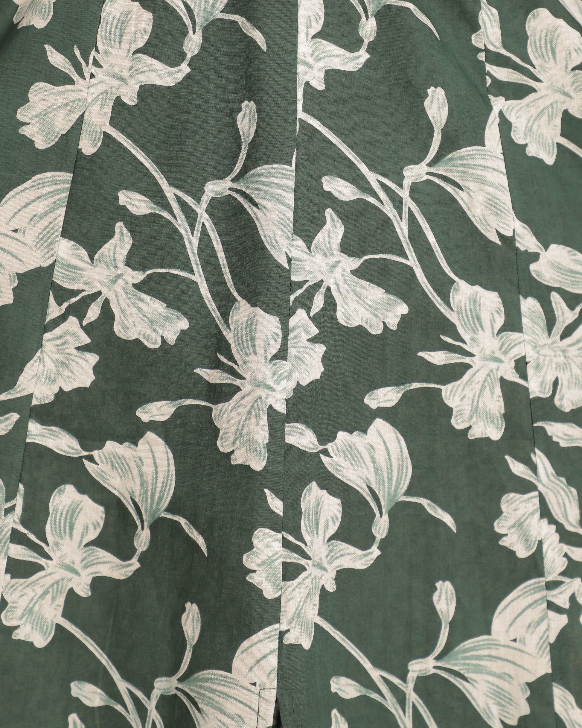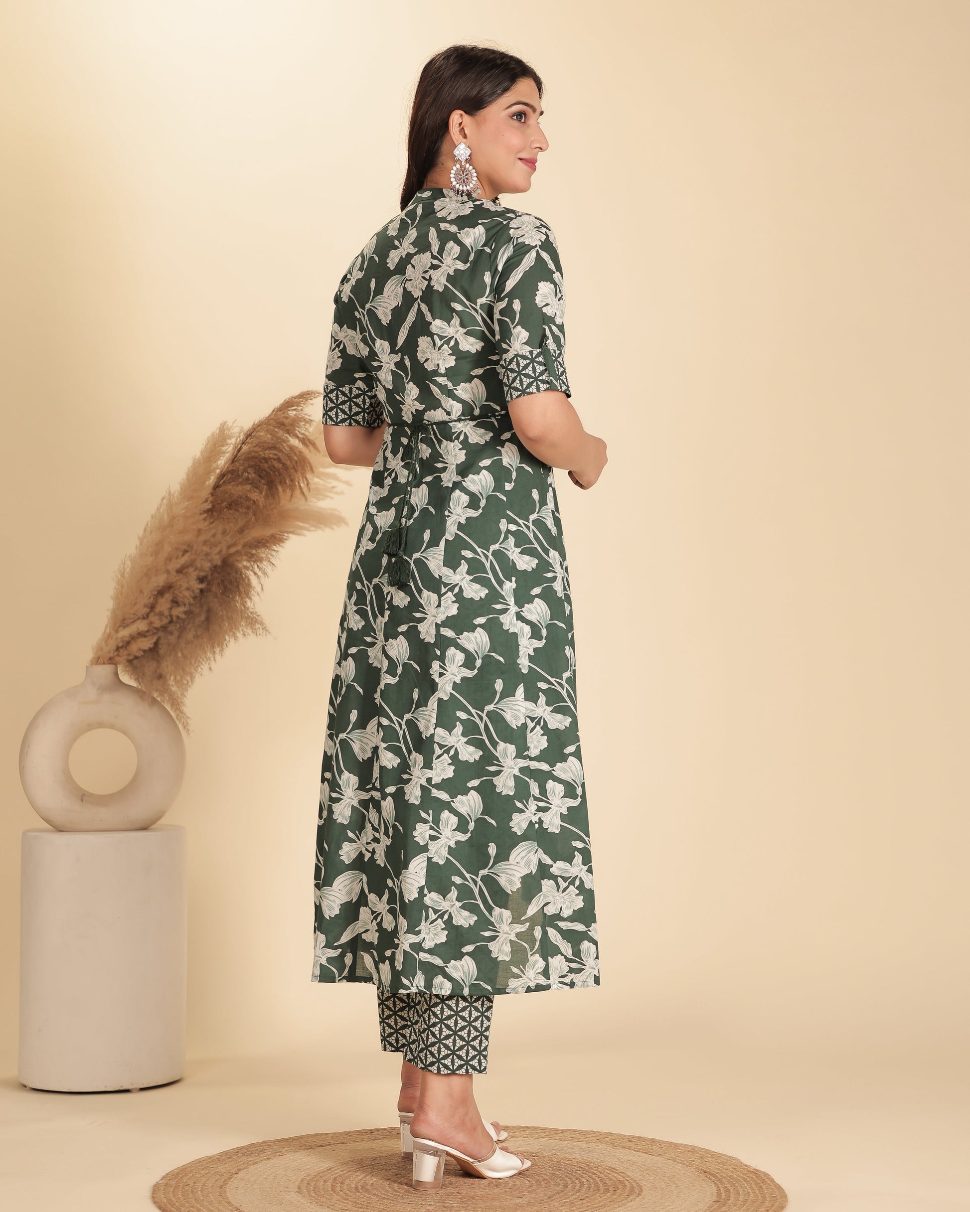 Make a stylish statement with this green high low kurta & pant made from premium soft cotton. The beautiful floral pattern complements the elegant collared neckline. The matching pants provide a coordinated look with comfortable fit for all-day wear. Adorned with intricate garment accessory work that showcases fine craftsmanship. This innovative high low silhouette blends traditional and modern elements for a fashion-forward look. Perfectly tailored with 3/4 sleeve and a calf length for versatile styling.