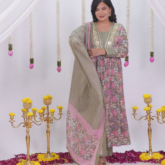 Embroidered Soft Cotton Floral Anarkali Green Kurta