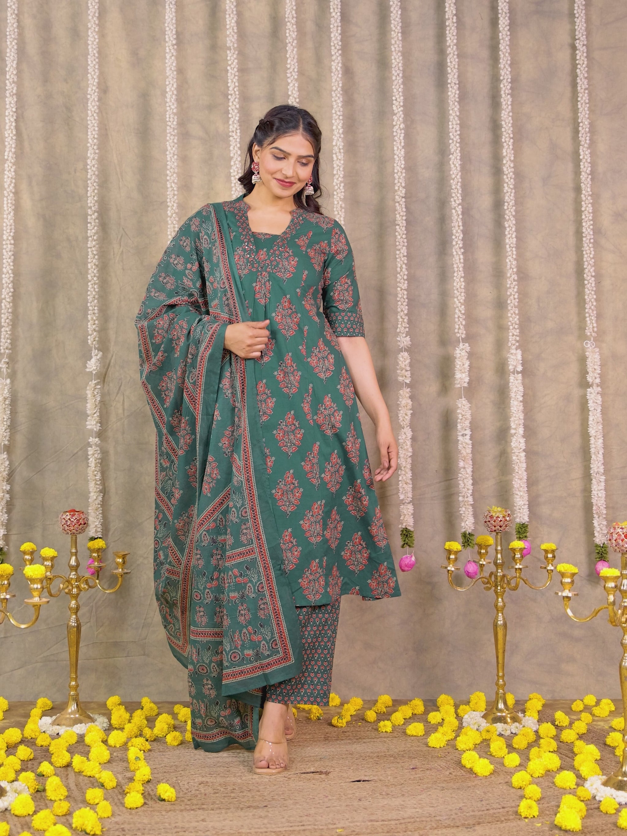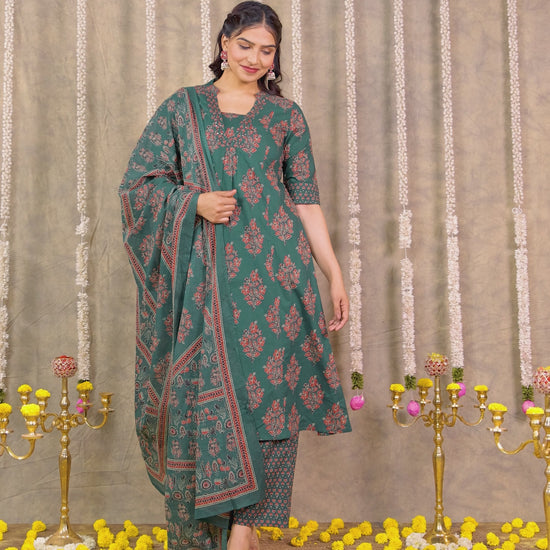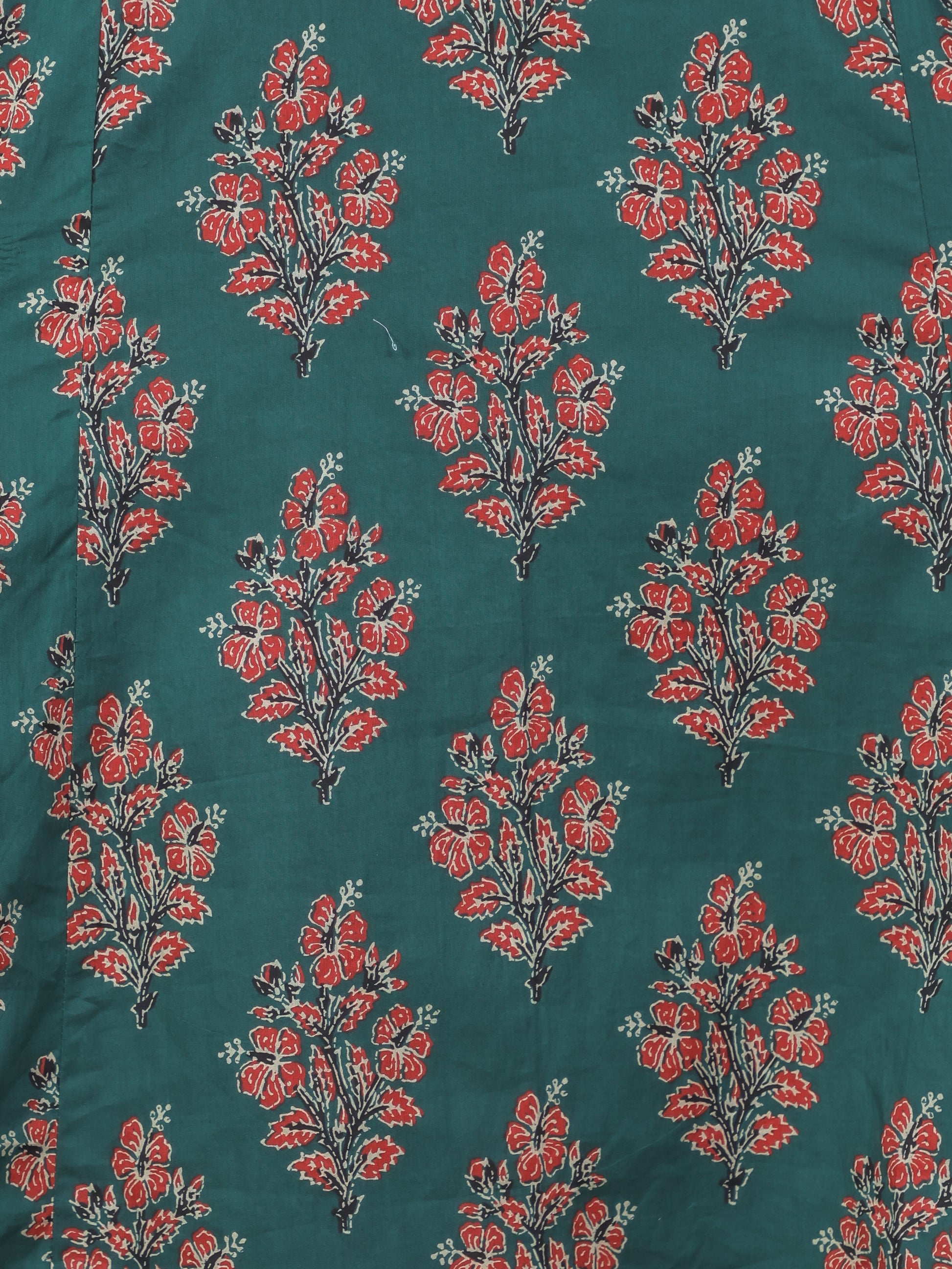 Embroidered Soft Cotton Block Print A-line Green Kurta
