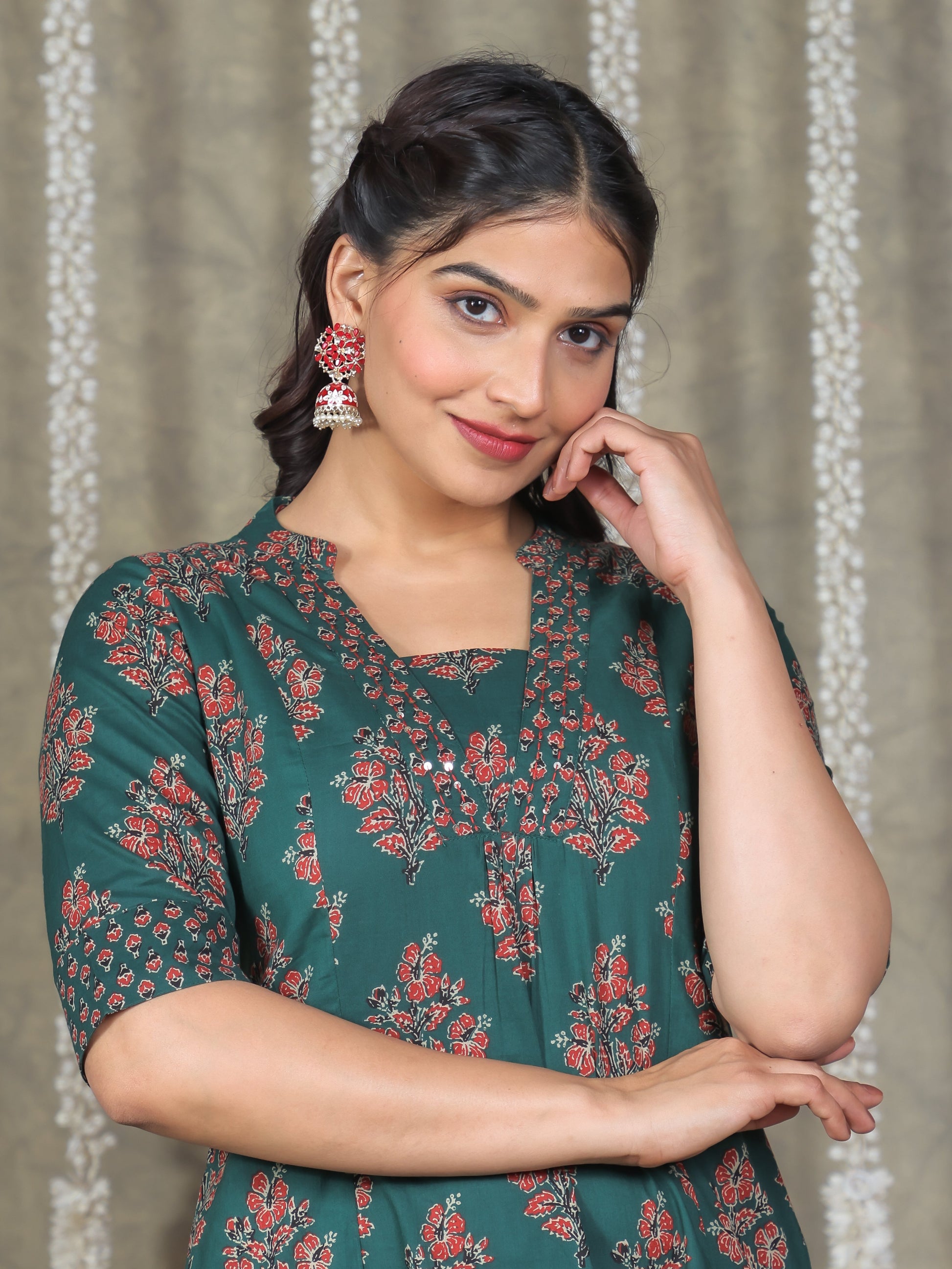 This Green Soft Cotton kurta with a A-line flare is designed for comfort and style. Featuring a V neckline, 3/4 Sleeve sleeves, and a graceful Calf Length hemline, it’s perfect for festive wear or semi-formal gatherings. The Block Print highlights add depth and texture, making it a standout piece. Accessorise with a contrasting dupatta and keep it pristine by following proper care instructions.