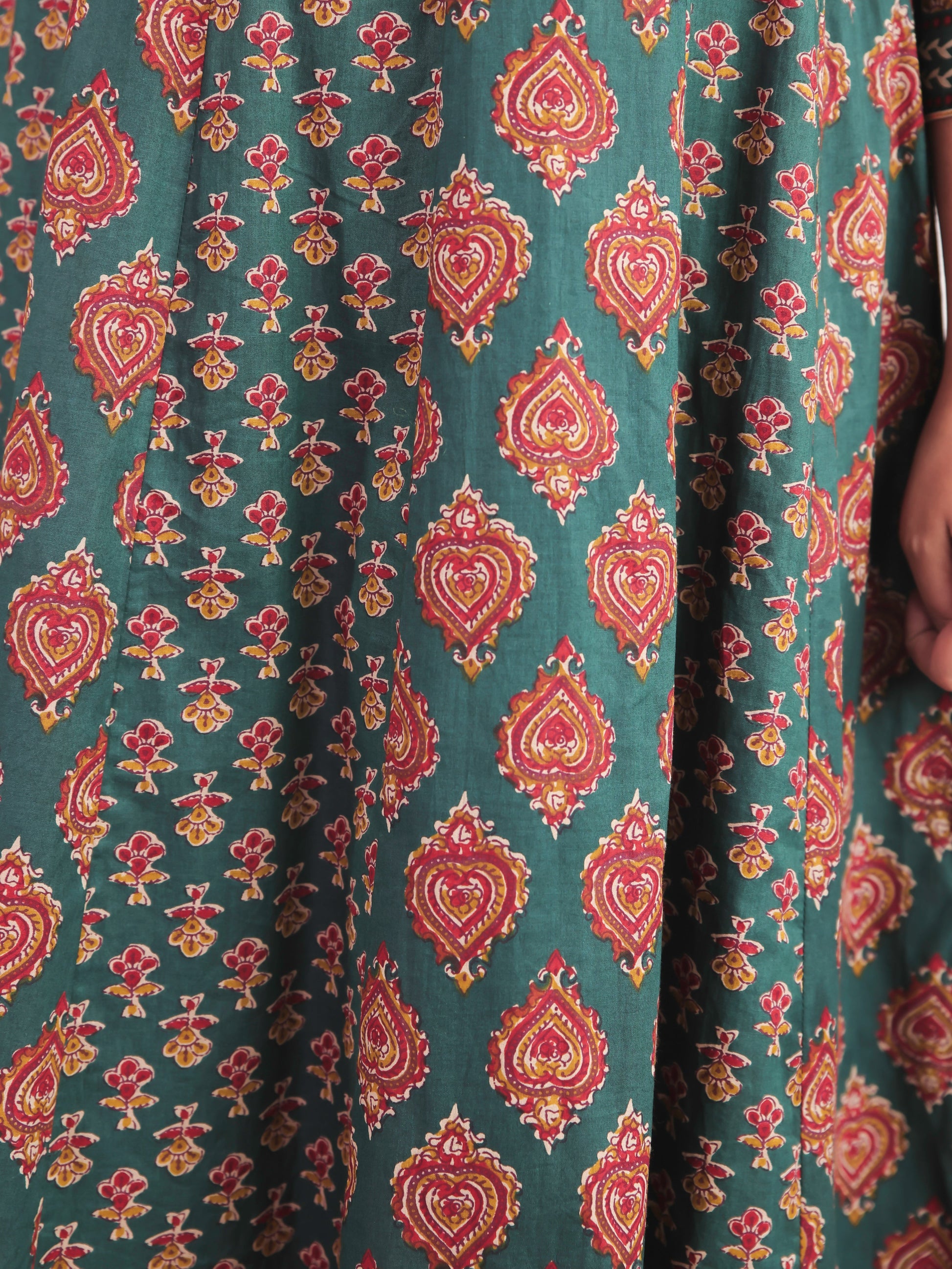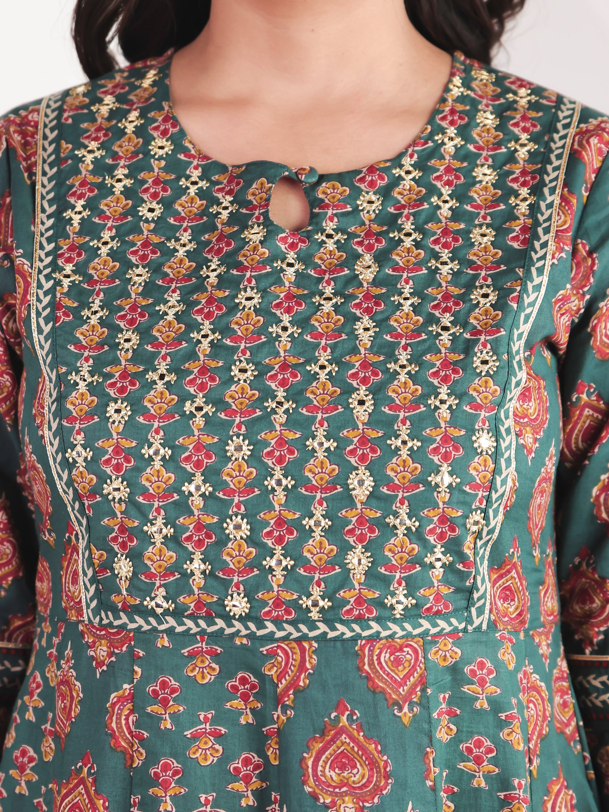 Embroidered Soft Cotton Floral Anarkali Green Kurta
