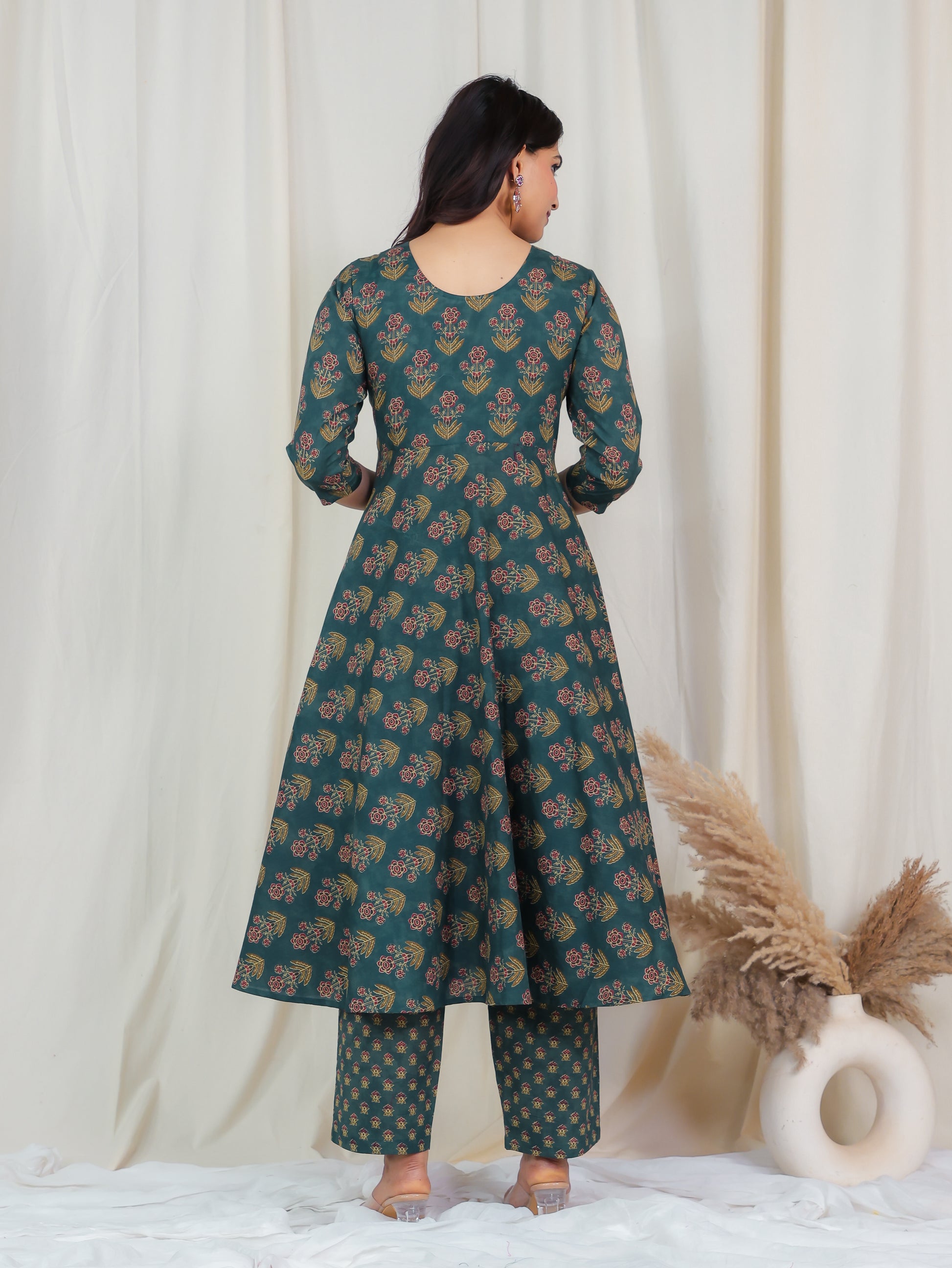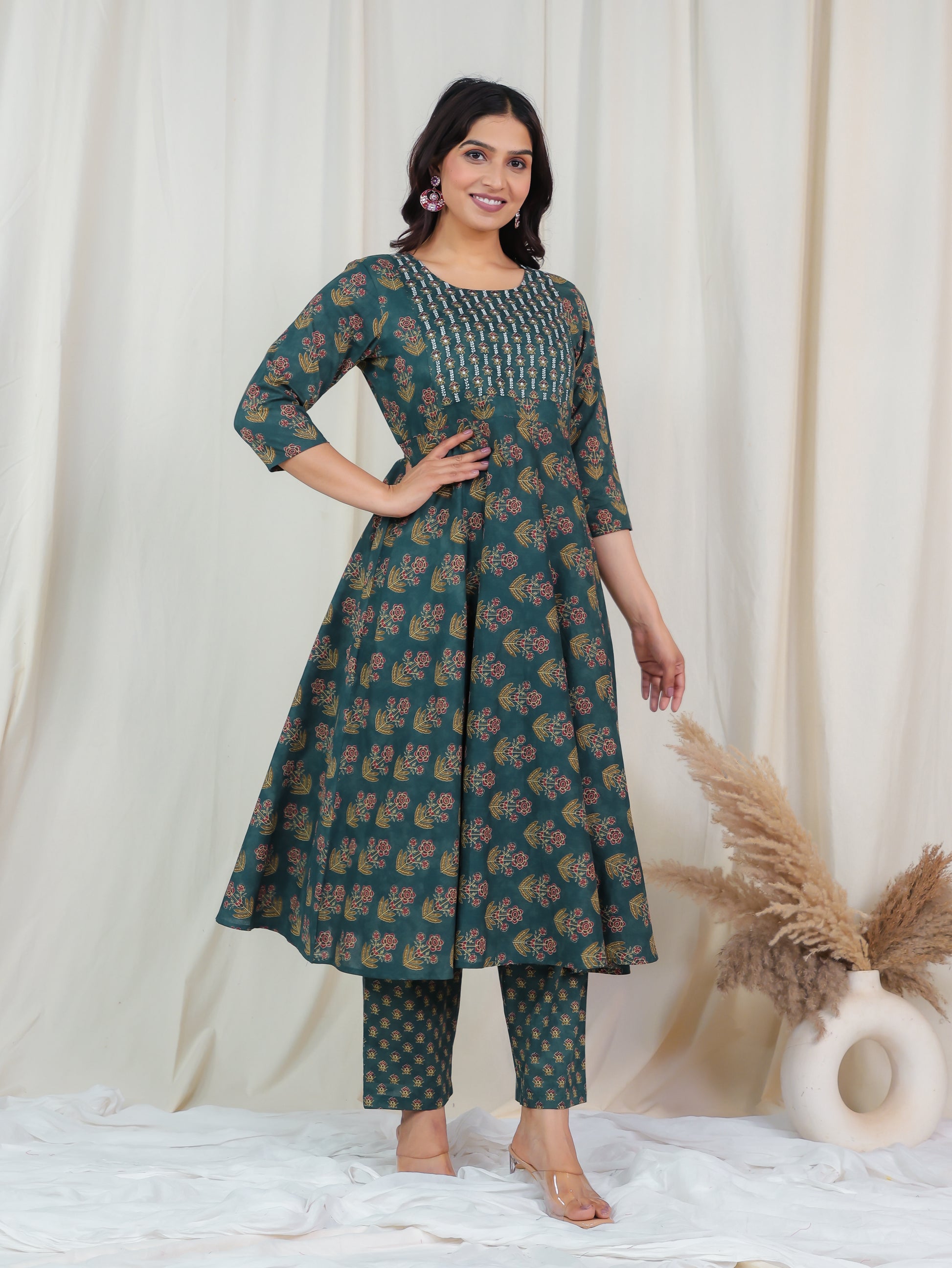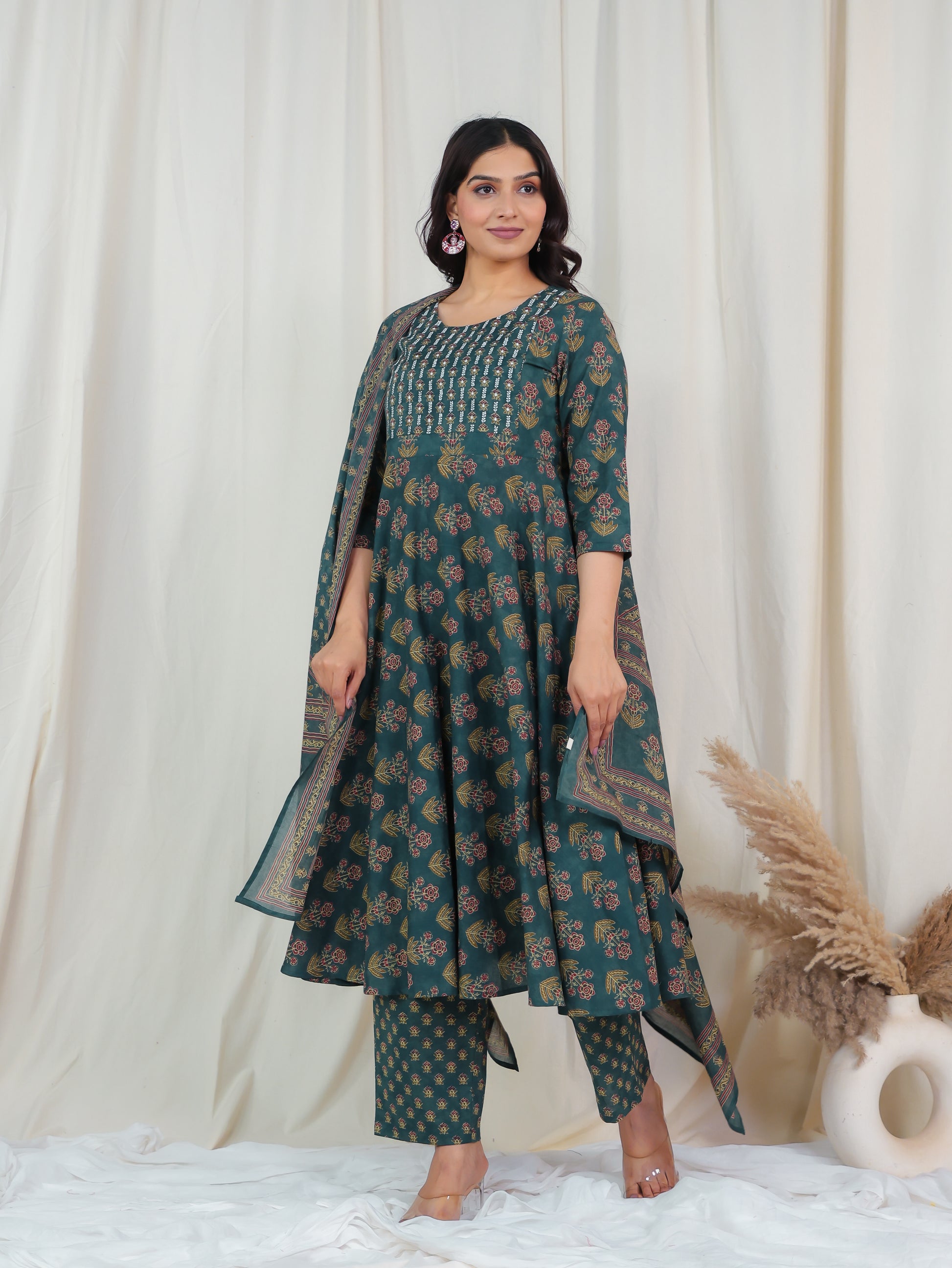 Embroidered Soft Cotton Floral Anarkali Green Kurta