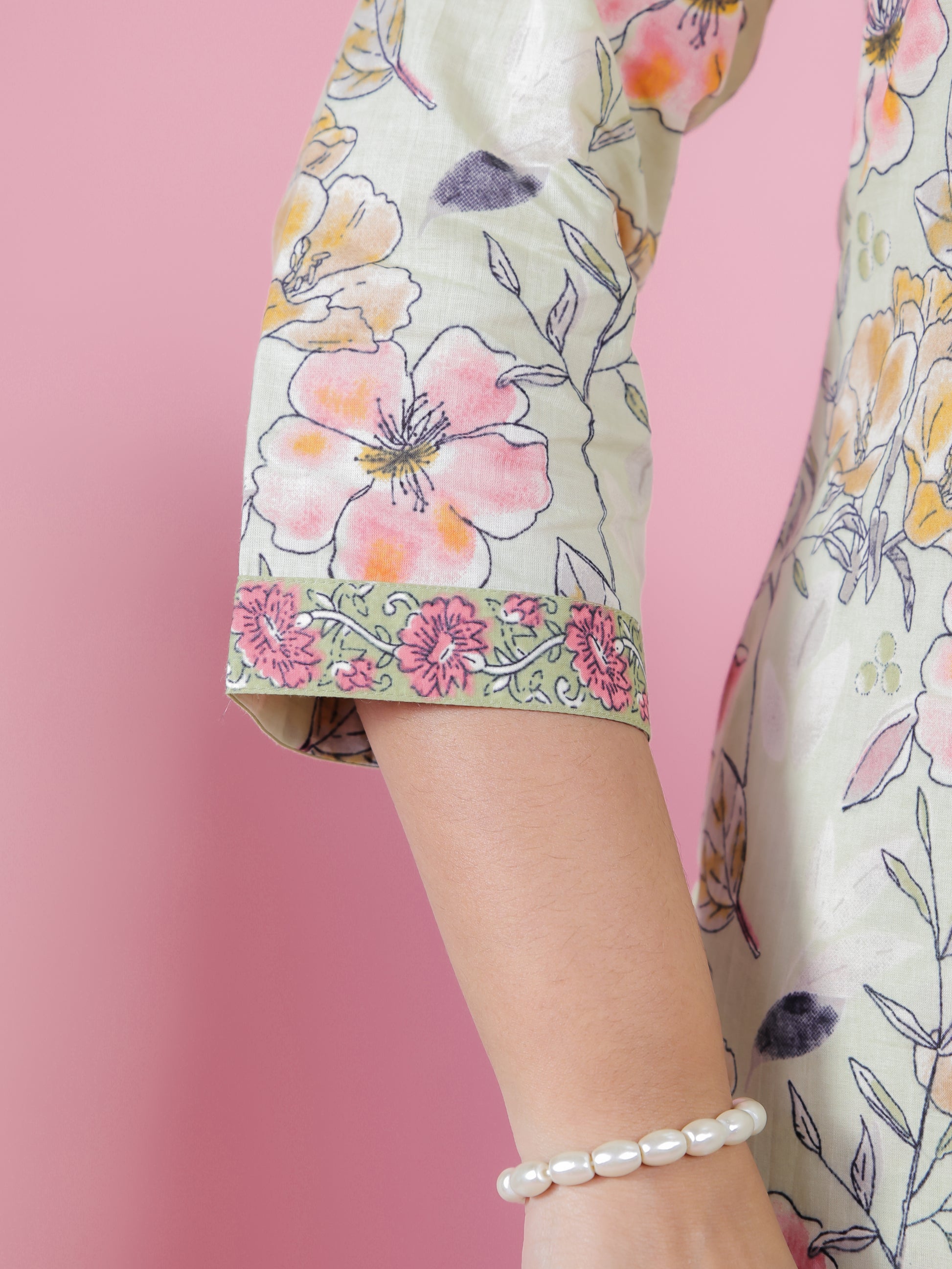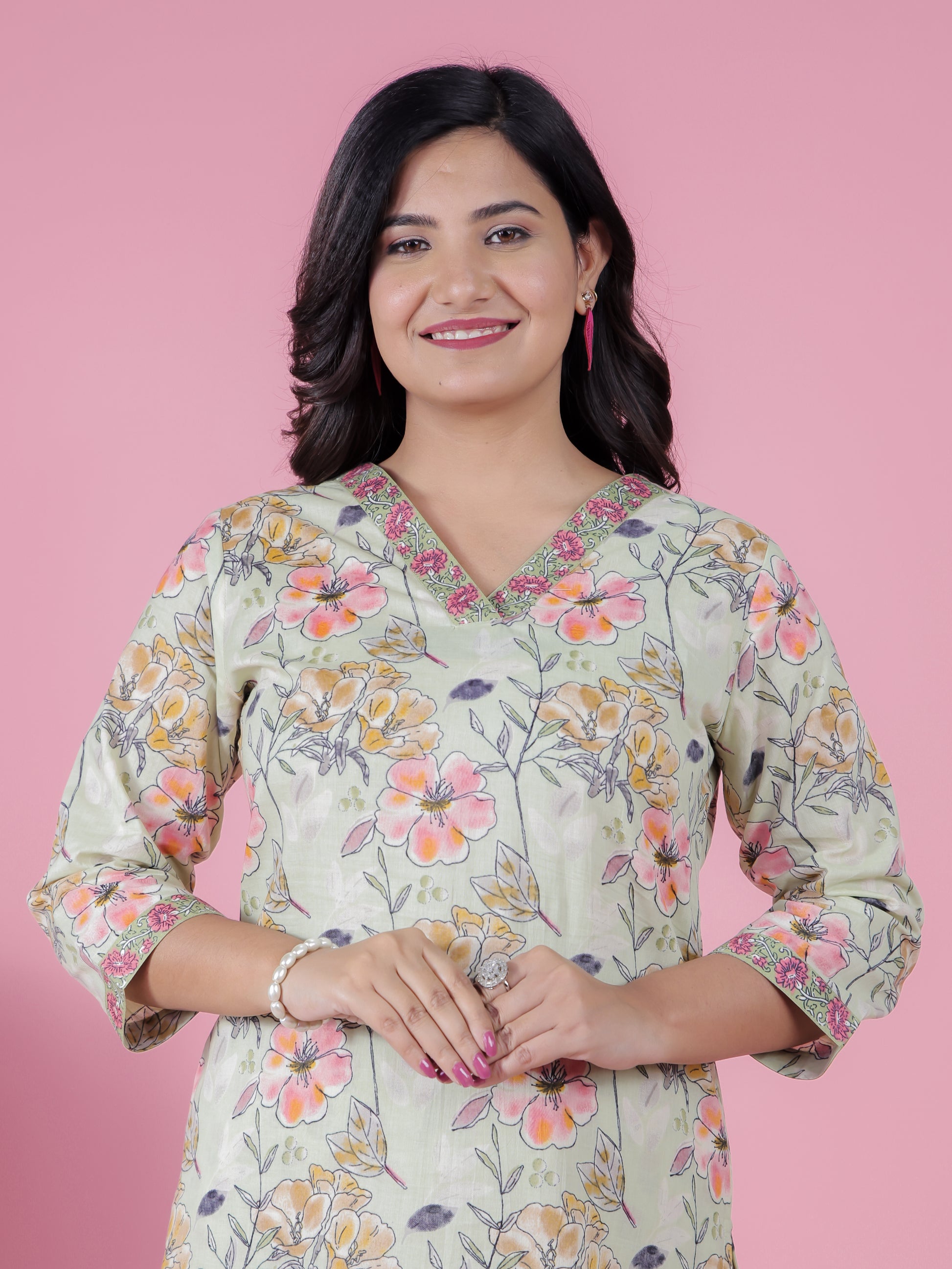 Crafted from breathable Soft Cotton, this Straight kurta in Green blends traditional design with everyday comfort. The Floral finish adds artisanal charm, while the Calf Length silhouette ensures effortless elegance. Style with palazzos or leggings for versatile looks, from workdays to weekend outings. Designed for easy care, this kurta stays beautiful with simple care instructions.