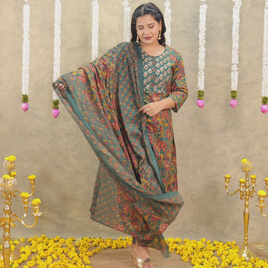 This Green Soft Cotton kurta with a Straight flare is designed for comfort and style. Featuring a Round neckline, 3/4 Sleeve sleeves, and a graceful Calf Length hemline, it’s perfect for festive wear or semi-formal gatherings. The Floral highlights add depth and texture, making it a standout piece. Accessorise with a contrasting dupatta and keep it pristine by following proper care instructions.