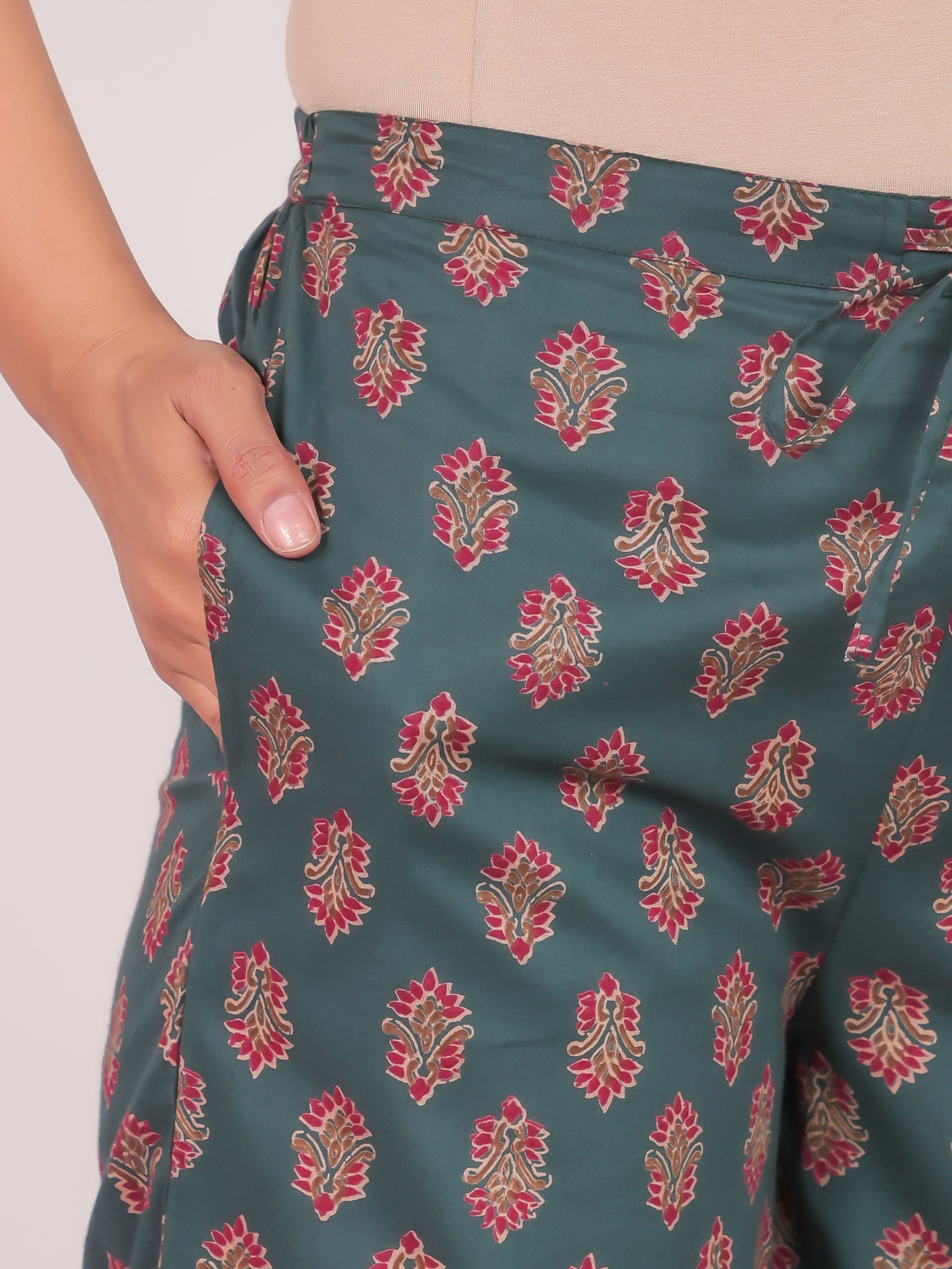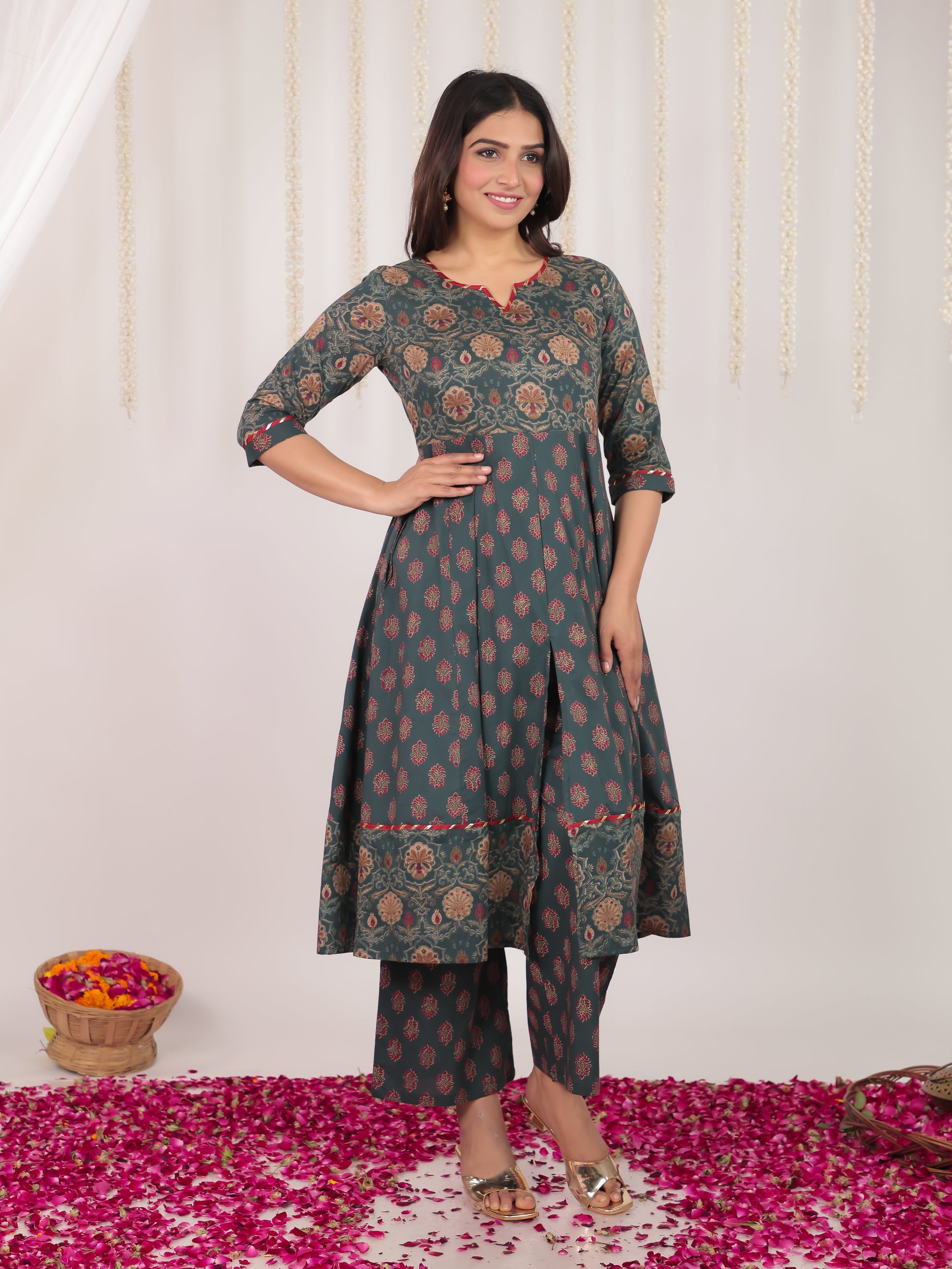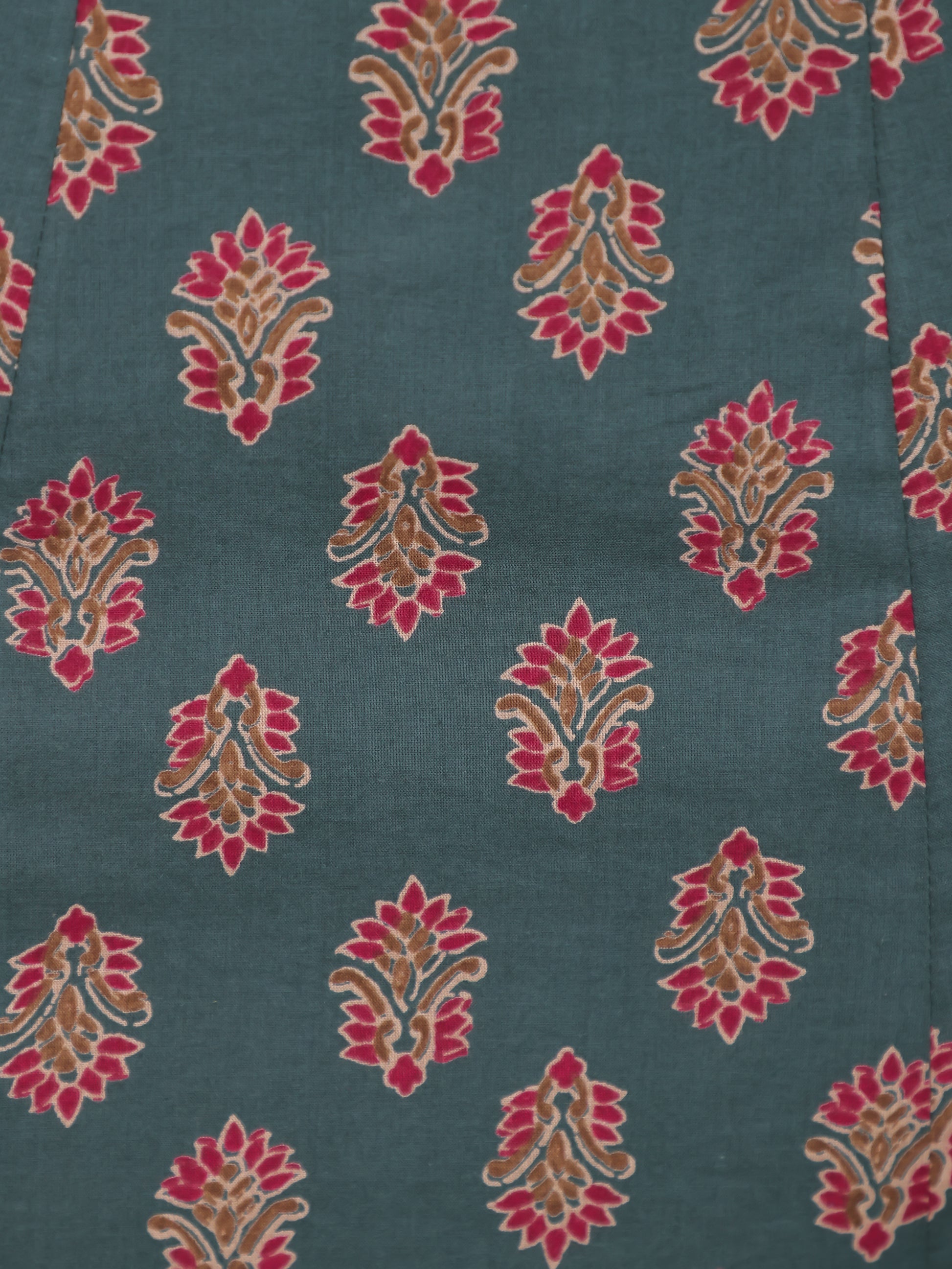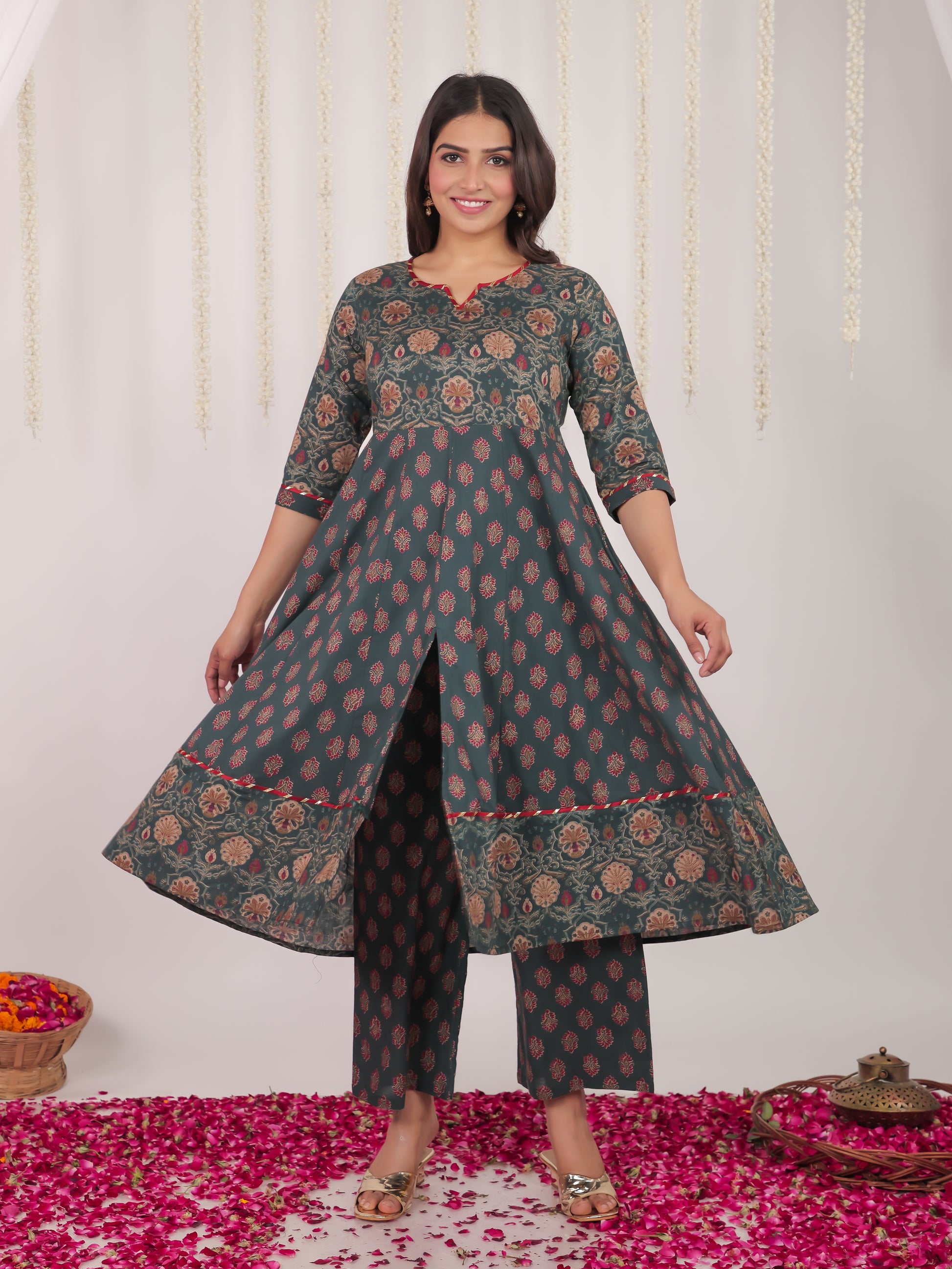 Crafted from breathable Soft Cotton, this Anarkali kurta in Green blends traditional design with everyday comfort. The Geometric finish adds artisanal charm, while the Calf Length silhouette ensures effortless elegance. Style with palazzos or leggings for versatile looks, from workdays to weekend outings. Designed for easy care, this kurta stays beautiful with simple care instructions.