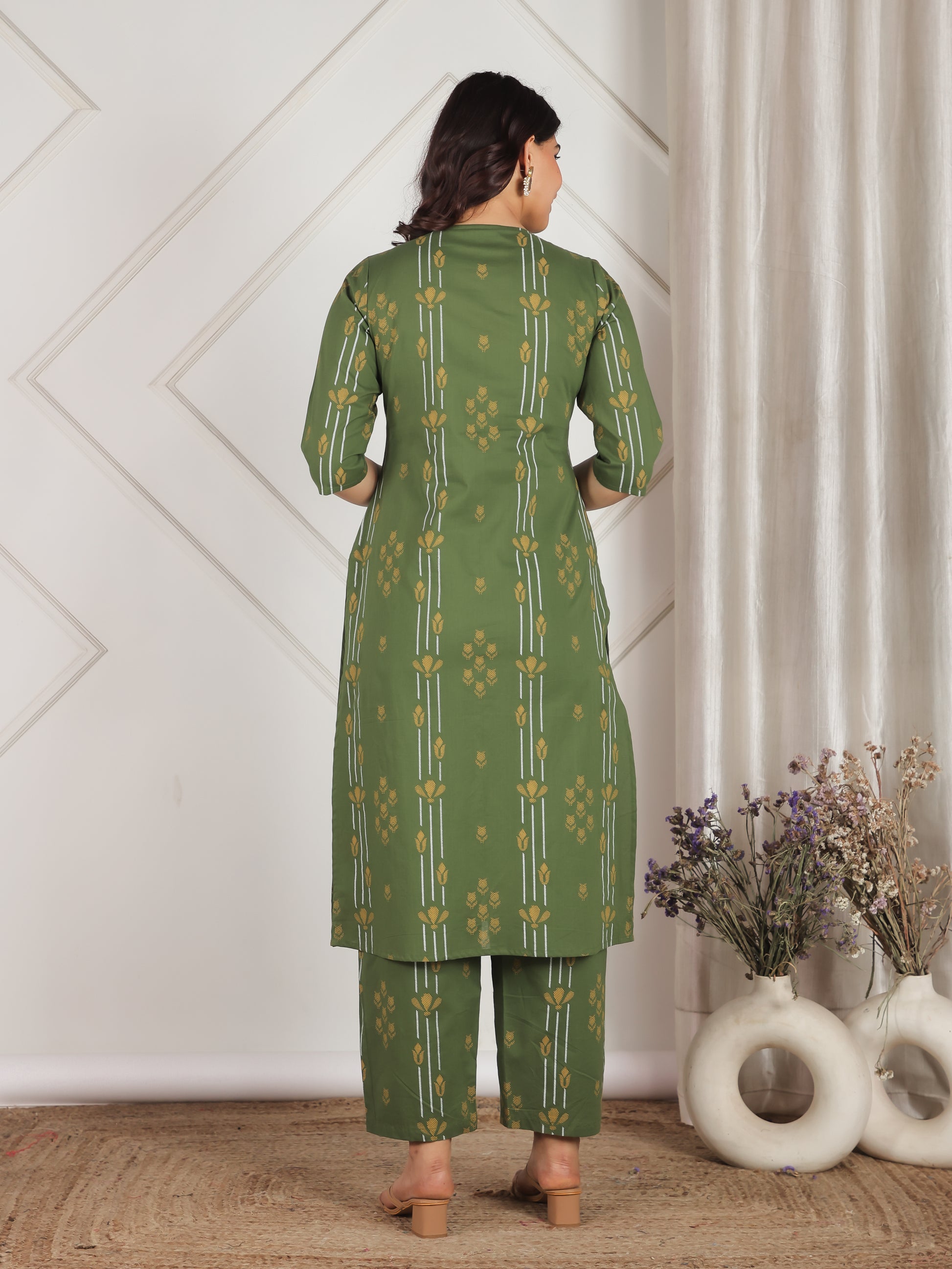 This Green Soft Cotton kurta with a Straight flare is designed for comfort and style. Featuring a Round neckline, 3/4 Sleeve sleeves, and a graceful Calf Length hemline, it’s perfect for festive wear or semi-formal gatherings. The Geometric highlights add depth and texture, making it a standout piece. Accessorise with a contrasting dupatta and keep it pristine by following proper care instructions.