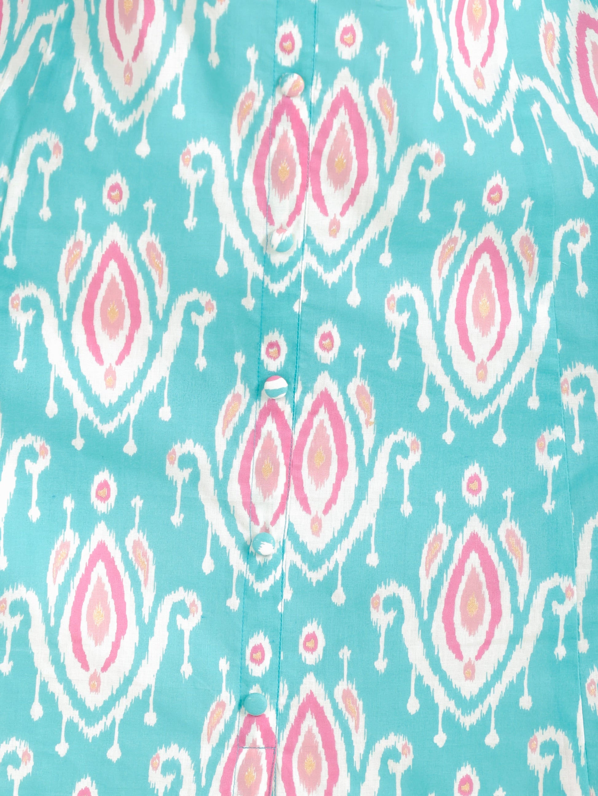 Make a stylish statement with this green a-line kurta made from premium soft cotton. Featuring a sophisticated round neck and eye-catching ikat design. The decorative button work adds functional elegance to the design. The subtle a-line flare adds feminine grace while ensuring easy movement. This calf length kurta features 3/4 sleeve that provide a balanced look. Suitable for daily wear or casual outings, and easily maintained with machine wash.