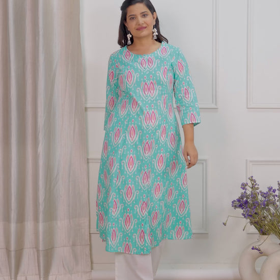 Soft Cotton Ikat A-line Green Kurta