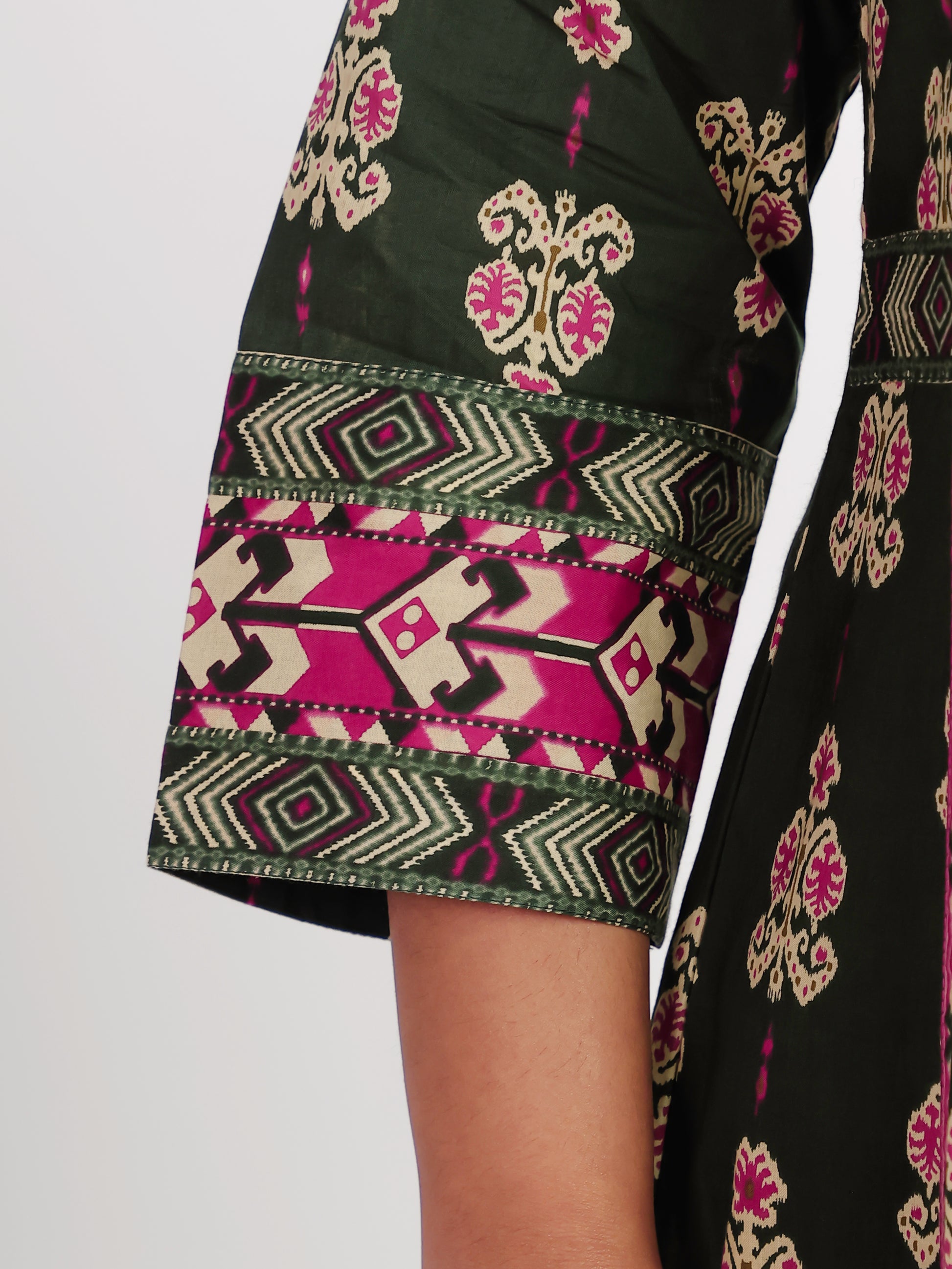 Elevate your ethnic wardrobe with this Soft Cotton kurta in a stunning Green hue. Featuring an elegant Anarkali fit and striking Ikat accents, it’s perfect for festive celebrations or family gatherings. The Keyhole neckline and 3/4 Sleeve provide all-day comfort. Team with gold-toned accessories for an effortlessly chic vibe. Maintain its charm by following proper care instructions.