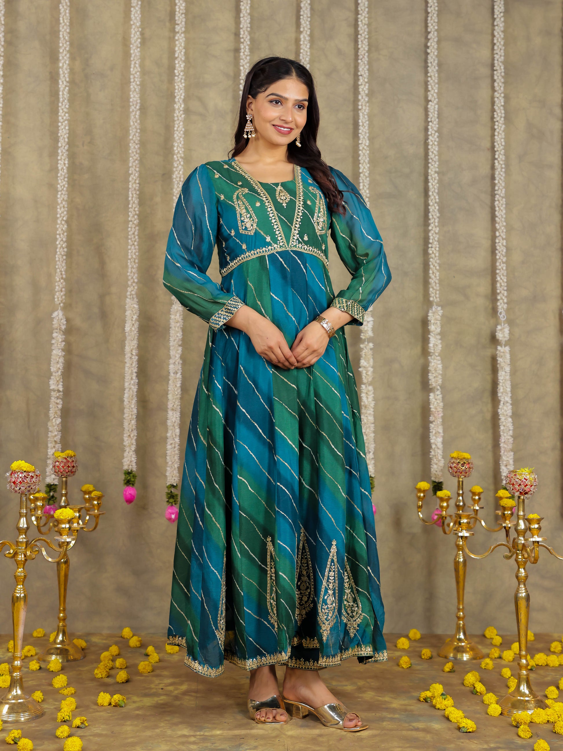 Embroidered Romen silk Leheriya Green Kurta