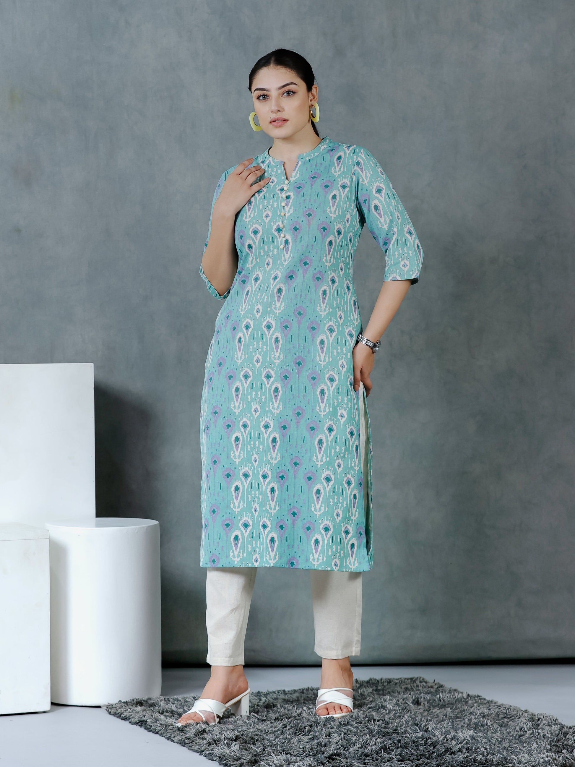 This Green Straight kurta in soft Linen Cotton is a timeless pick for festive and casual wear. Designed with a Mandarin Collar neckline and 3/4 Sleeve sleeves, its graceful Calf Length cut flatters all body types. The delicate Paisley detailing adds a touch of sophistication. Pair it with statement earrings and juttis for a polished look. Maintain its pristine look by following proper care instructions.
