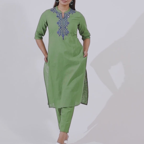 Embroidered Natural Cotton Solid Straight Green Kurta