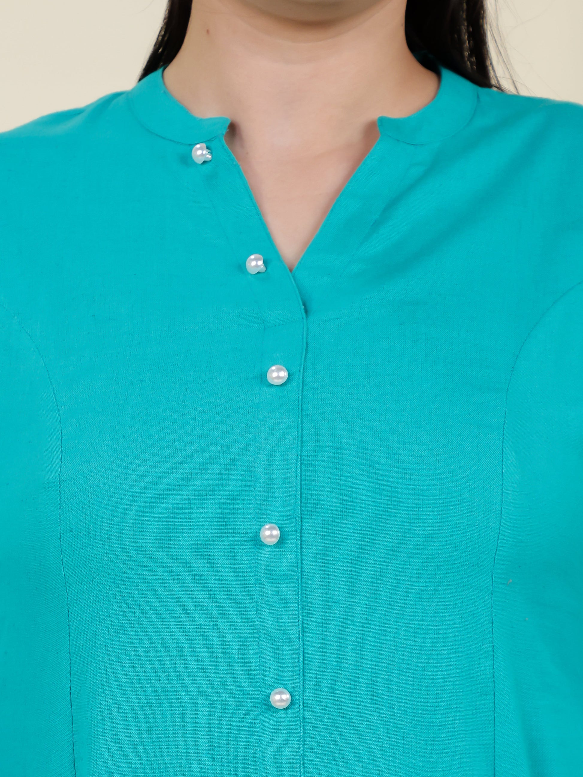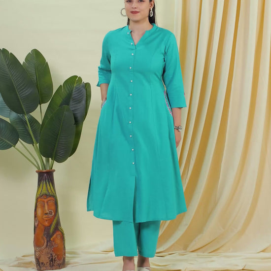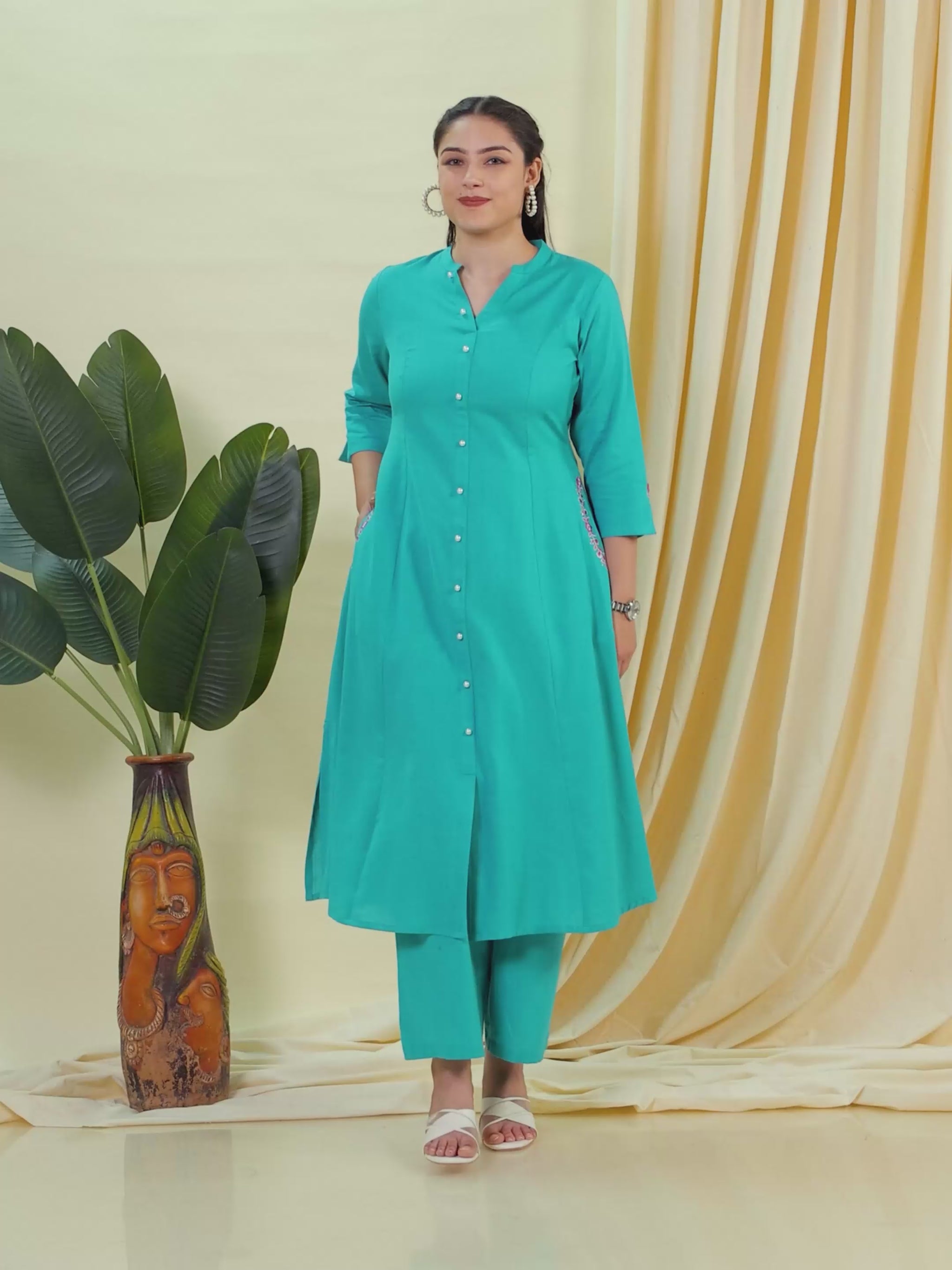 Embroidered Linen Cotton Solid Flared Green Kurta