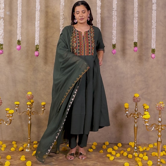 This green solid kurta & trousers offers the perfect blend of comfort and style. This round neckline creates a soft, feminine finish to the design. Complemented by sleek trousers that provide a modern alternative to traditional bottoms. The exquisite thread work adds a touch of sophistication to this ensemble. This magnificent anarkali style kurta creates a statement-making silhouette that commands attention. The calf length paired with 3/4 sleeve creates a proportioned silhouette. Versatile enough for daily wear or special occasions, and conveniently machine wash.