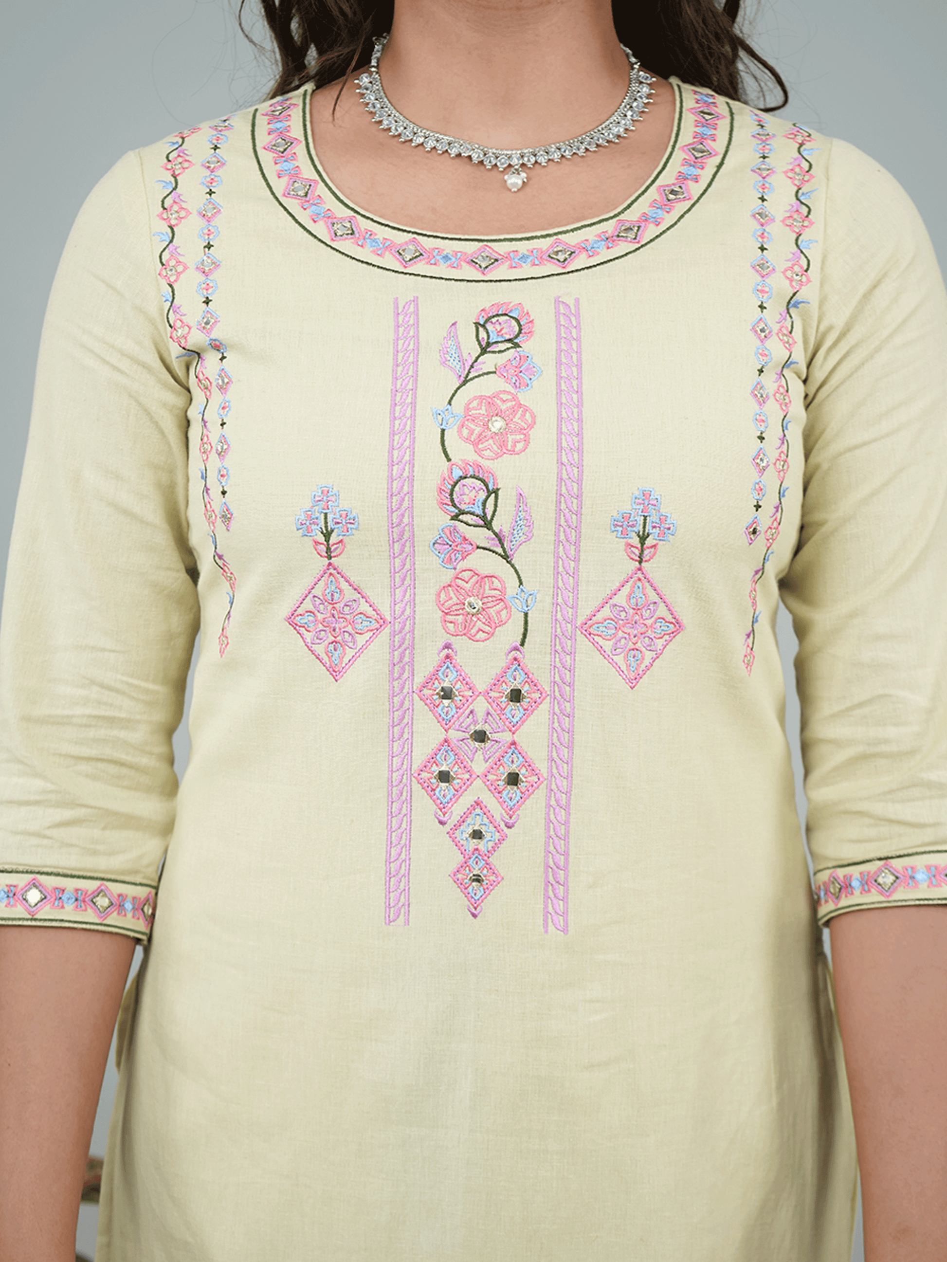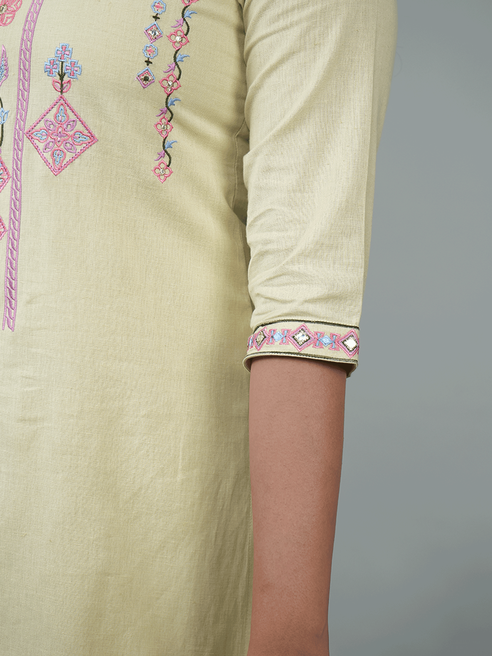 Embroidered Linen Cotton Solid Straight Green Kurta