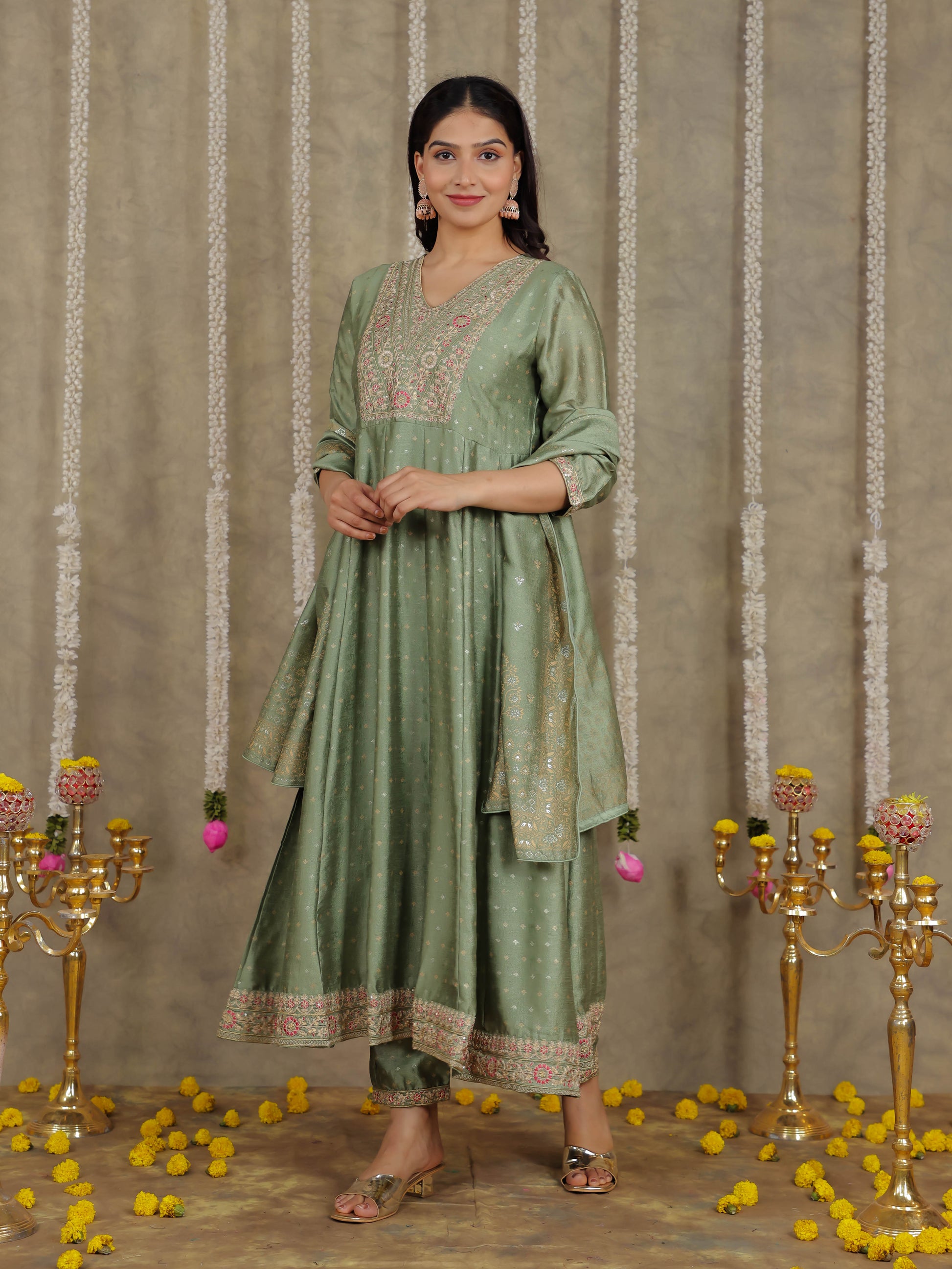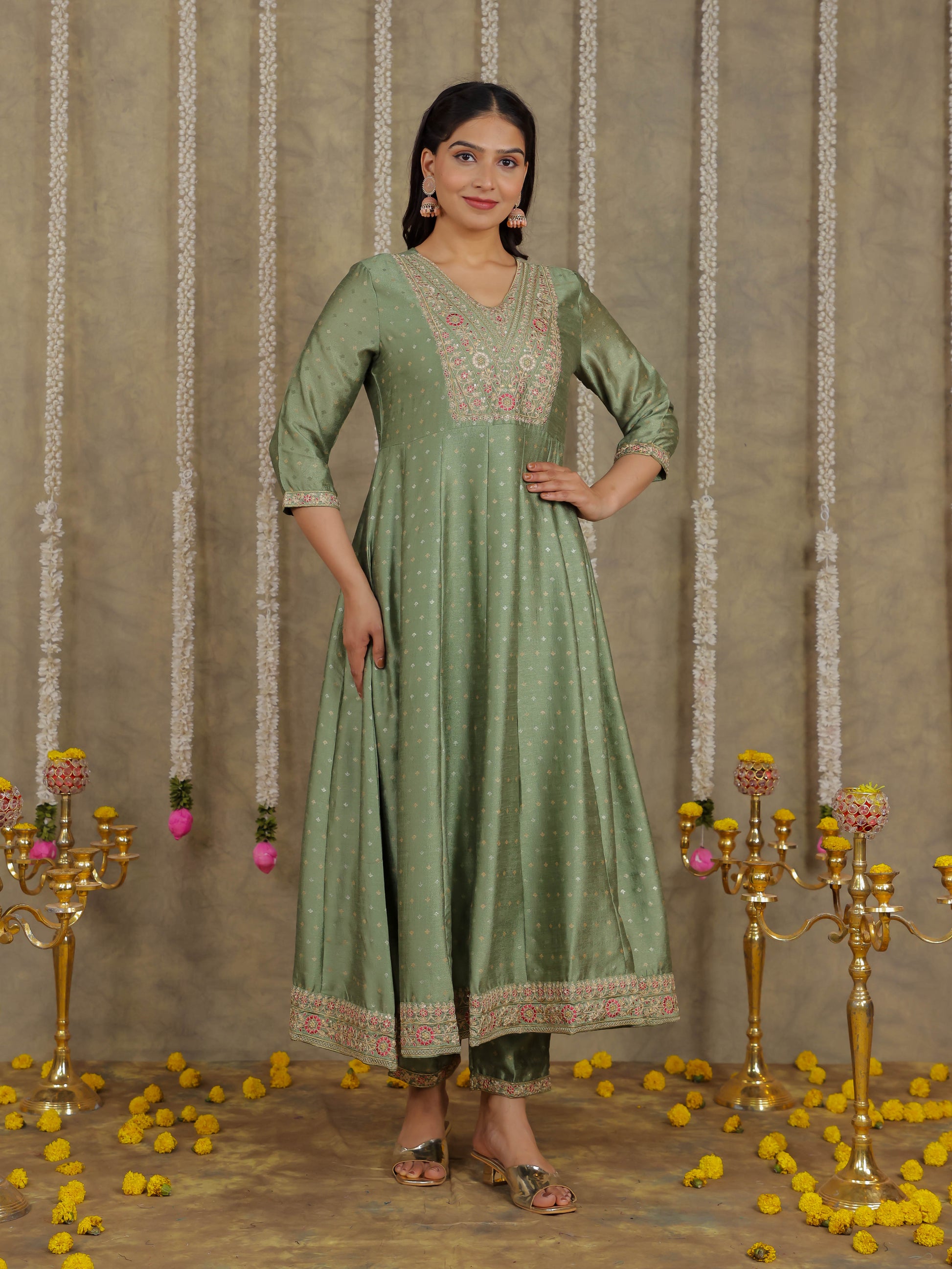Embroidered Self Design Chanderi Solid Green Kurta