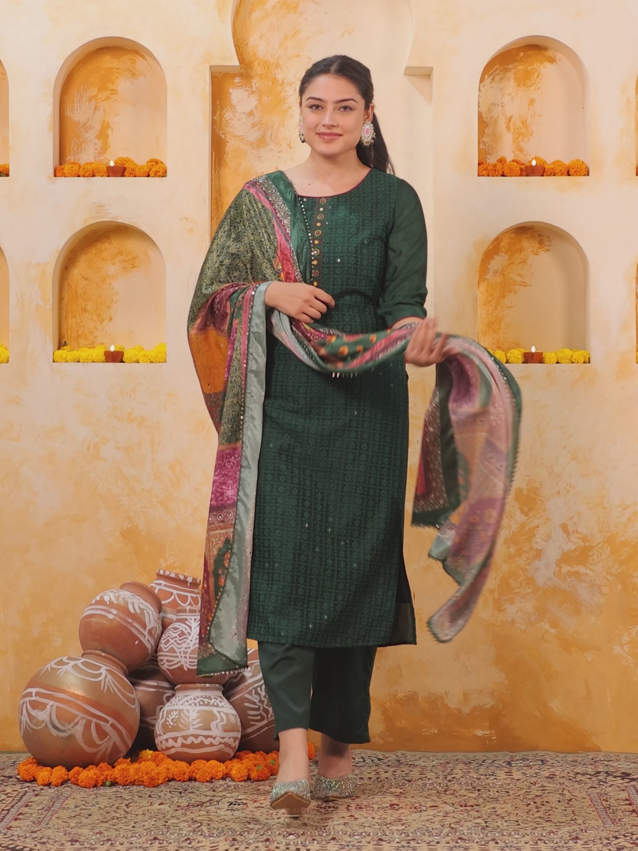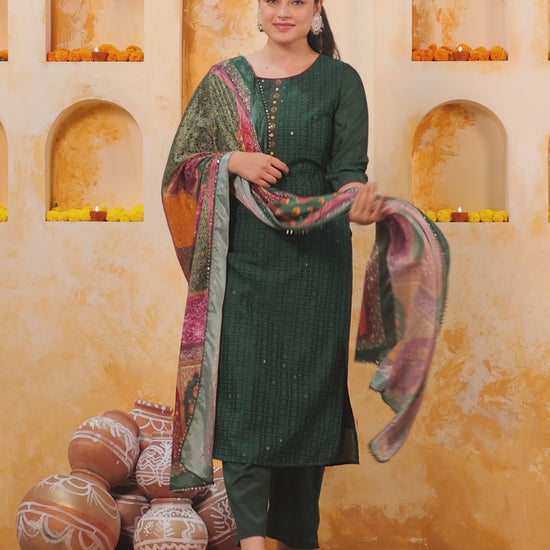 Embroidered Self Design Chanderi Solid Straight Green Kurta