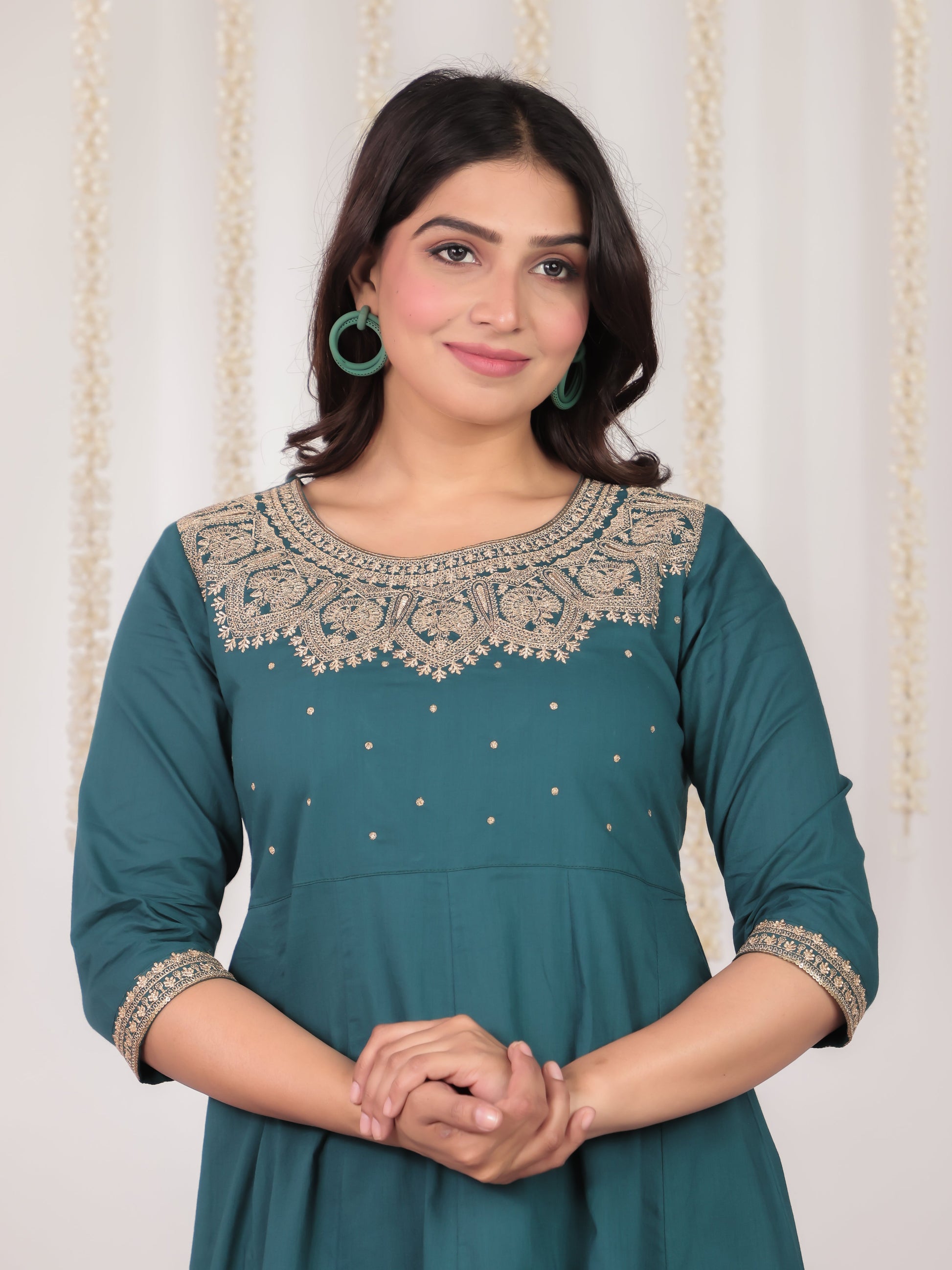 This Green Flared kurta in soft Soft Cotton is a timeless pick for festive and casual wear. Designed with a V neckline and 3/4 Sleeve sleeves, its graceful Calf Length cut flatters all body types. The delicate Solid detailing adds a touch of sophistication. Pair it with statement earrings and juttis for a polished look. Maintain its pristine look by following proper care instructions.