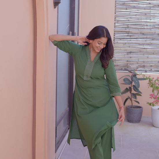 Crafted from breathable Soft Cotton, this Straight kurta in Green blends traditional design with everyday comfort. The Solid finish adds artisanal charm, while the Calf Length silhouette ensures effortless elegance. Style with palazzos or leggings for versatile looks, from workdays to weekend outings. Designed for easy care, this kurta stays beautiful with simple care instructions.