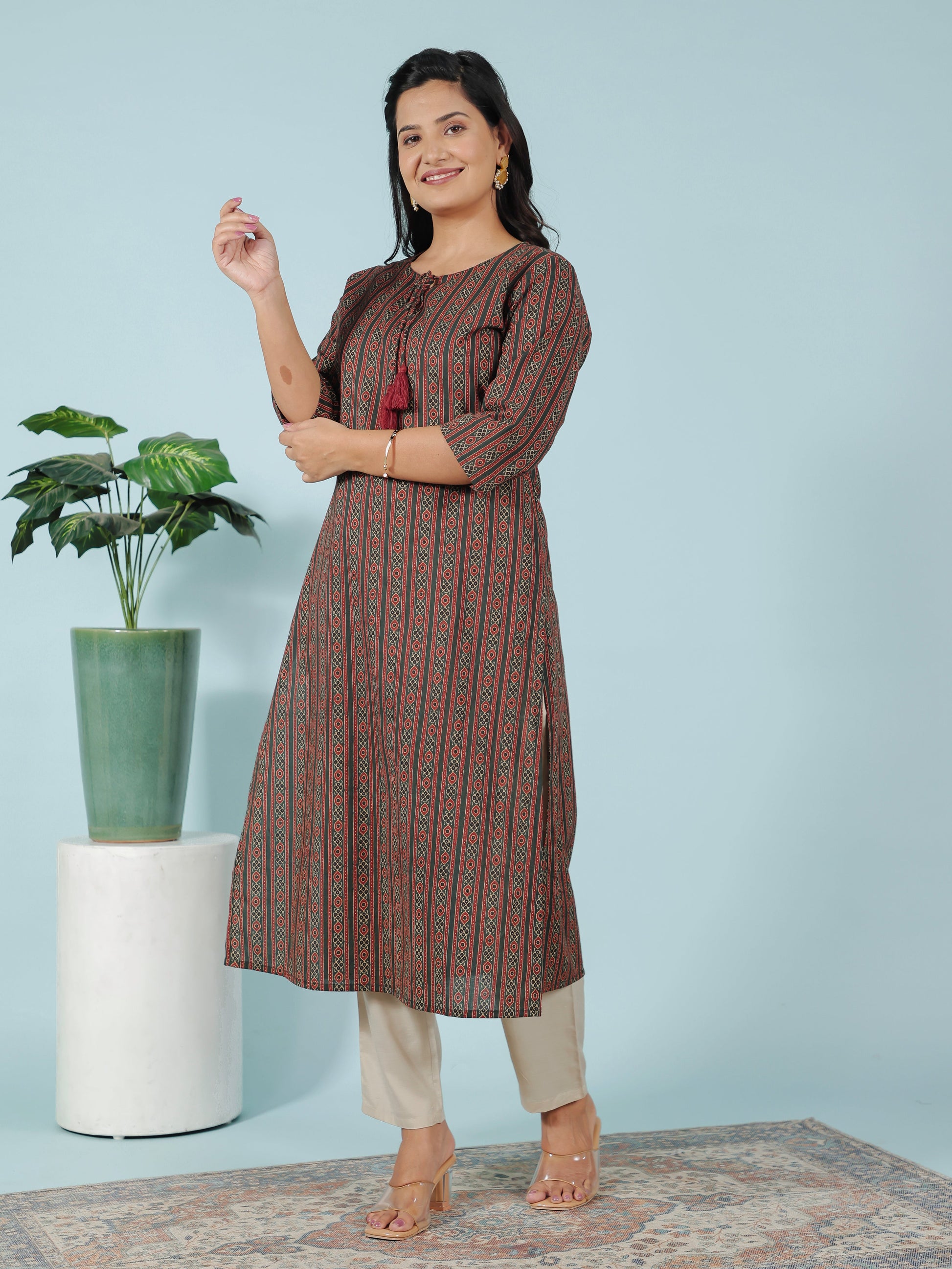 This Green Straight kurta in soft Soft Cotton is a timeless pick for festive and casual wear. Designed with a Round neckline and 3/4 Sleeve sleeves, its graceful Calf Length cut flatters all body types. The delicate Striped detailing adds a touch of sophistication. Pair it with statement earrings and juttis for a polished look. Maintain its pristine look by following proper care instructions.