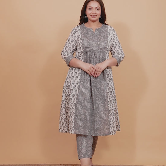 This Grey Lurex Cotton kurta with a Panelled flare is designed for comfort and style. Featuring a Round neckline, 3/4 Sleeve sleeves, and a graceful Calf Length hemline, it’s perfect for festive wear or semi-formal gatherings. The Block highlights add depth and texture, making it a standout piece. Accessorise with a contrasting dupatta and keep it pristine by following proper care instructions.