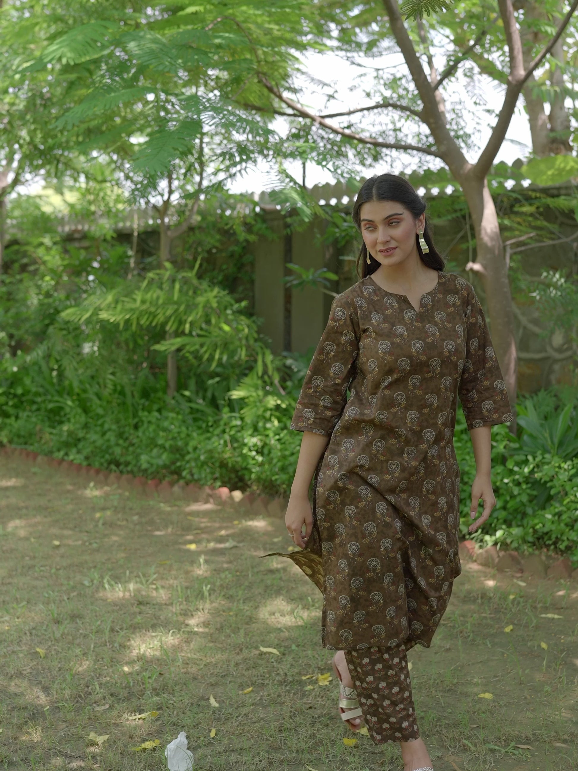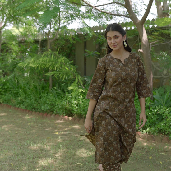 This Brown Soft Cotton kurta with a Straight flare is designed for comfort and style. Featuring a Round neckline, 3/4 Sleeve sleeves, and a graceful Calf Length hemline, it’s perfect for festive wear or semi-formal gatherings. The Floral highlights add depth and texture, making it a standout piece. Accessorise with a contrasting dupatta and keep it pristine by following proper care instructions.